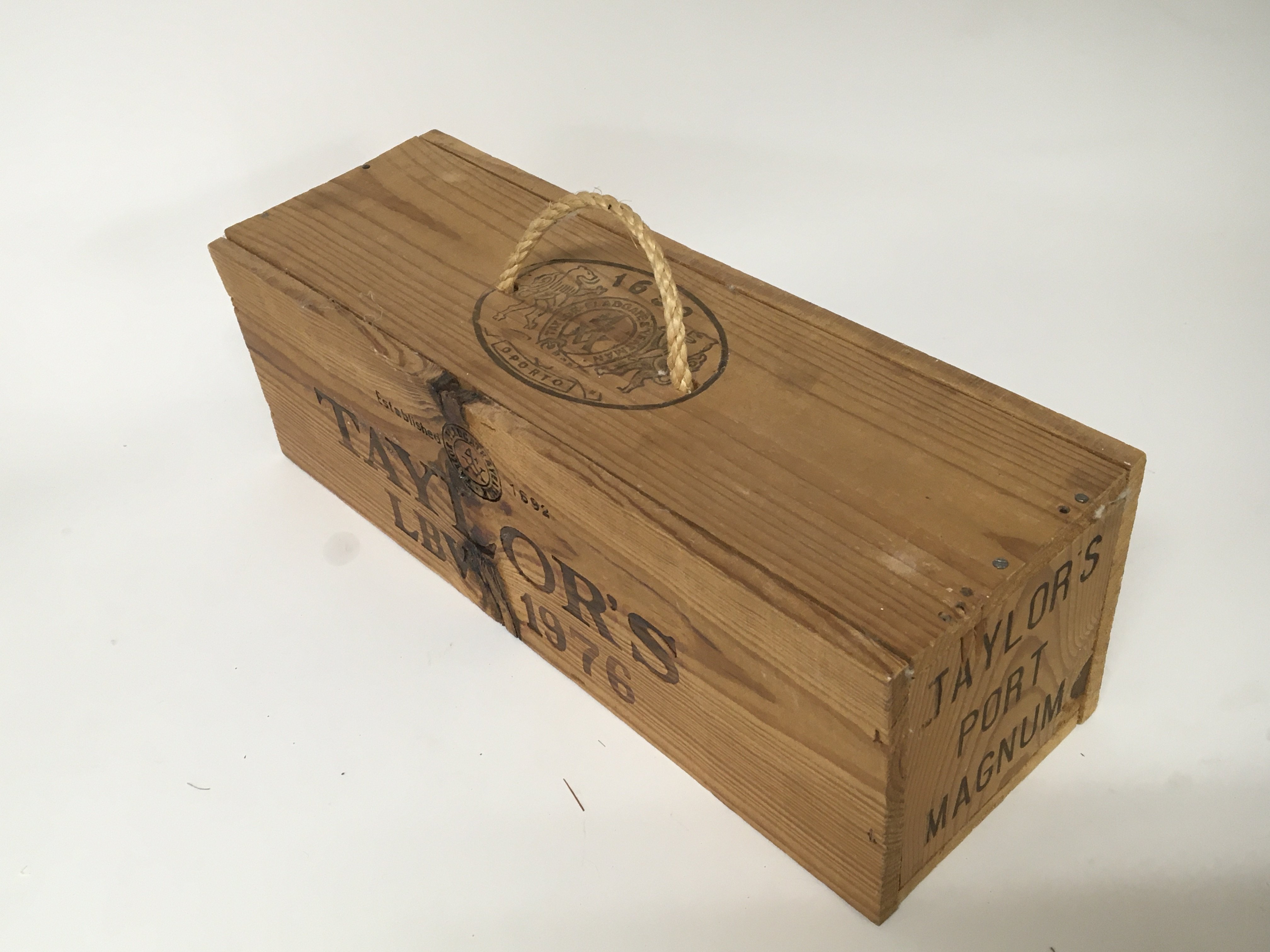 A 1976 Vintage bottle of Taylor’s Port Magnum sealed and unopened in a wooden casket.