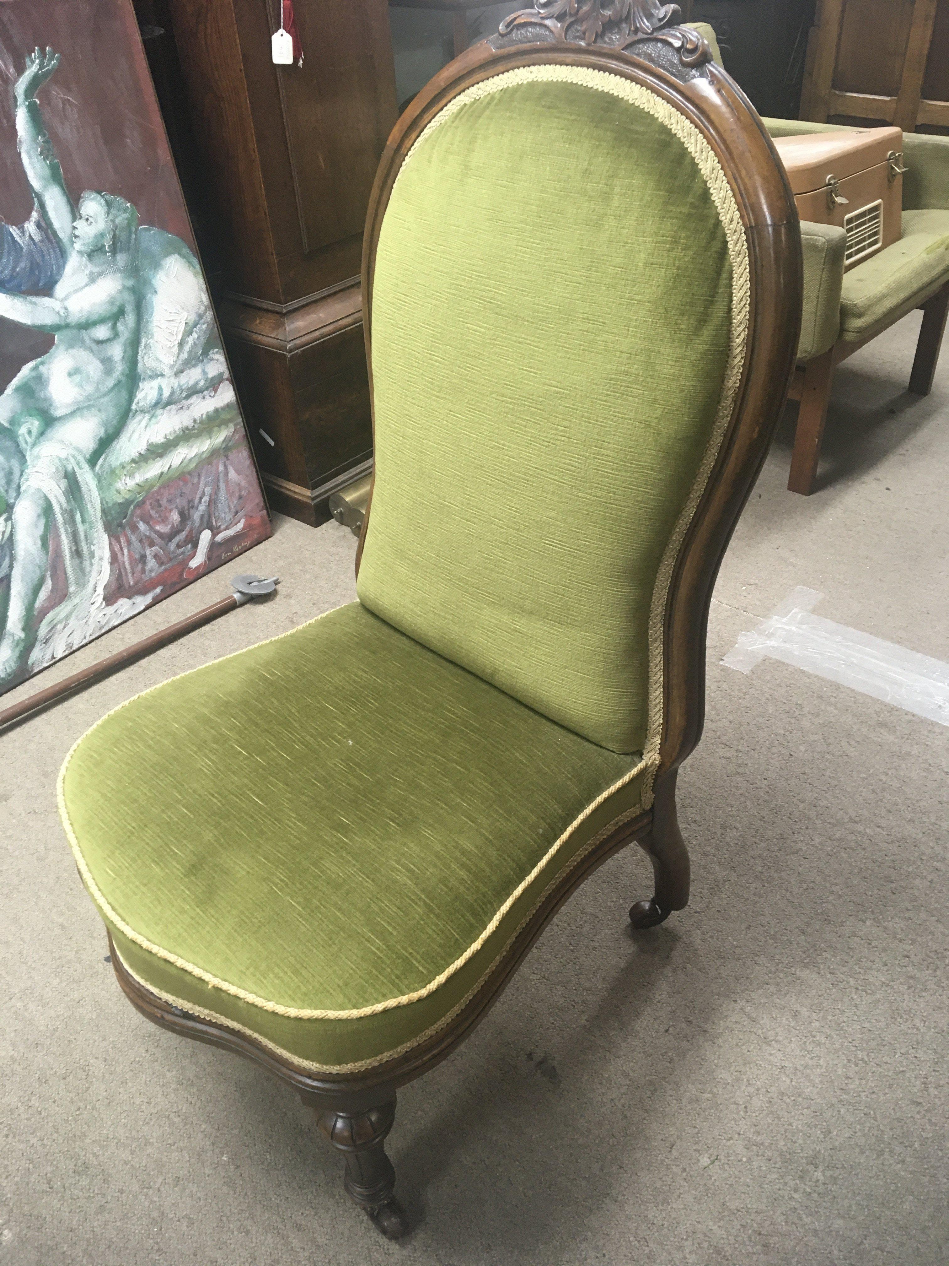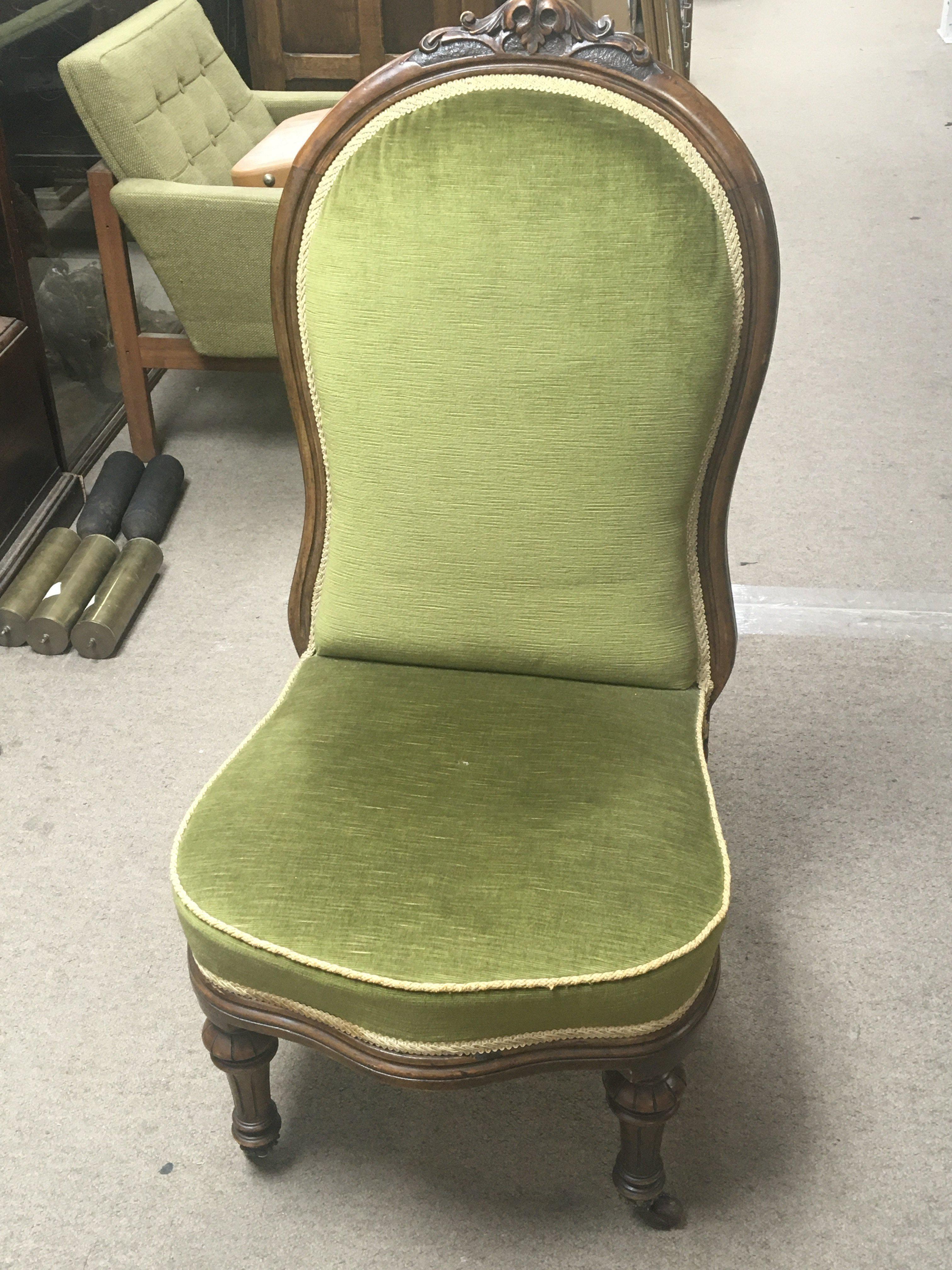 A Victorian walnut chair wit carved top rail and green upholstery on turned legs.