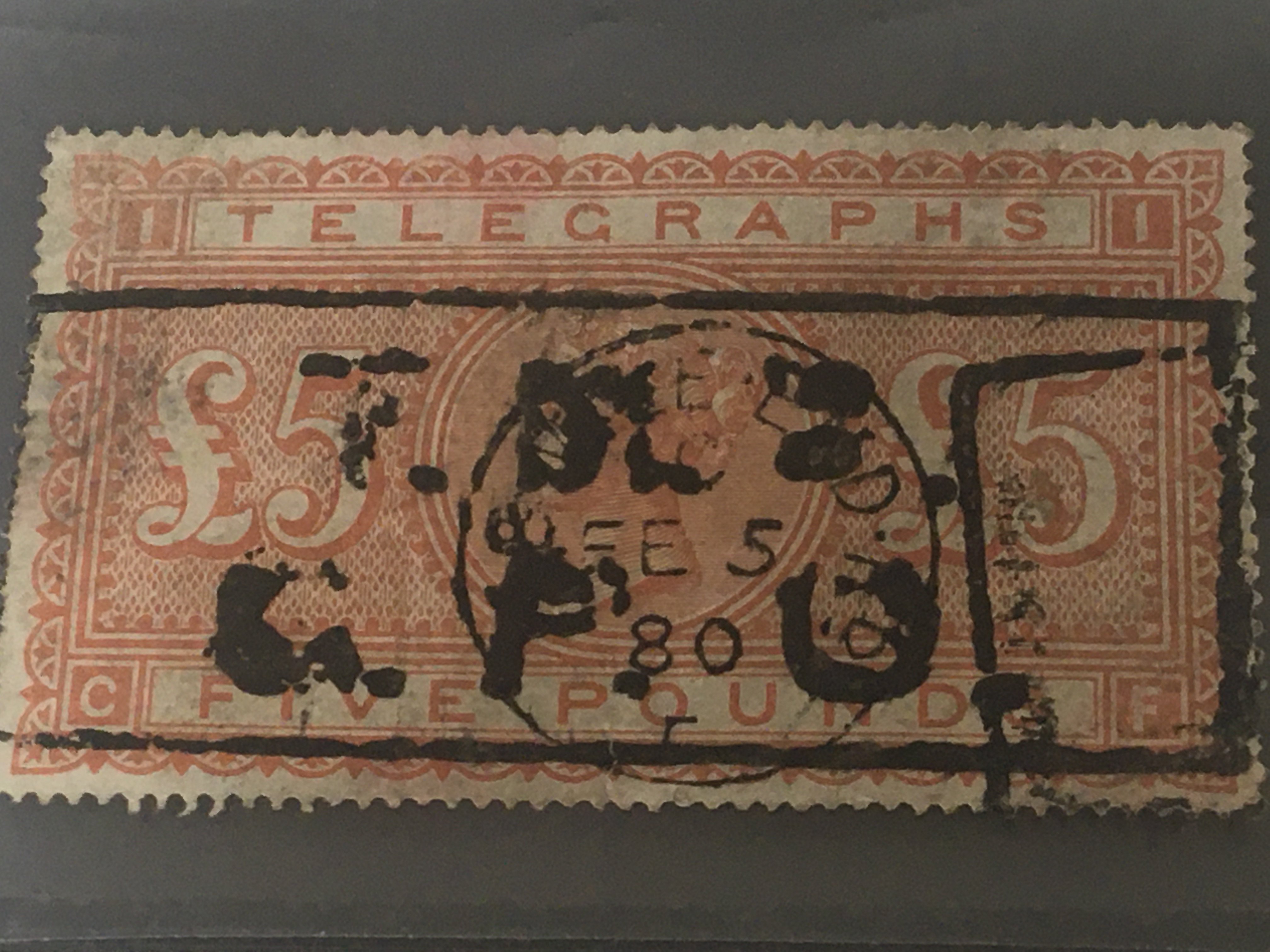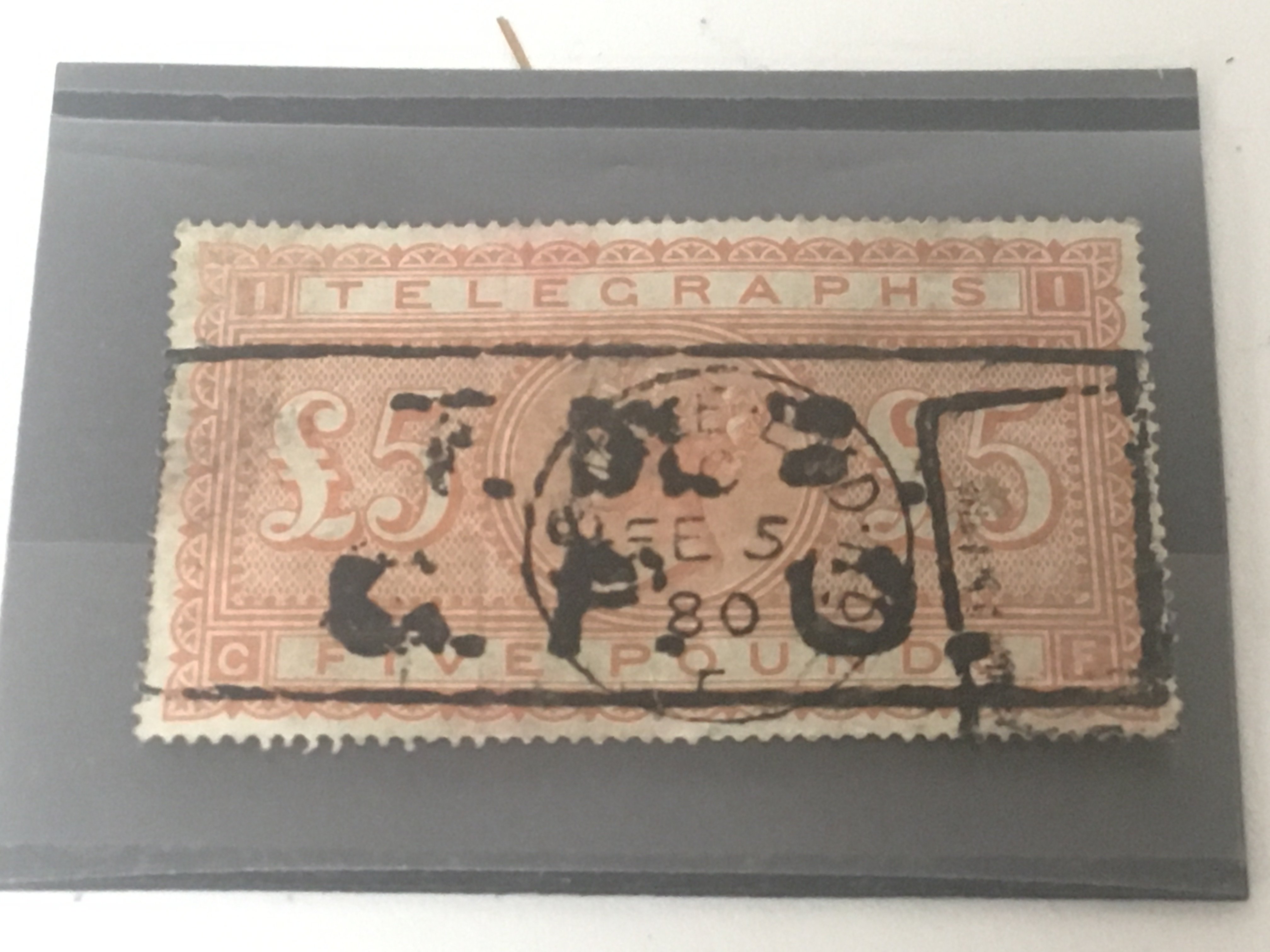 A Rare Victorian Telegraphs Five pound Orange Stamp. Over stamps in black ink.