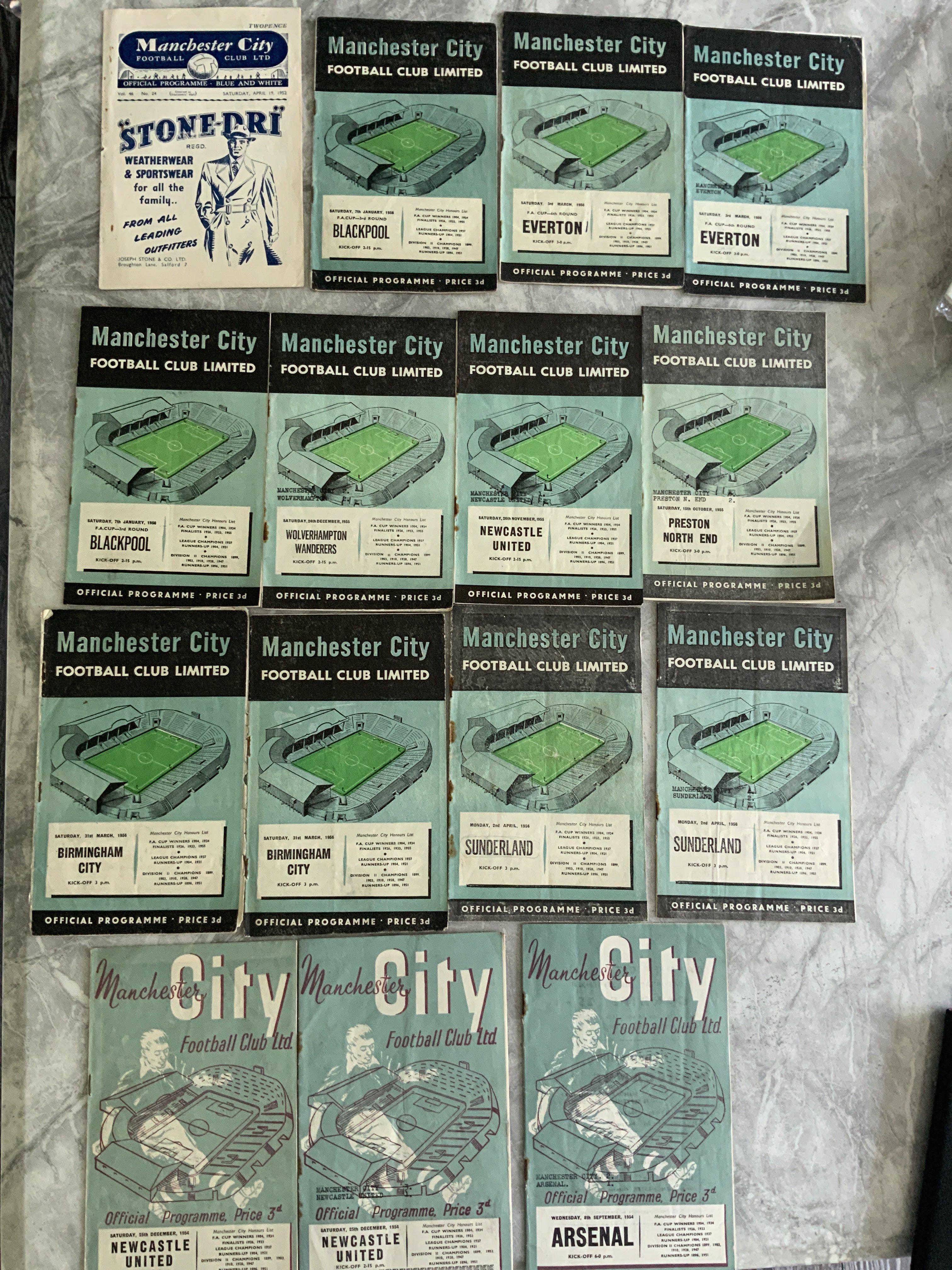 1950s Manchester City Home Football Programmes: 51/52 Bolton, 54/55 Arsenal, Newcastle. A further 10 from the FA Cup winning season of 55/56. Some duplication. Rusty staples. (15)