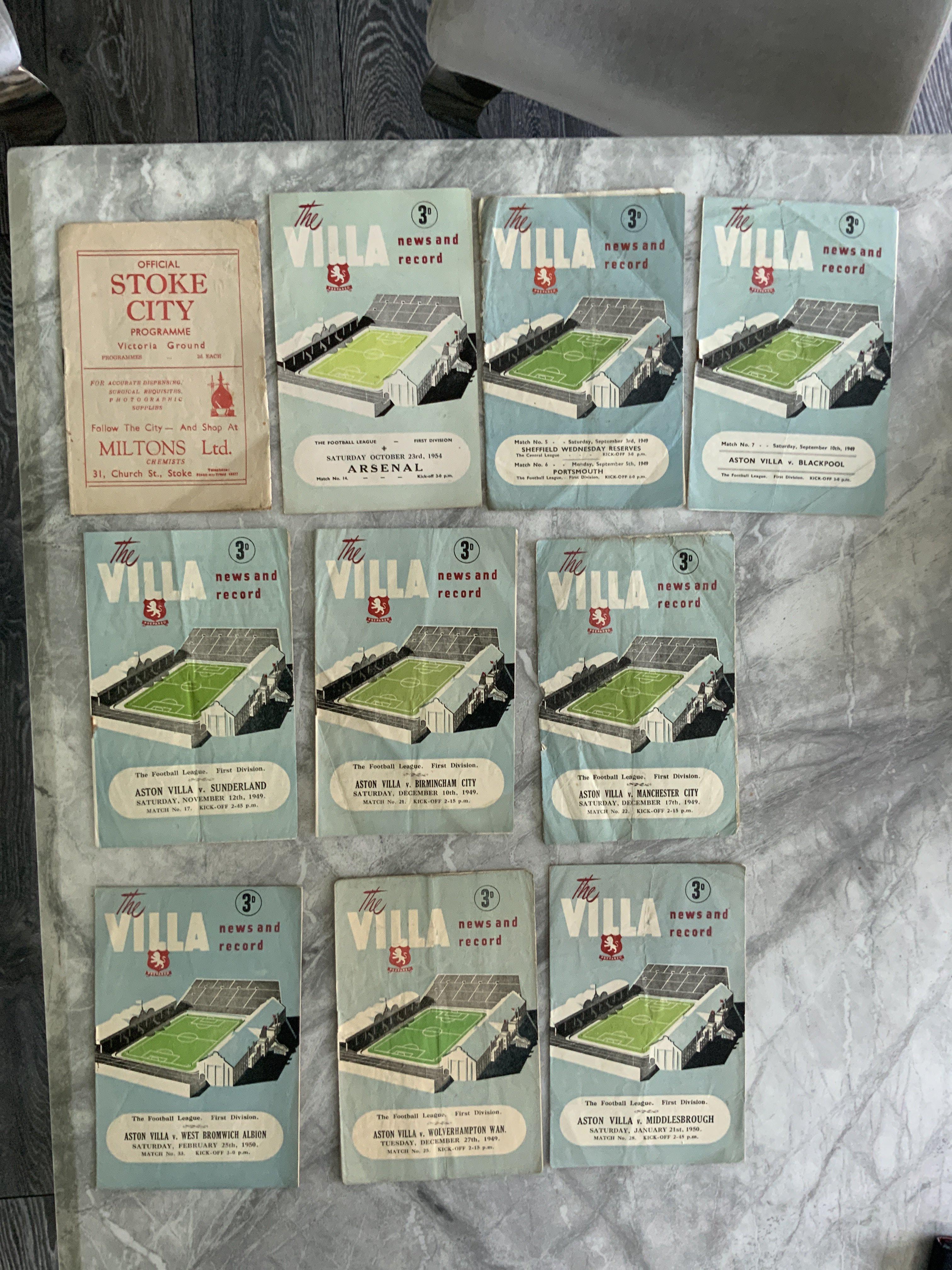 Aston Villa Football Programmes: 46/47 Stoke away plus 8 homes from 49/50 + 54/55 Arsenal. Good except 49/50 v Portsmouth. (10)