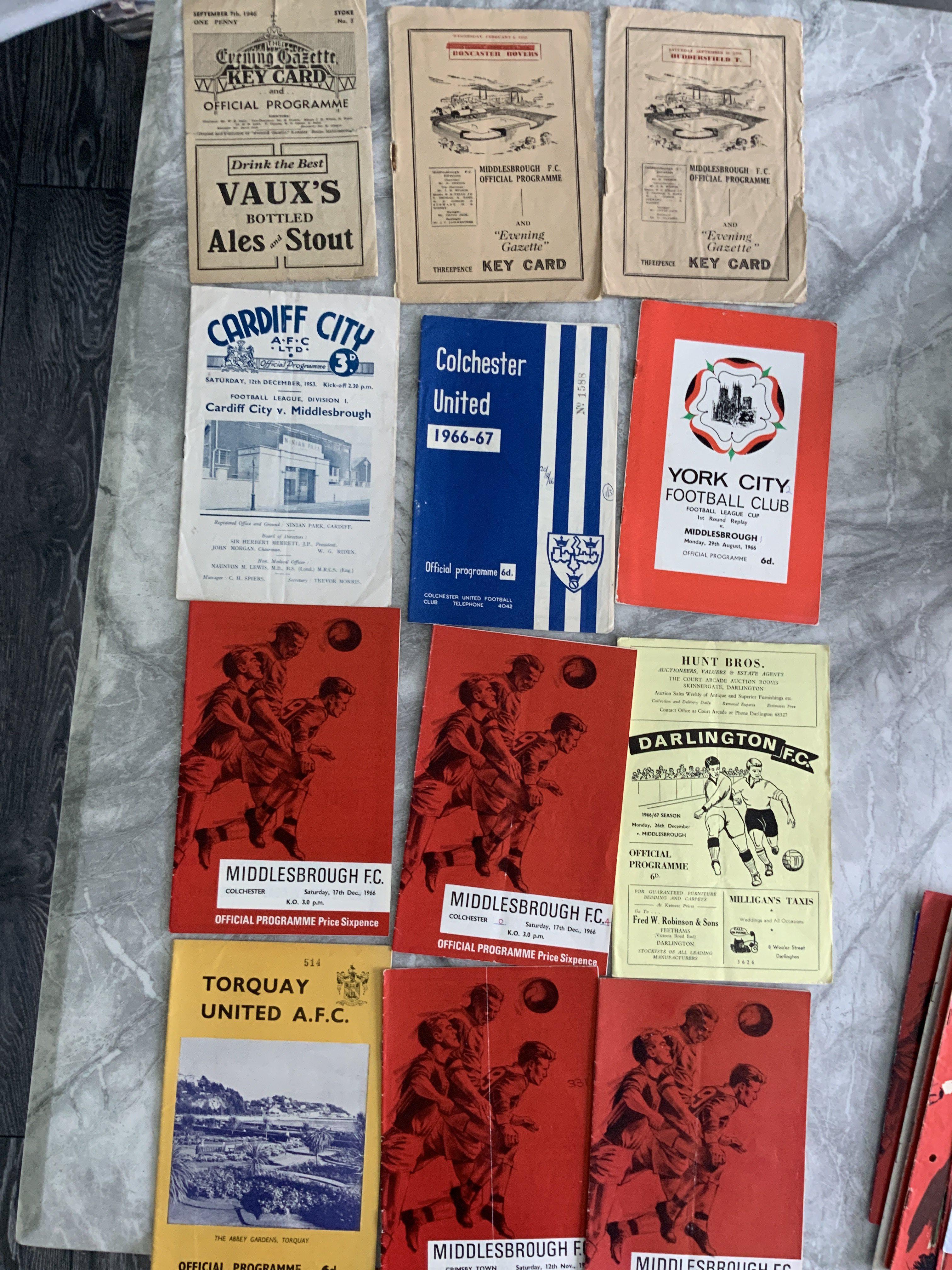 Middlesbrough Football Programmes: Homes include 46/47 Stoke tear, 50/51 Huddersfield, 51/52 Doncaster. Aways include 53/54 Cardiff. 11 home and away from 66/67 and some early 70s. Fair. (26)