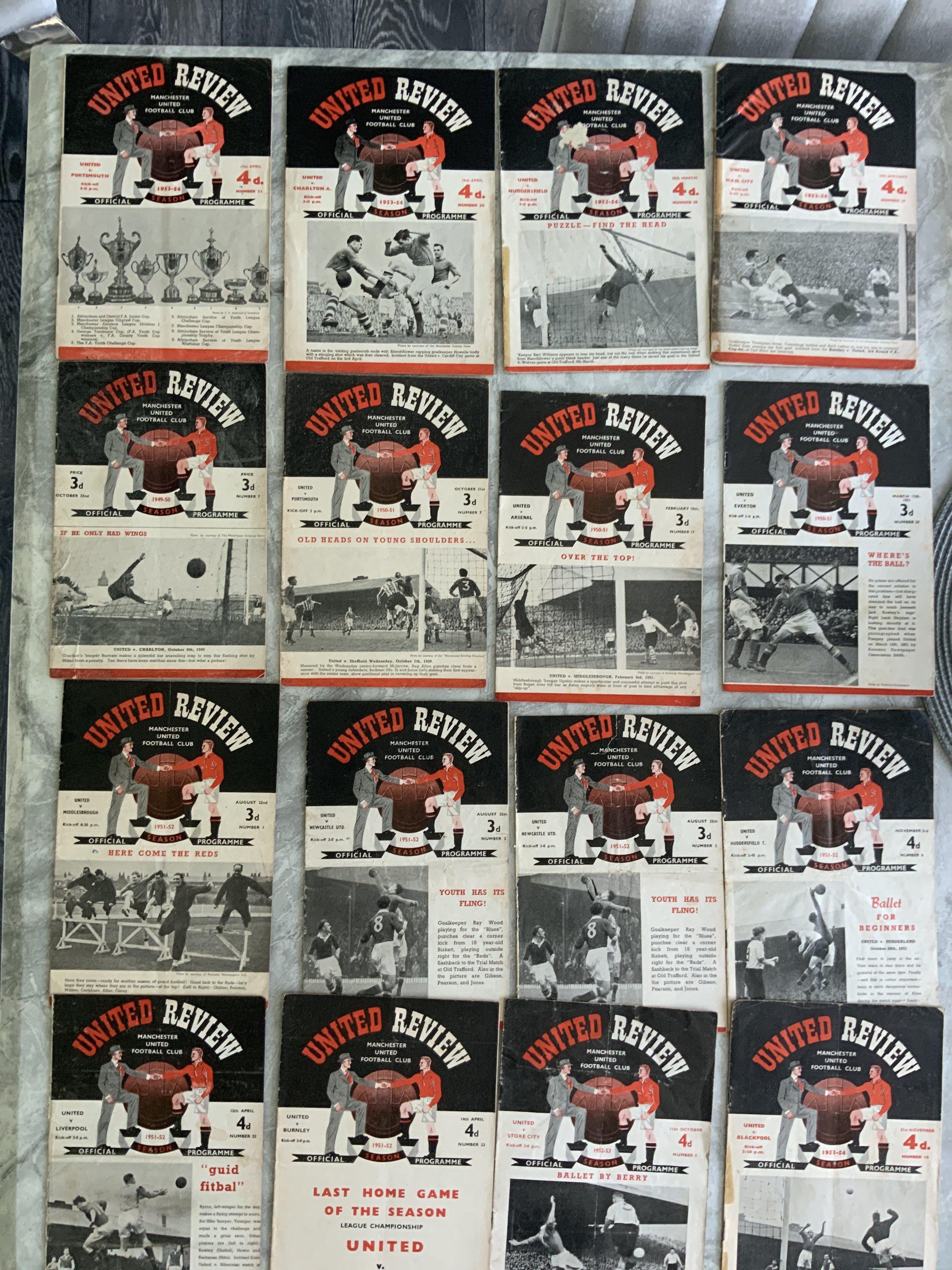Early 1950s Home Football Programmes: 49/50 Wolves, 50/51 Everton Arsenal Portsmouth, 51/52 Huddersfield Newcastle x 2 Burnley Liverpool Middlesbrough, 52/53 Stoke and 5 from 53/54. Mainly good. (16)