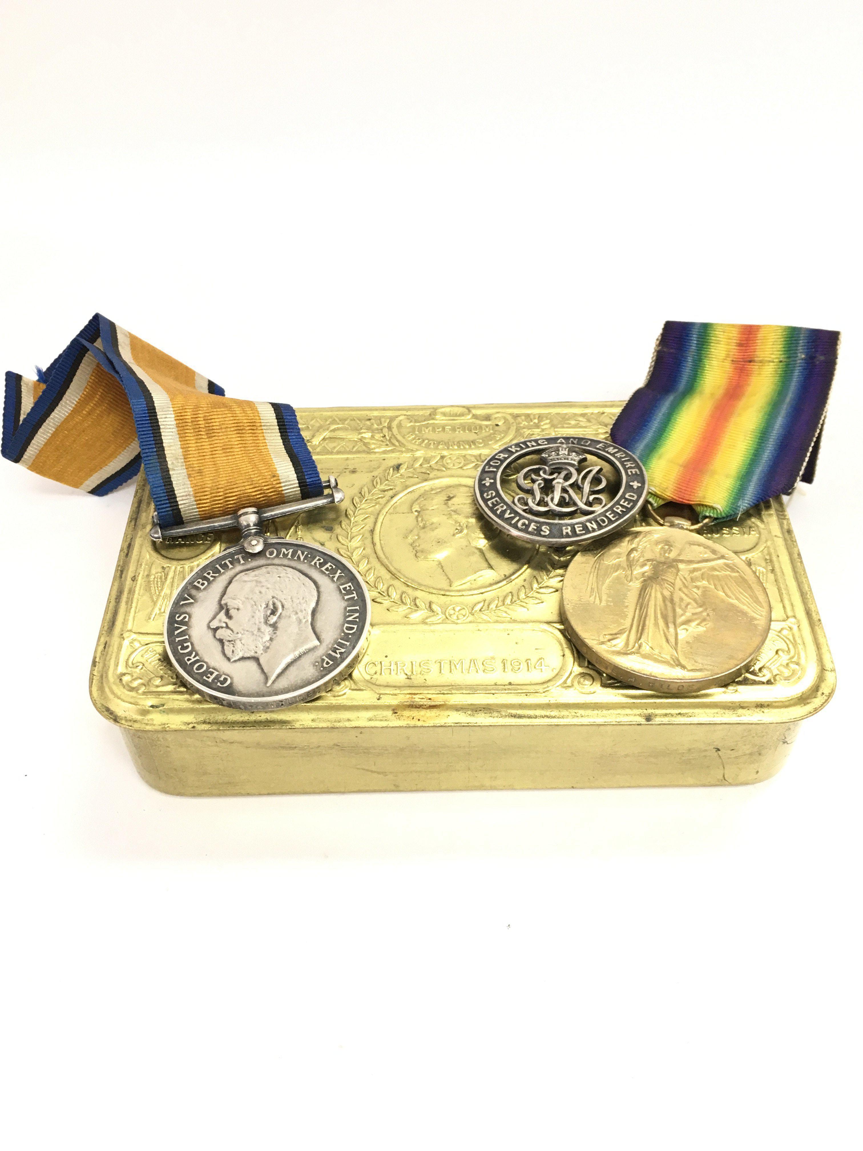WW1 War and Victory medals presented to PTE.H.WILDE.M.S.L.I., silver war badge together with Princess Mary 1914 gift tin. Postage category B