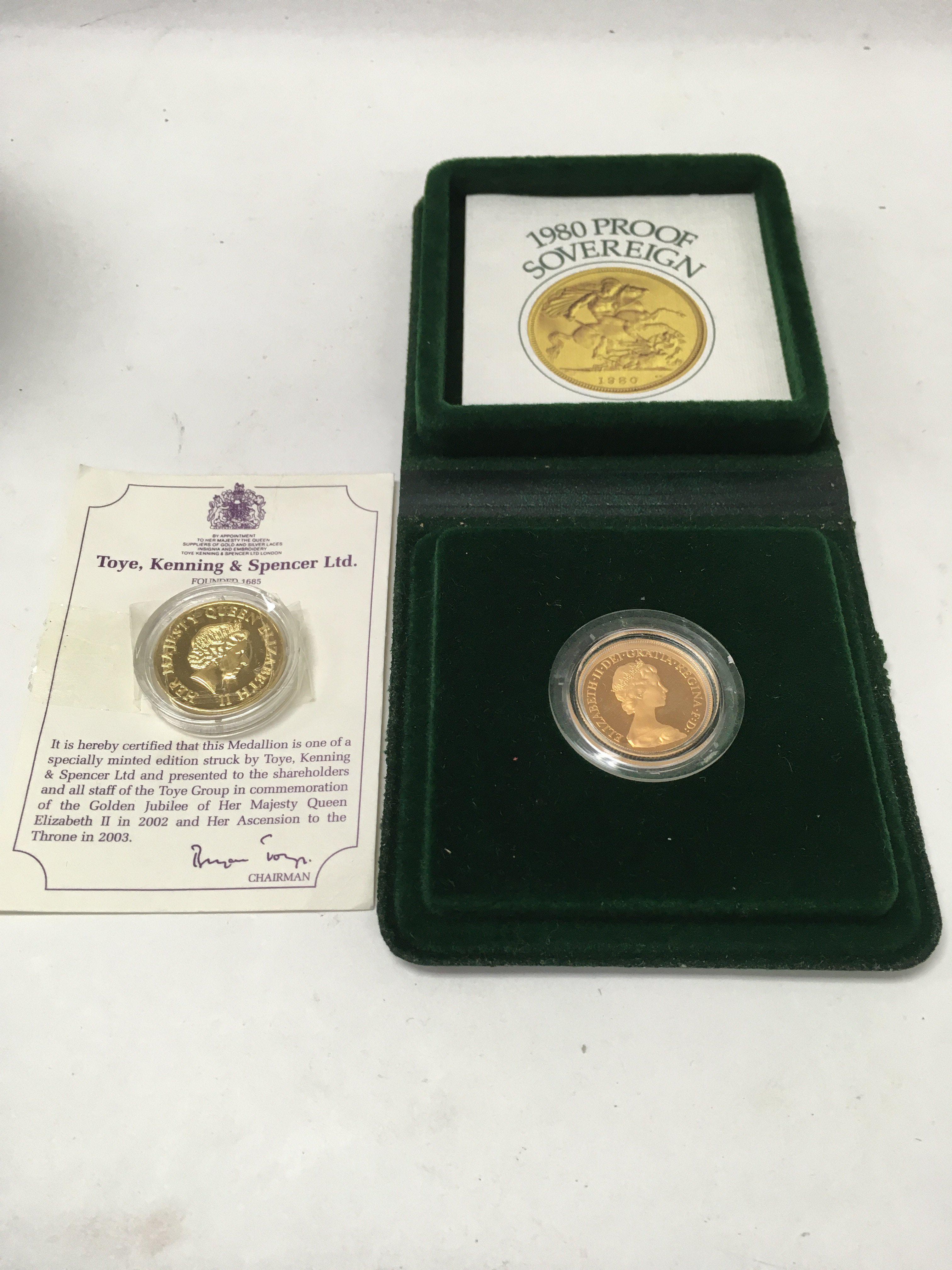A 1980 proof sovereign with a Queen Elizabeth Medallion.