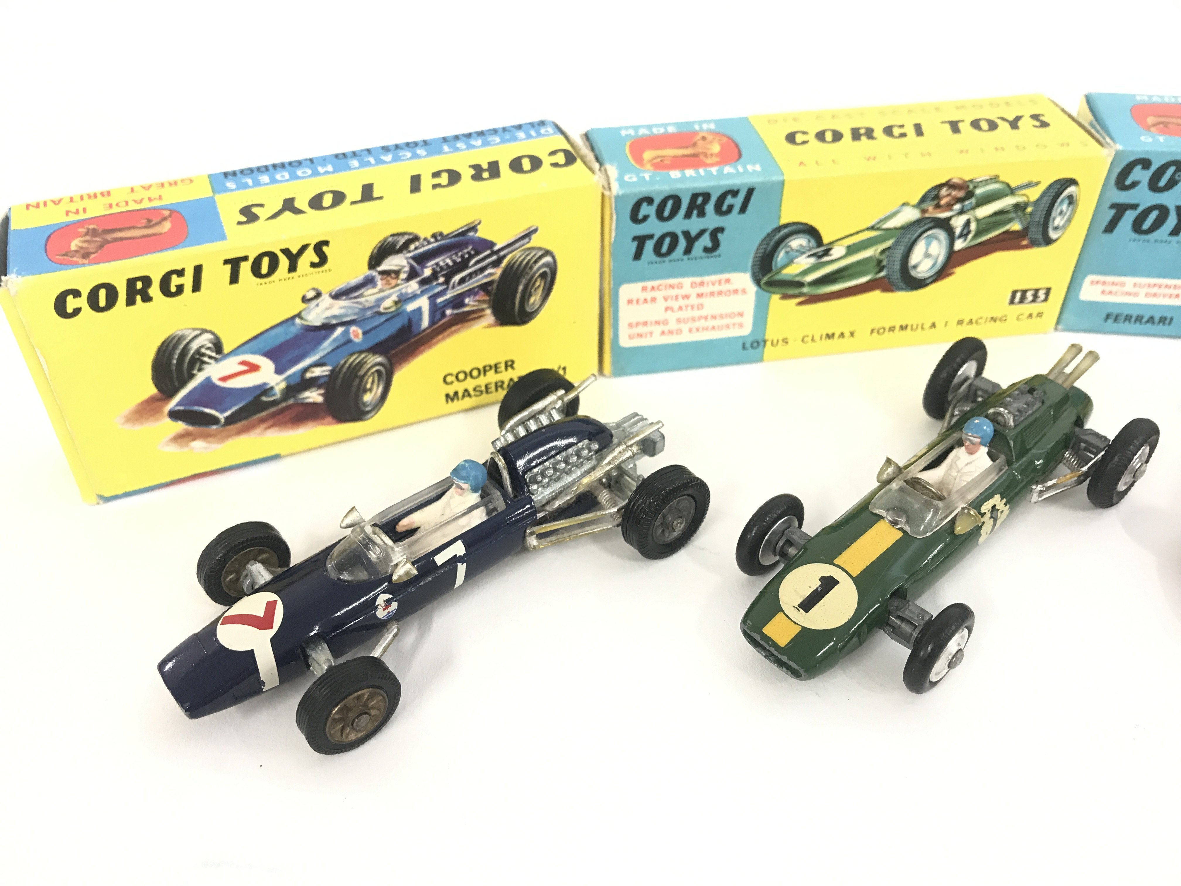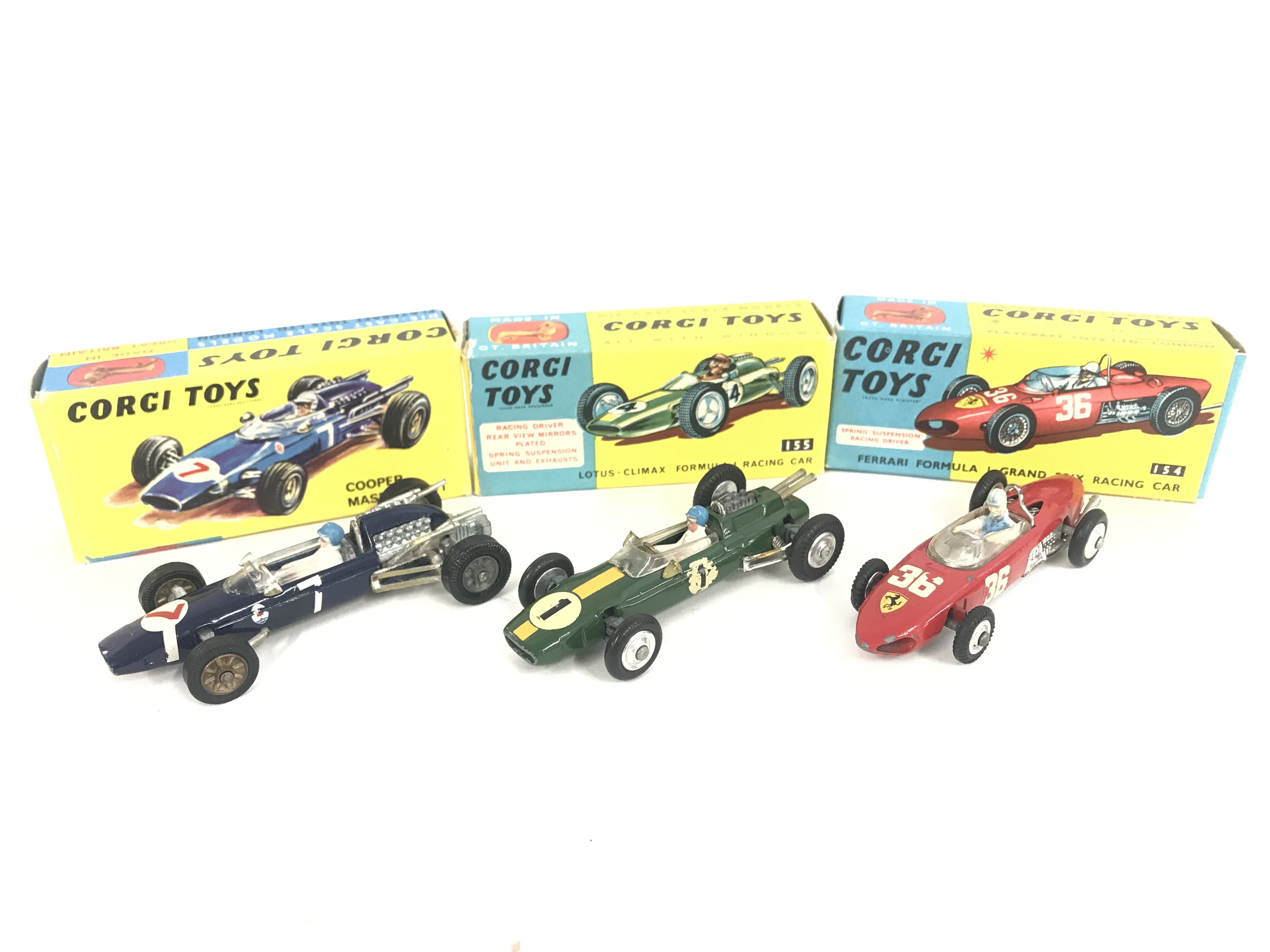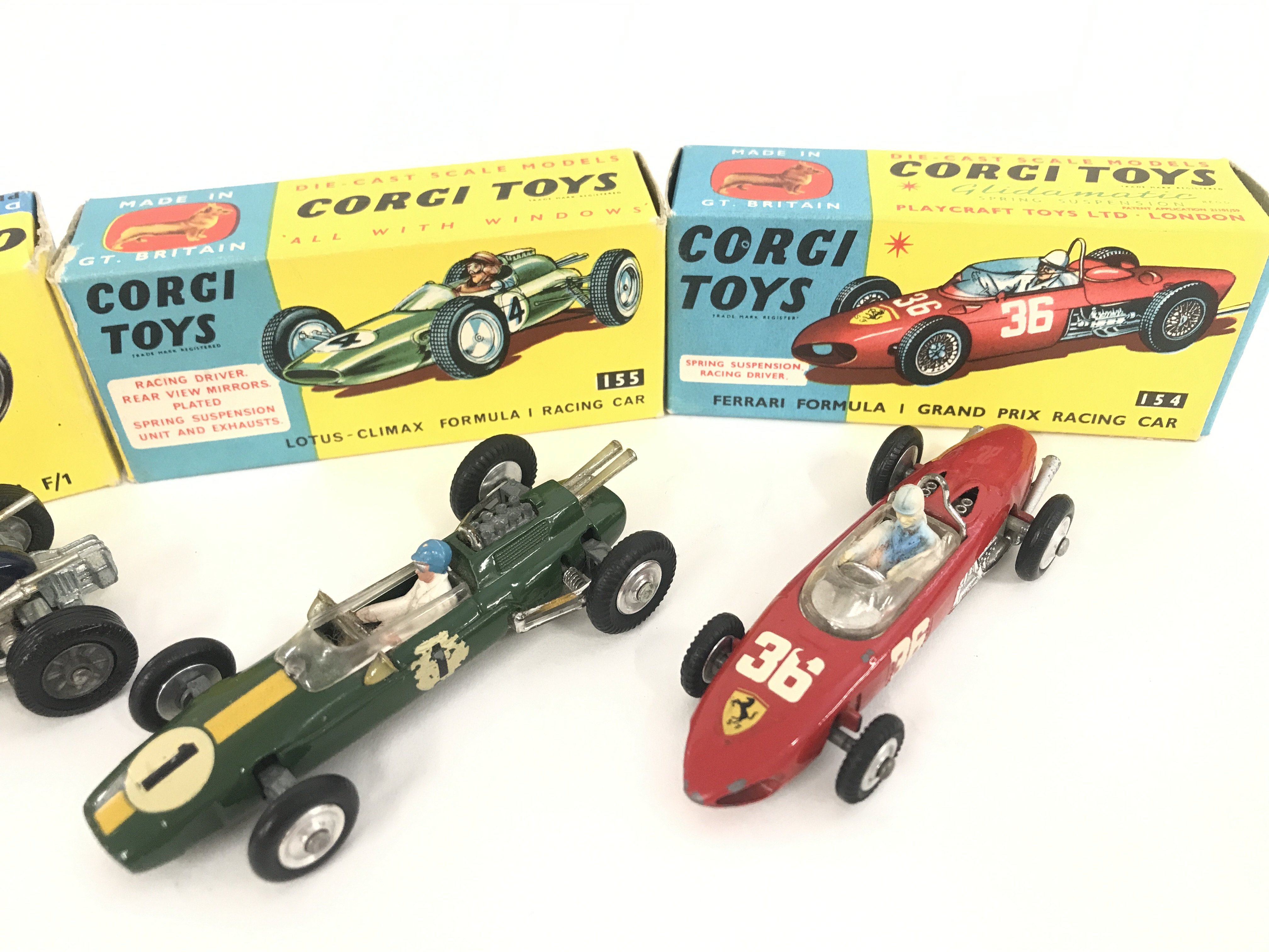 3 X Boxed Corgi F1 Cars. A Cooper Maserati #156. A Lotus-Climax #155 and a Ferrari #154.