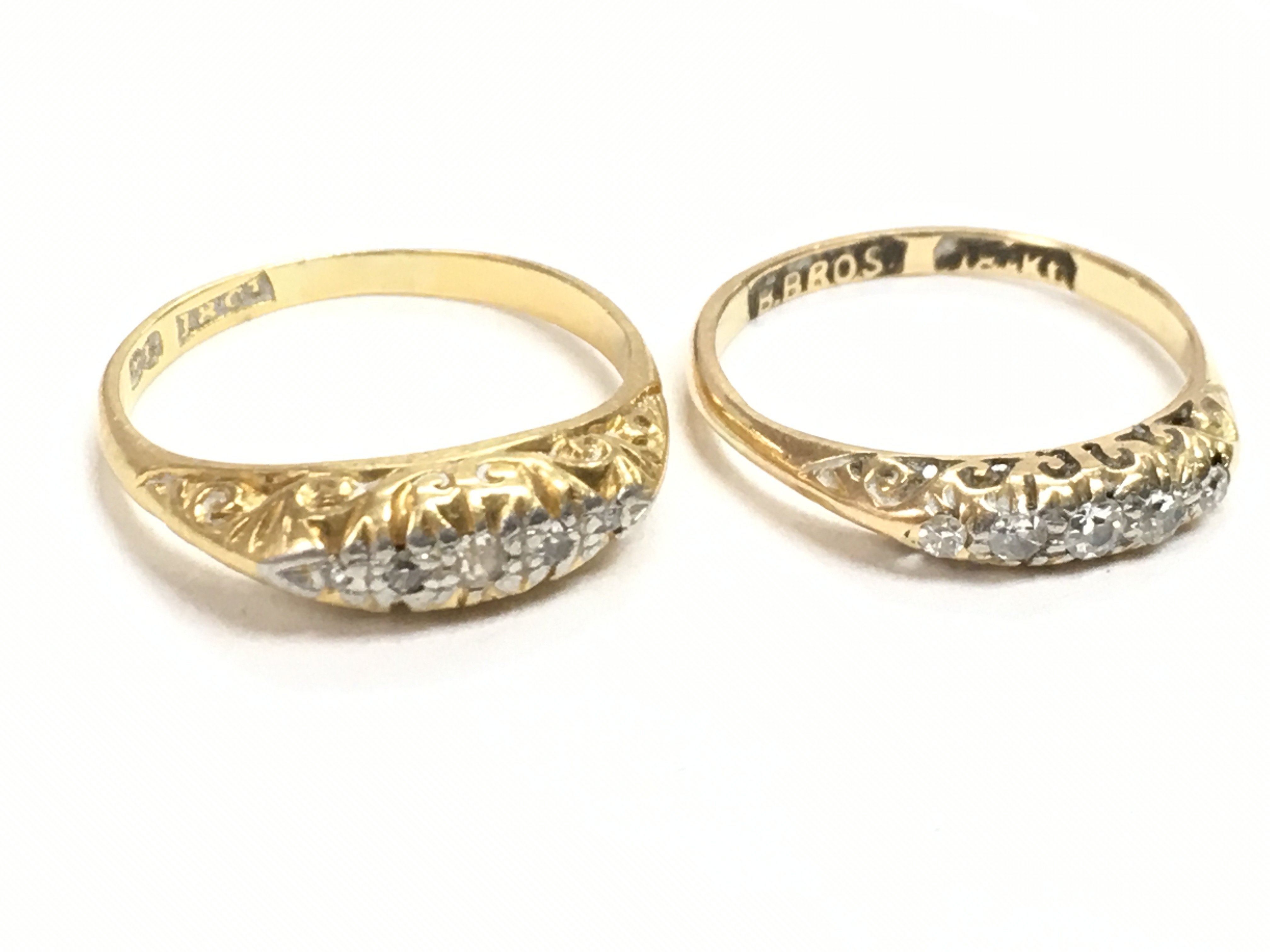 Two 18 carat gold rings set with diamond shards, 5.4g. Size L & N. Postage category A