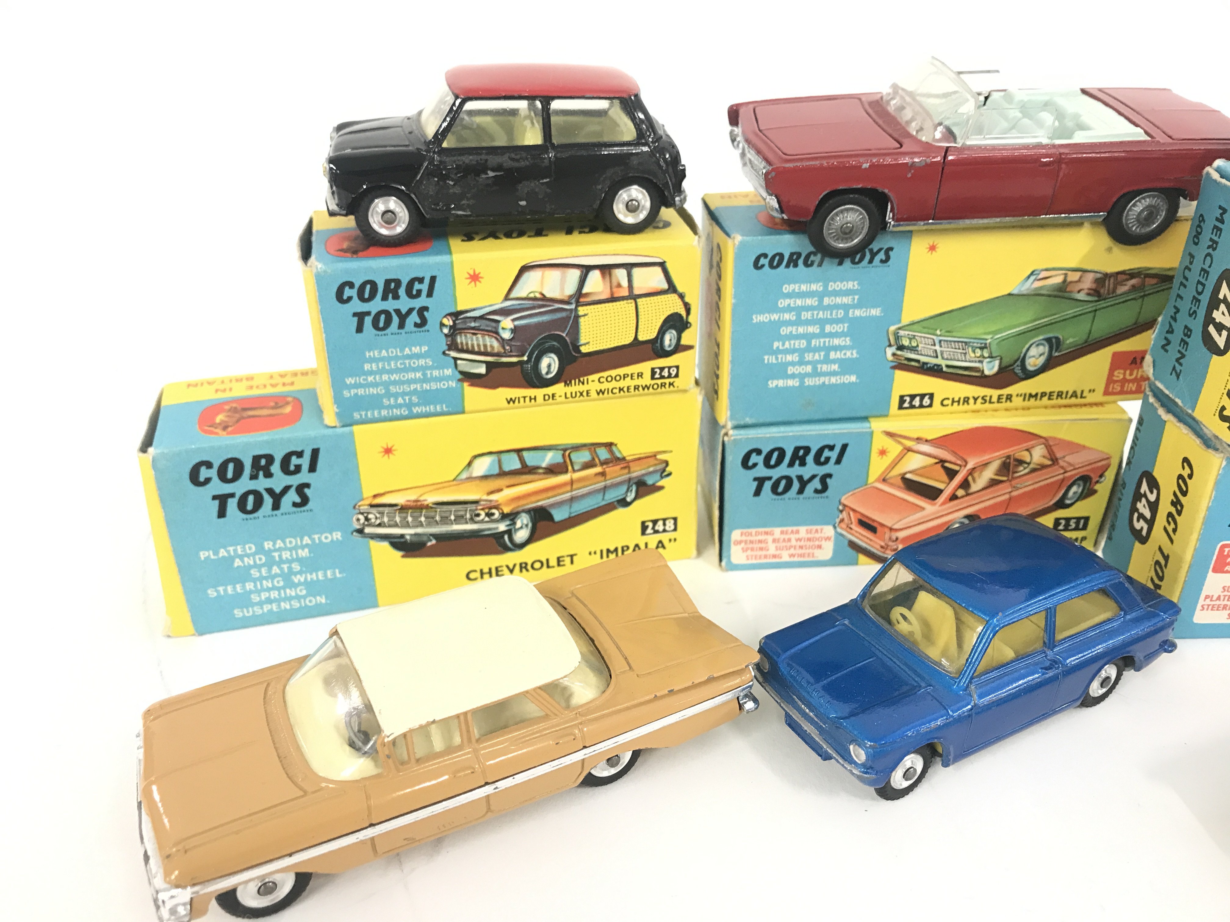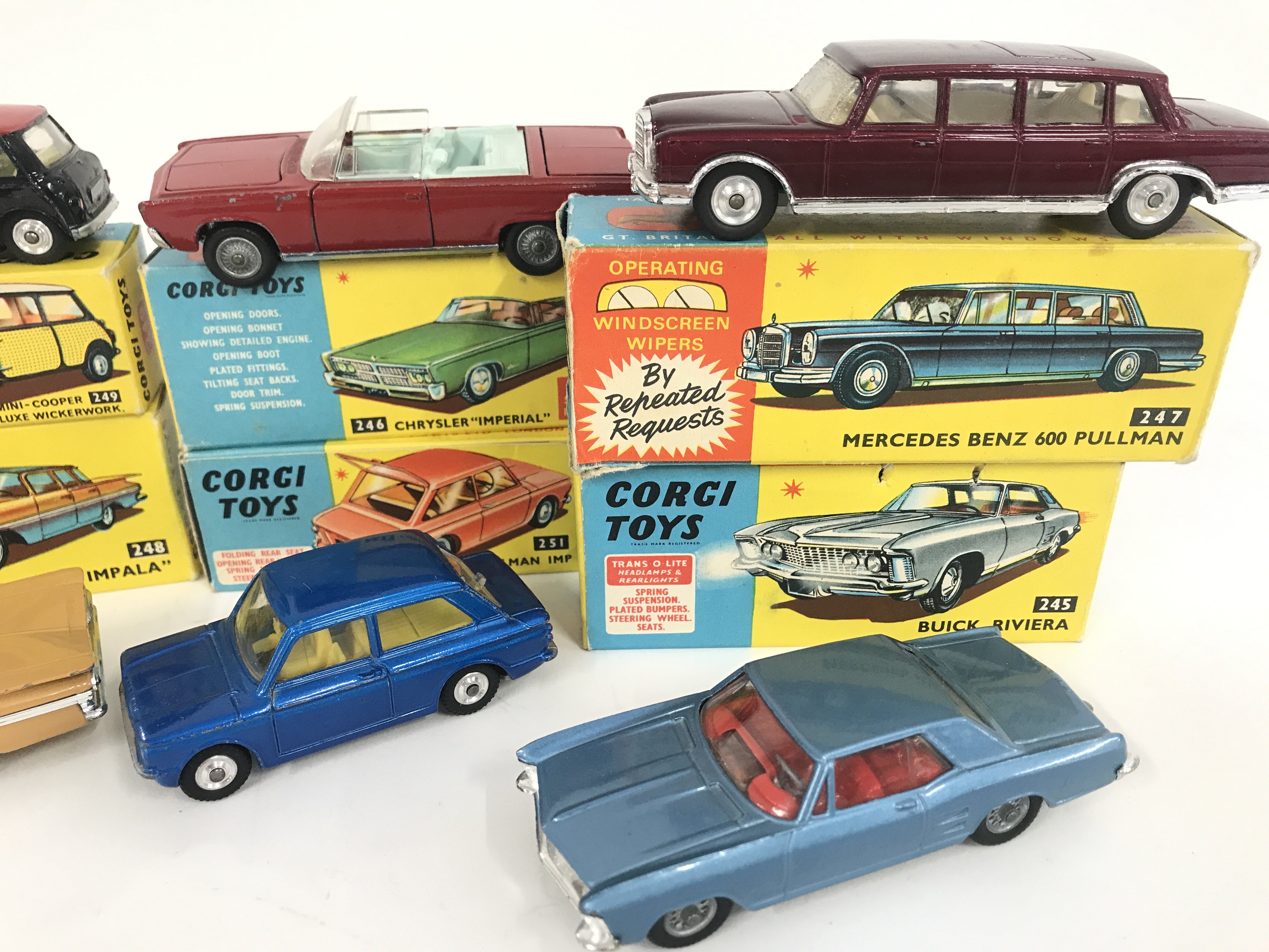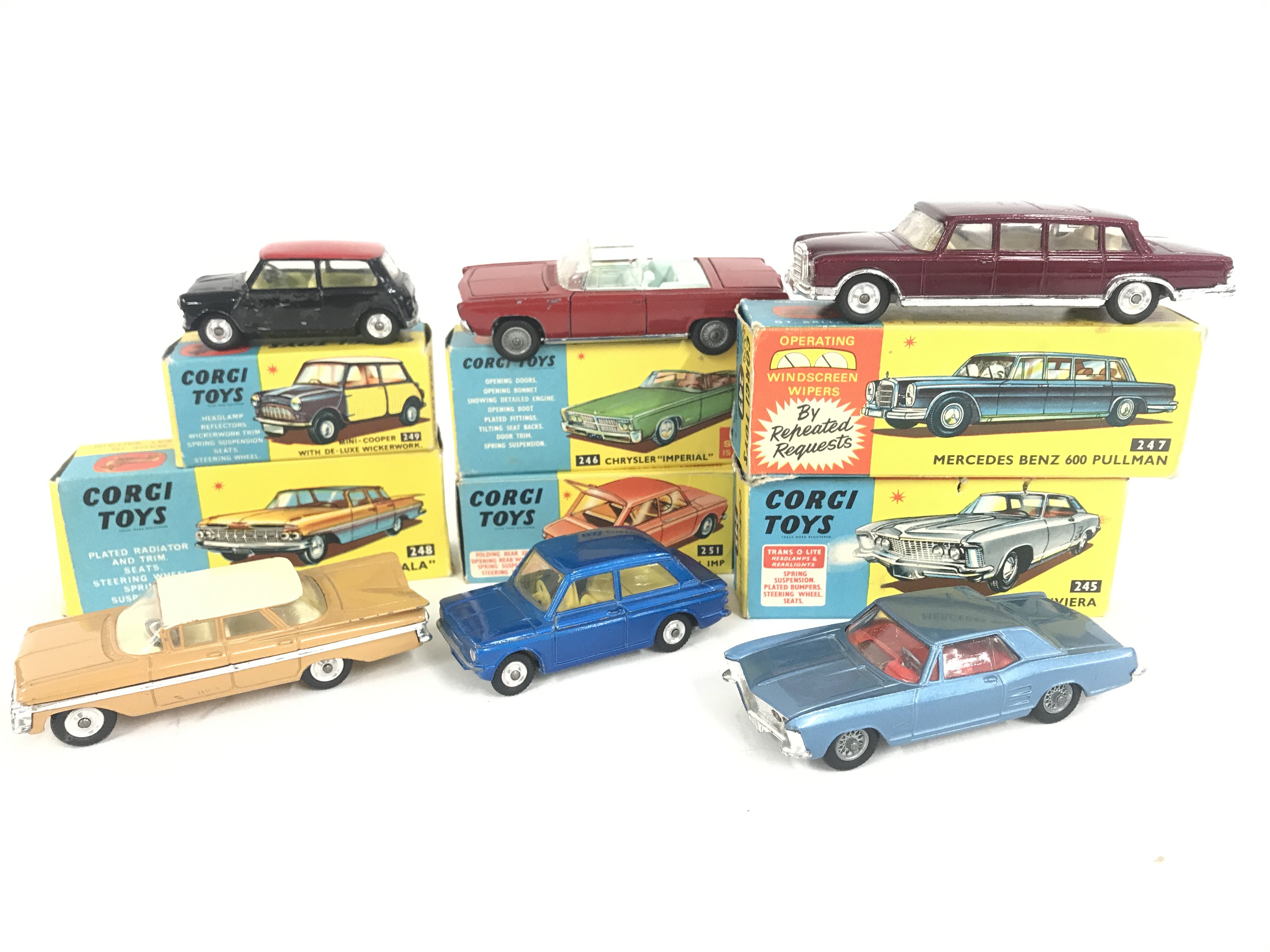6 Boxed Corgi Vehicles. A Mini-Cooper #249. A Chrysler Imperial #246. A Mercedes Benz 600 Pullman. #247. Chevrolet Impala #248 a Hillman Imp #251 and a Buick Rivera #245.