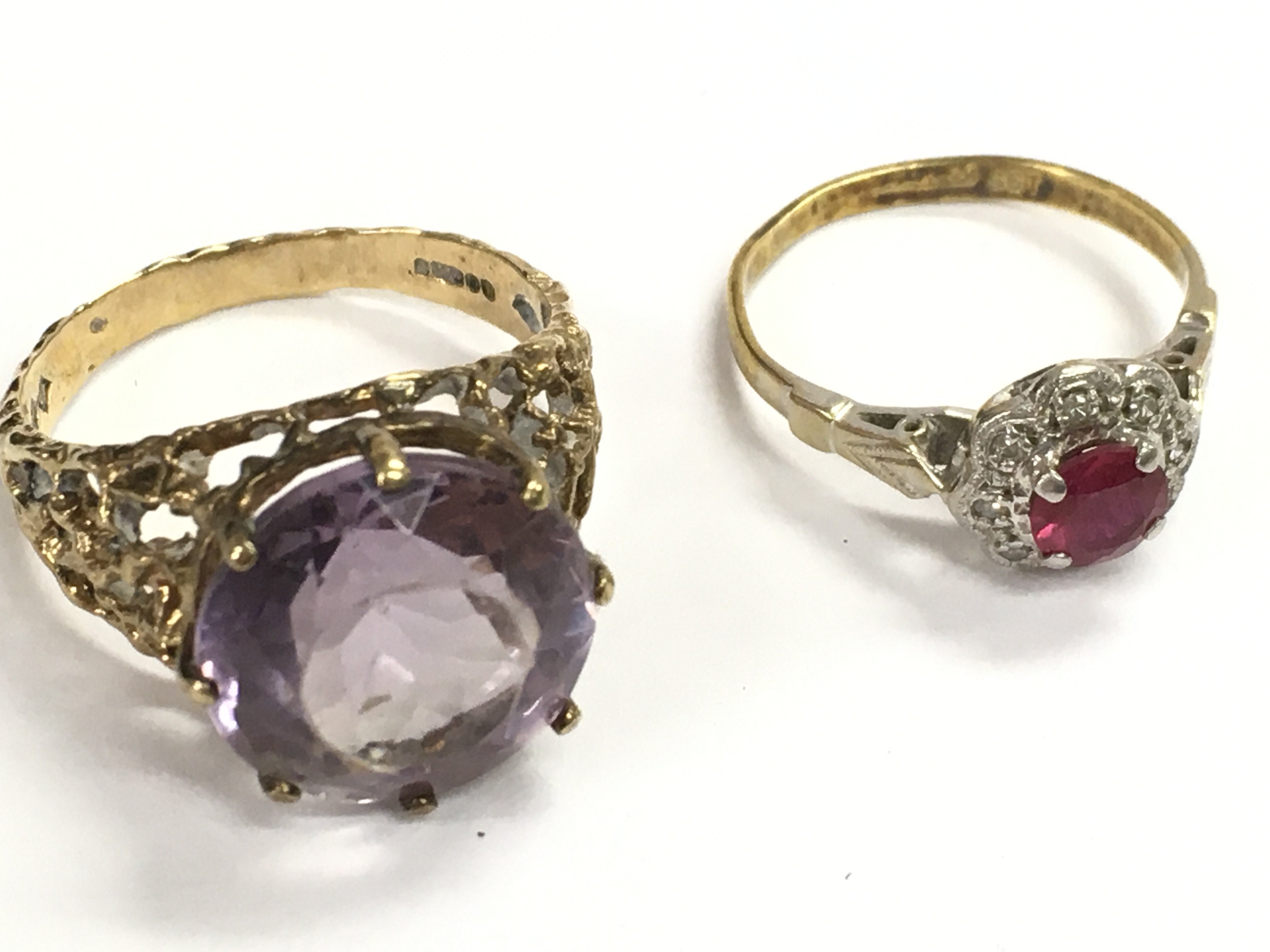 9 carat rings including one set with a amethyst stone and one set with a ruby and diamond shards. Size O and I. Total weight 7g Postage category a