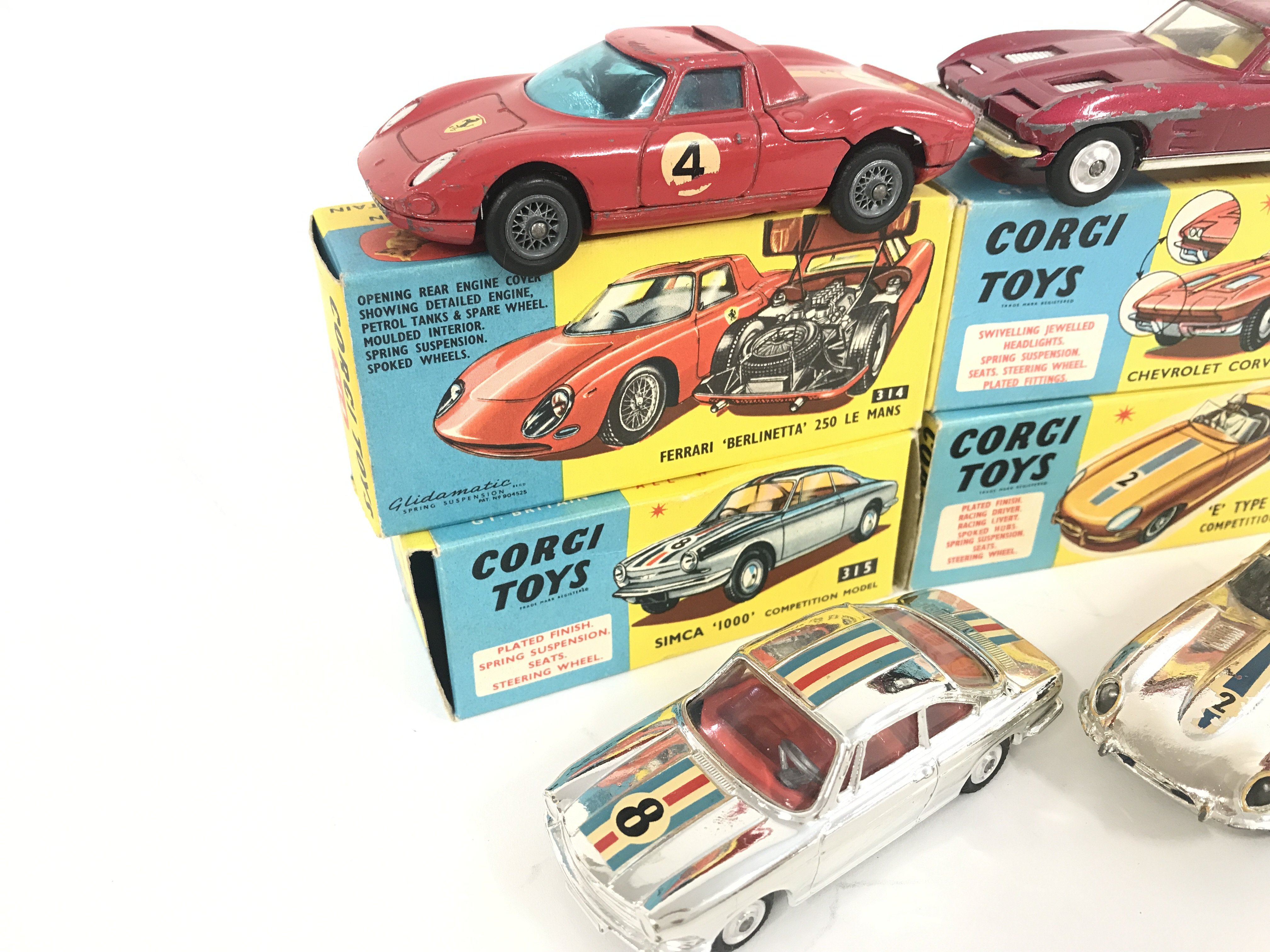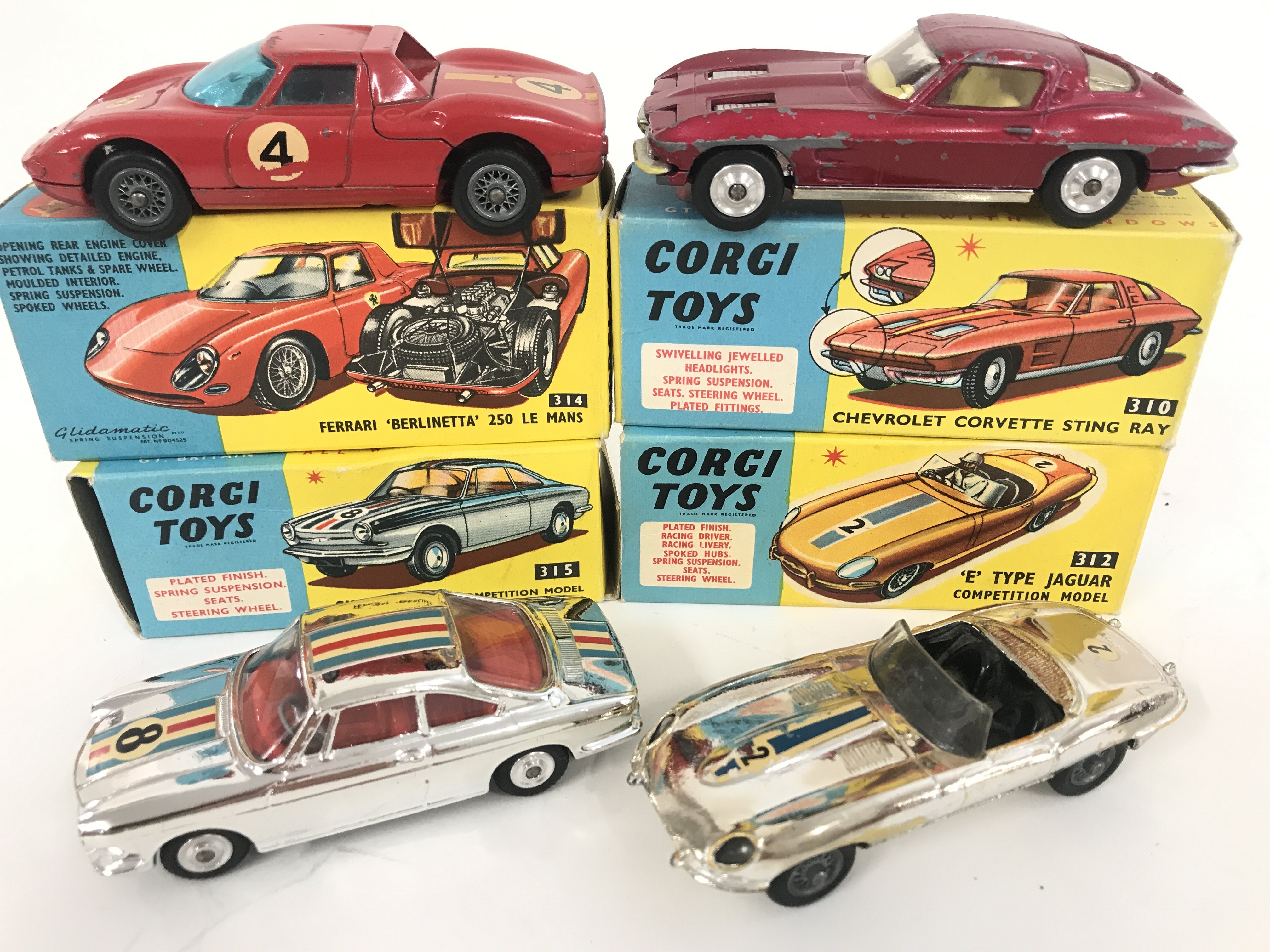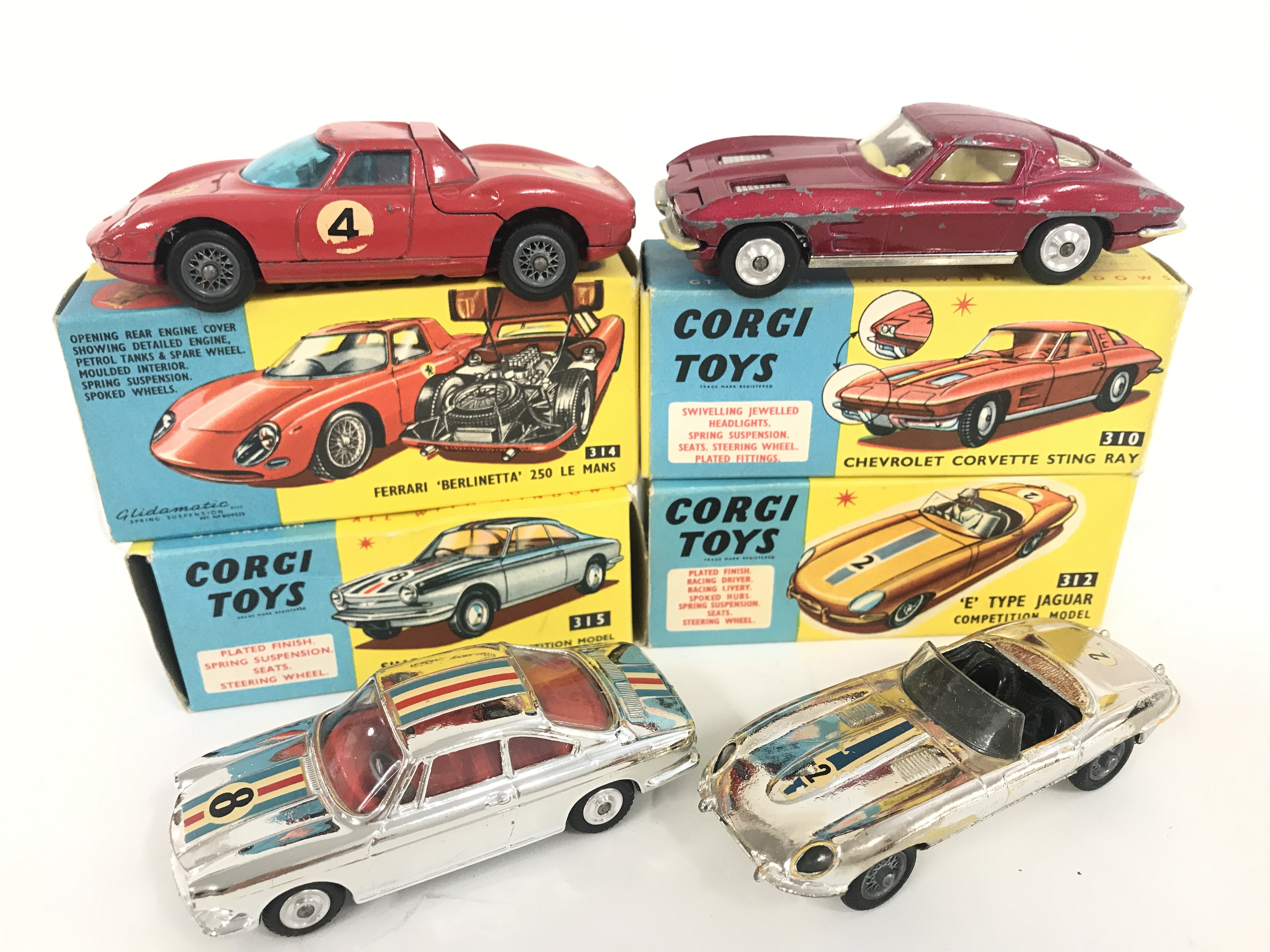 4 X Boxed Corgi Vehicles. A Ferrari #314. A Chevrolet Corvette Sting Ray #310 a Simca 1000 #315 and a E Type Jaguar #312.