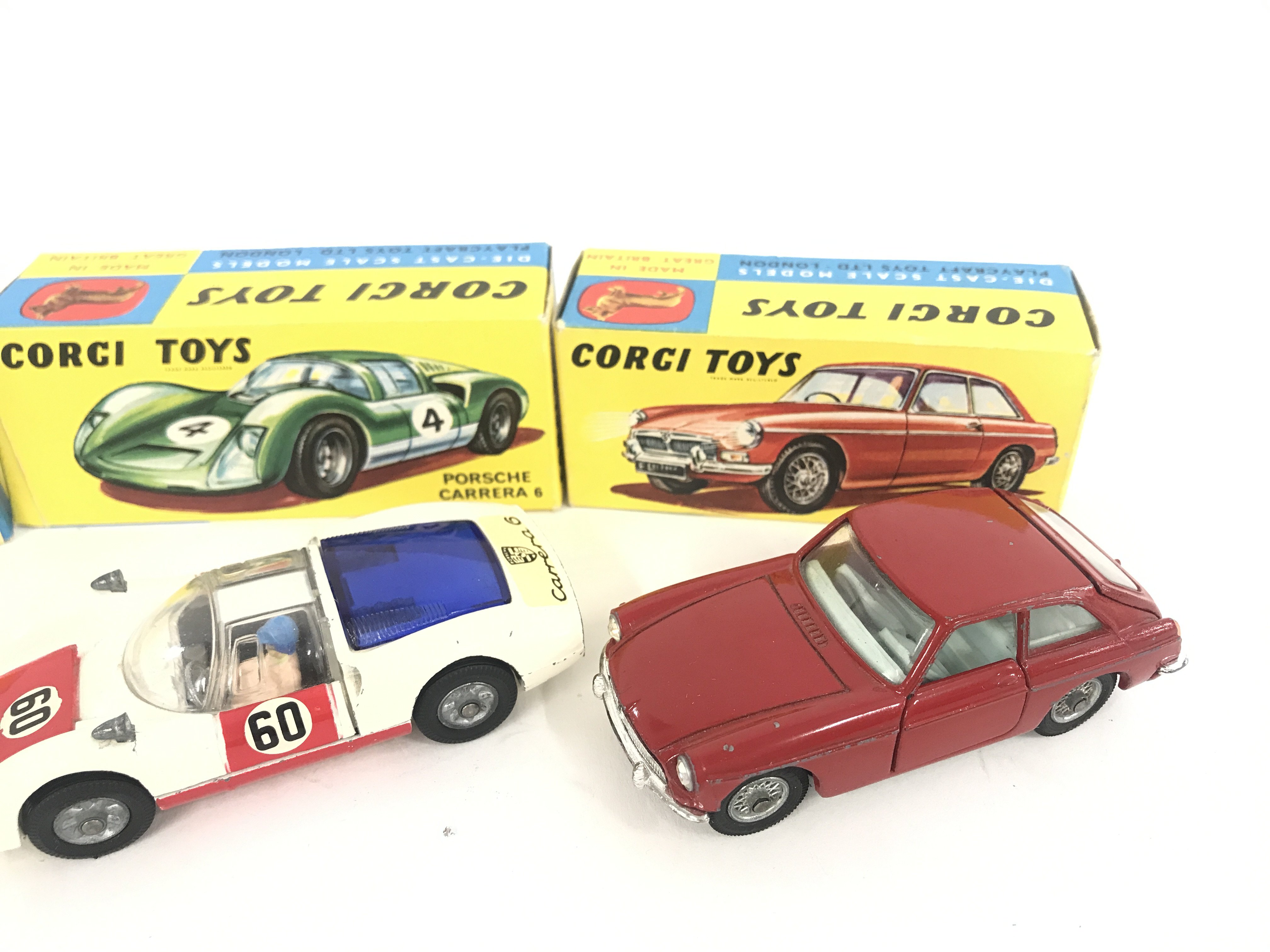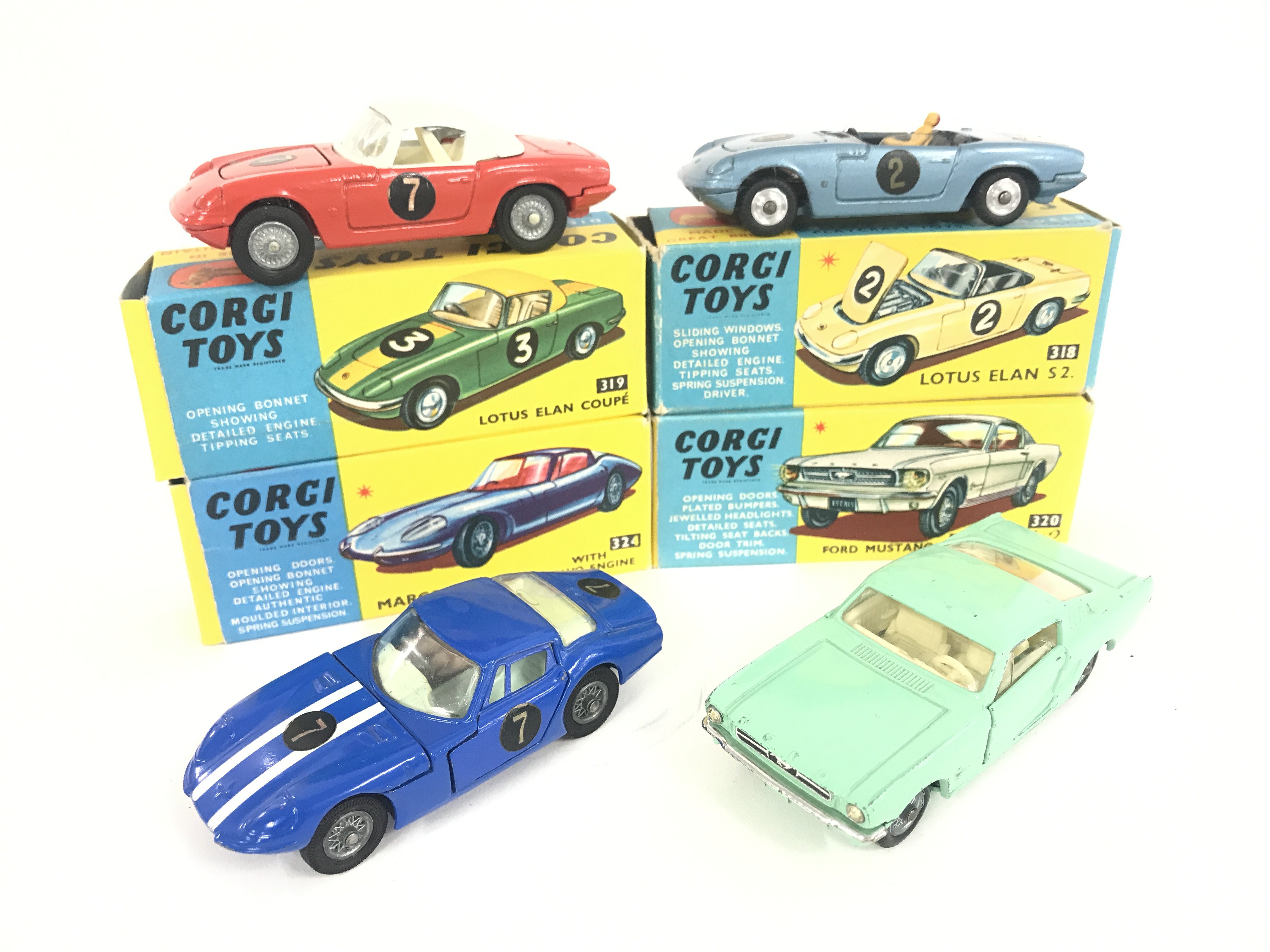 7 X Boxed Corgi Vehicles. A Lotus Elan Coupe #319. A Lotus Elan S2 #318 A/F. A Marcos 1800 G.T. #324. a Ford Mustang #320. A Porsche Carrera 6 #330. A M.G.B G.T. #327 And a Lancia Fulvia Sport Zagato #332.