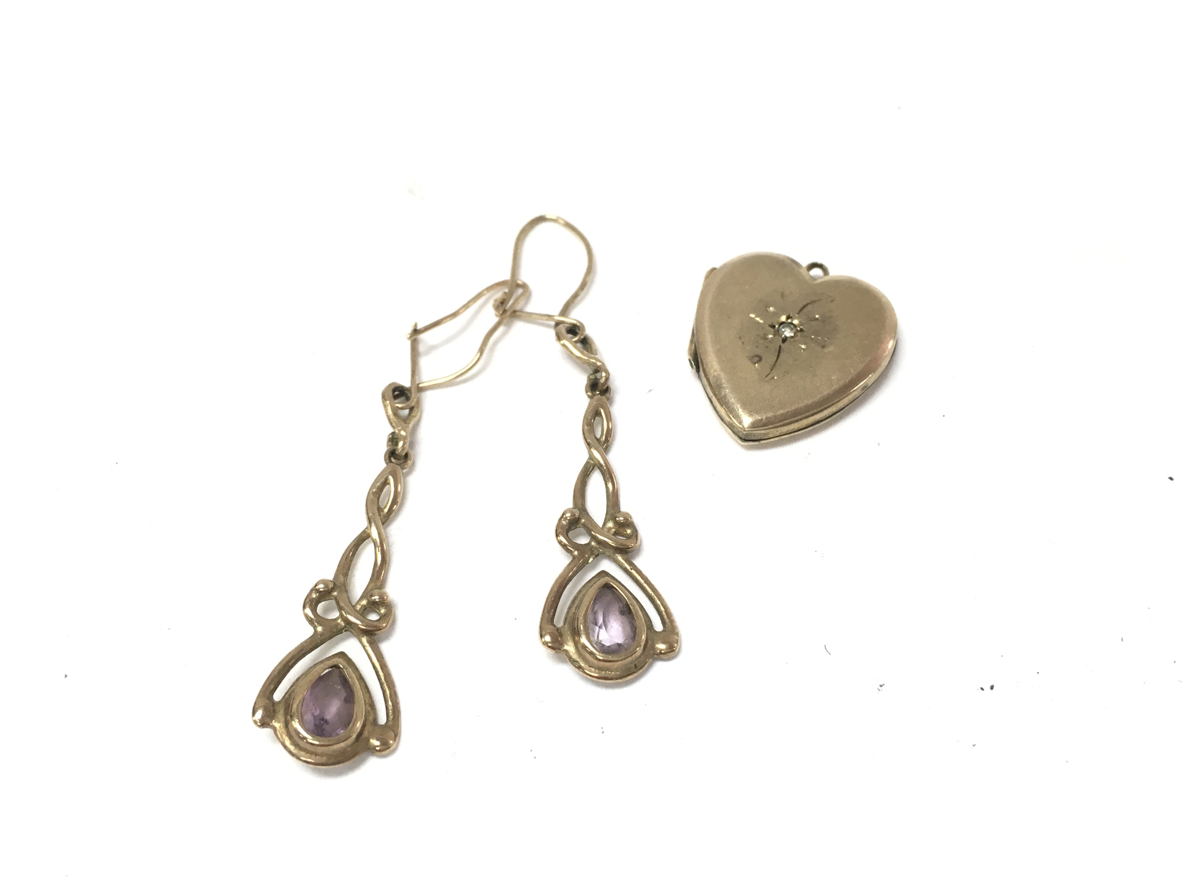 A 9ct gold locket set with chip diamond and a pair of unmarked earrings. Approx 5.1grams.
