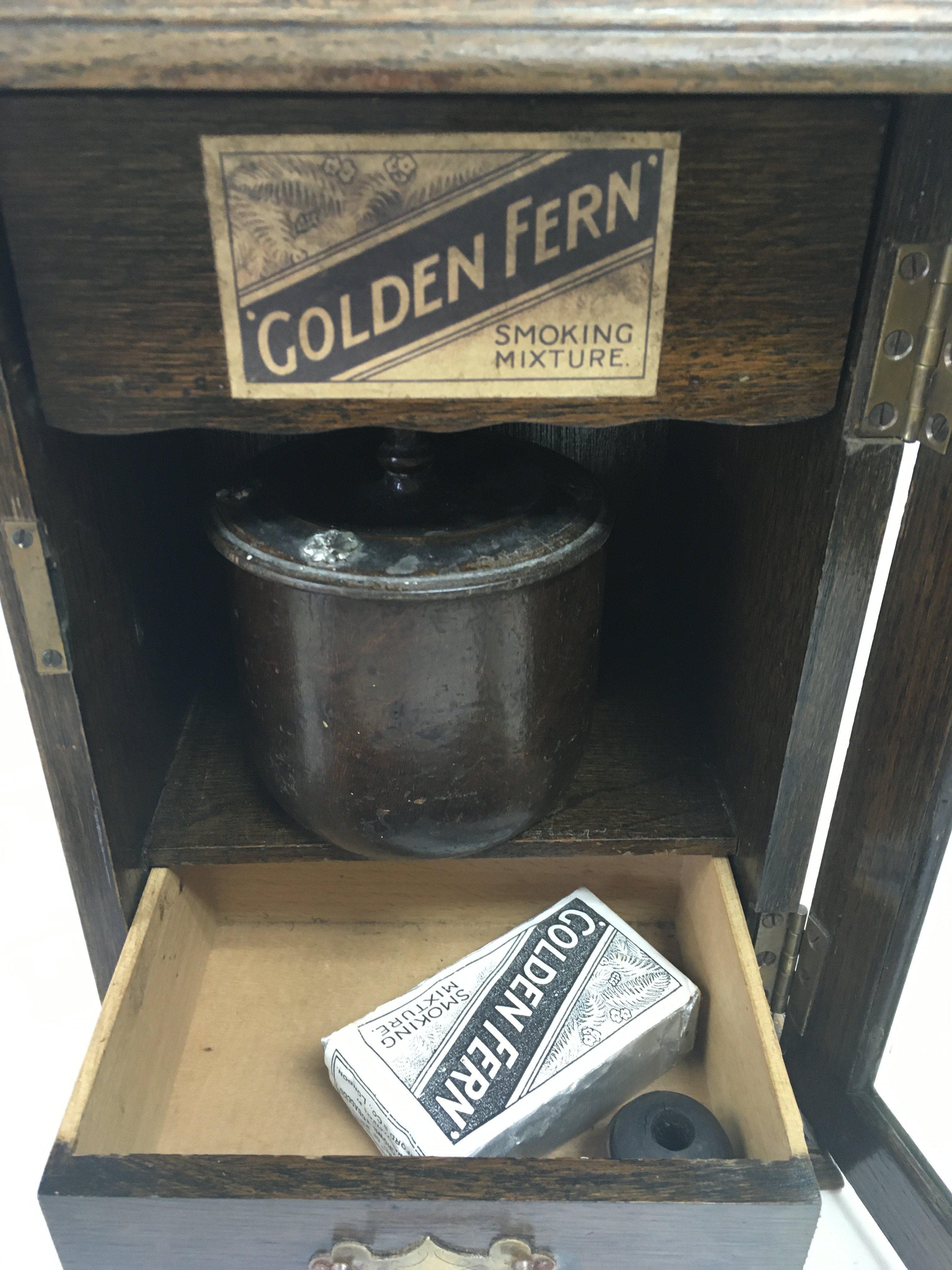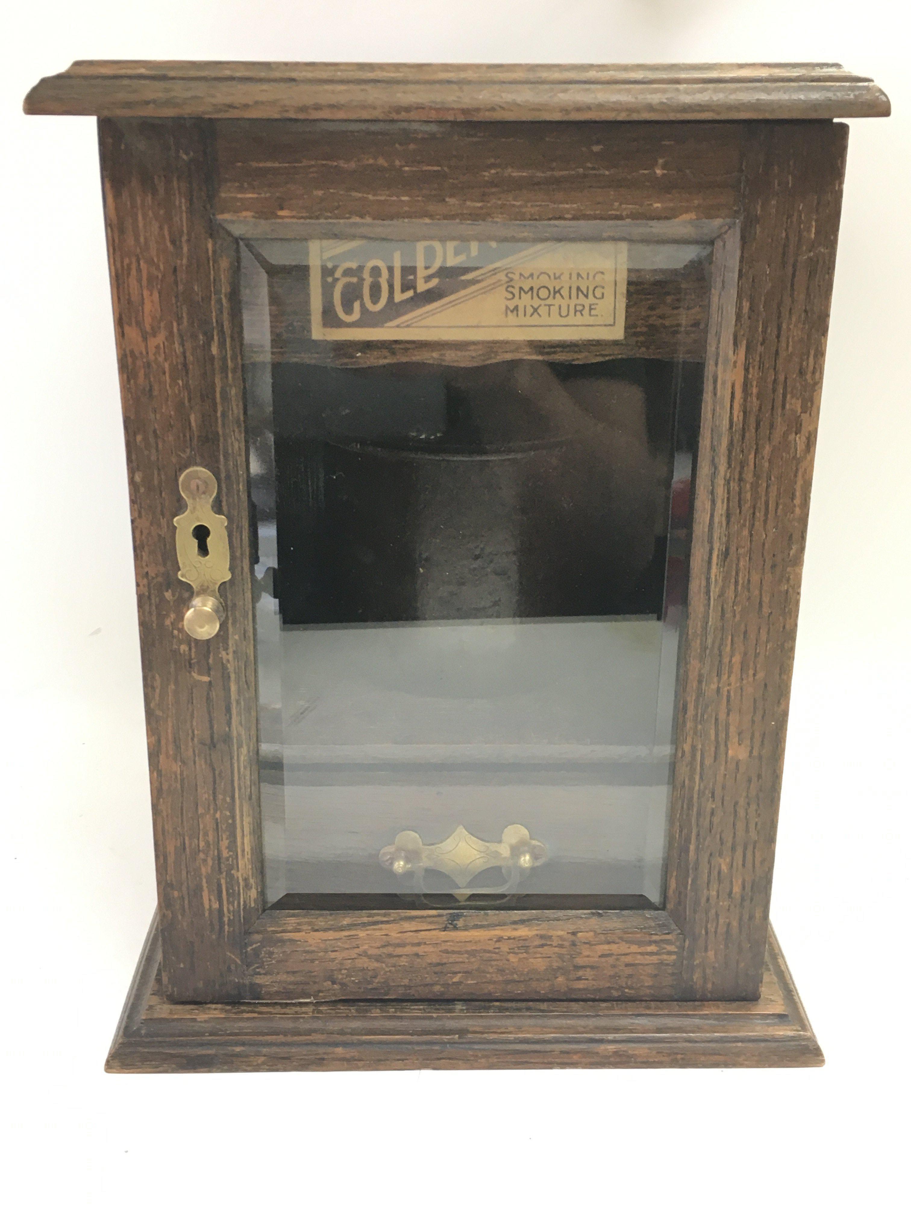 A vintage smokers cabinet with glass door, pipes, an unopened packet of tobacco and a bowl. Dimensions 22x20x28.5cm