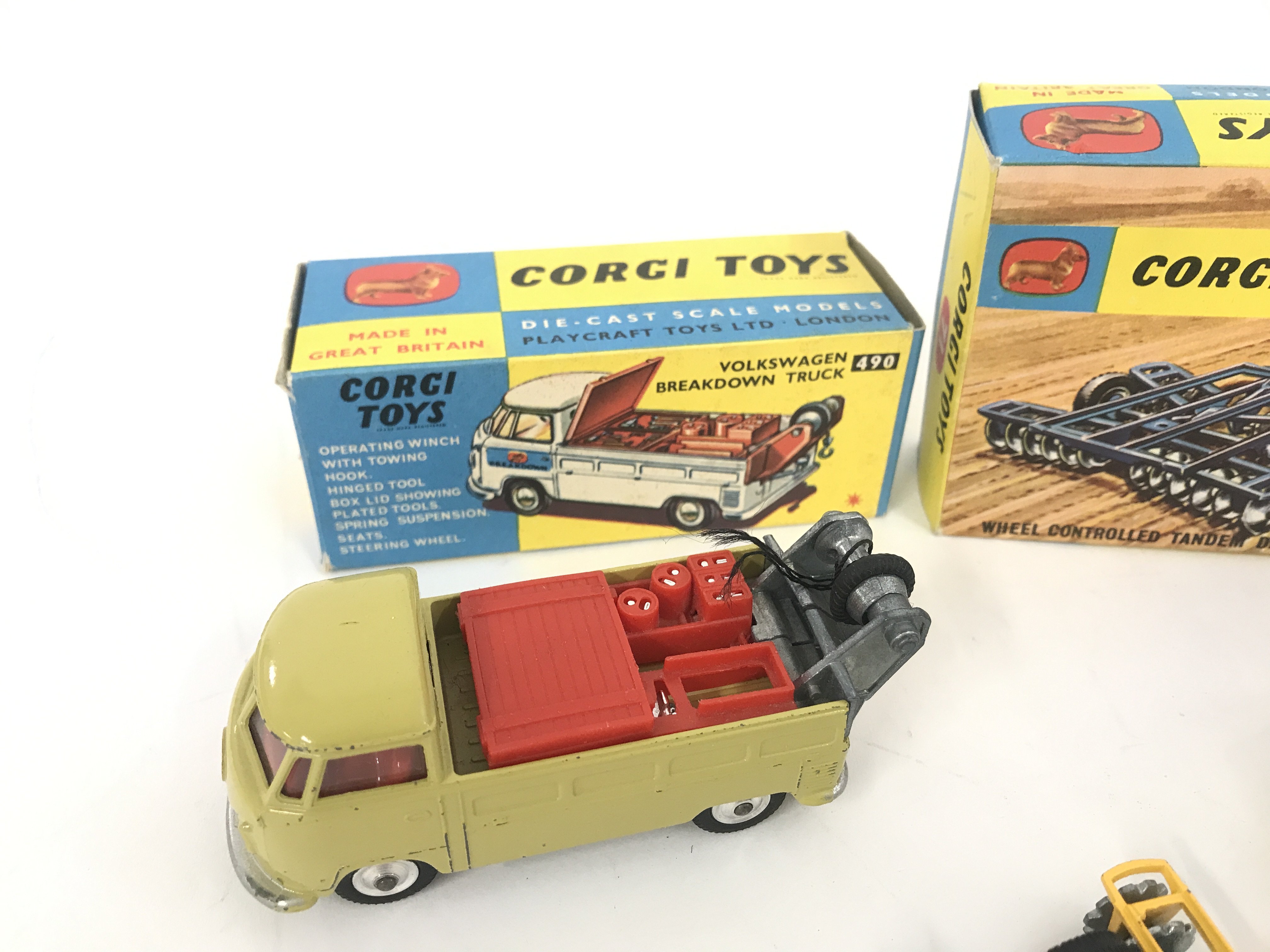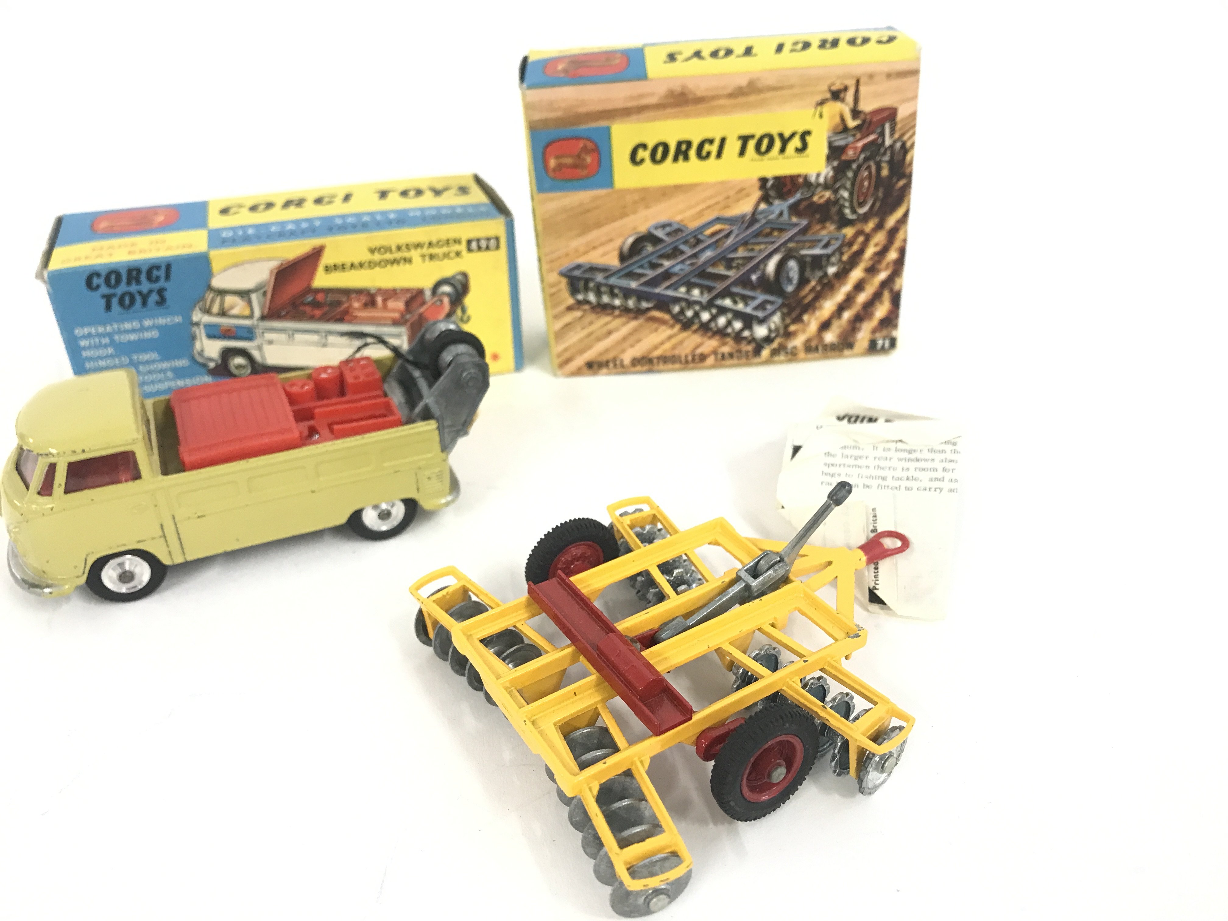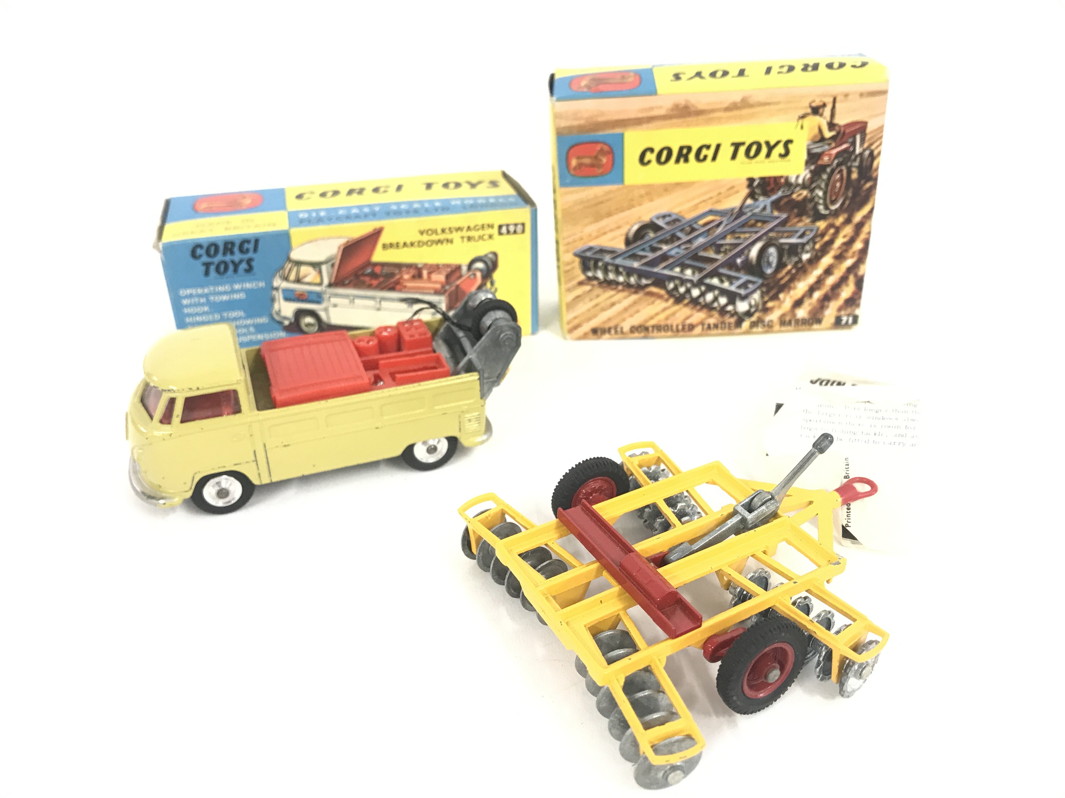 A Boxed Corgi Volkswagen Breakdown Truck (Hook missing) and a Wheel Controlled Tandem Disc Harrow #71.