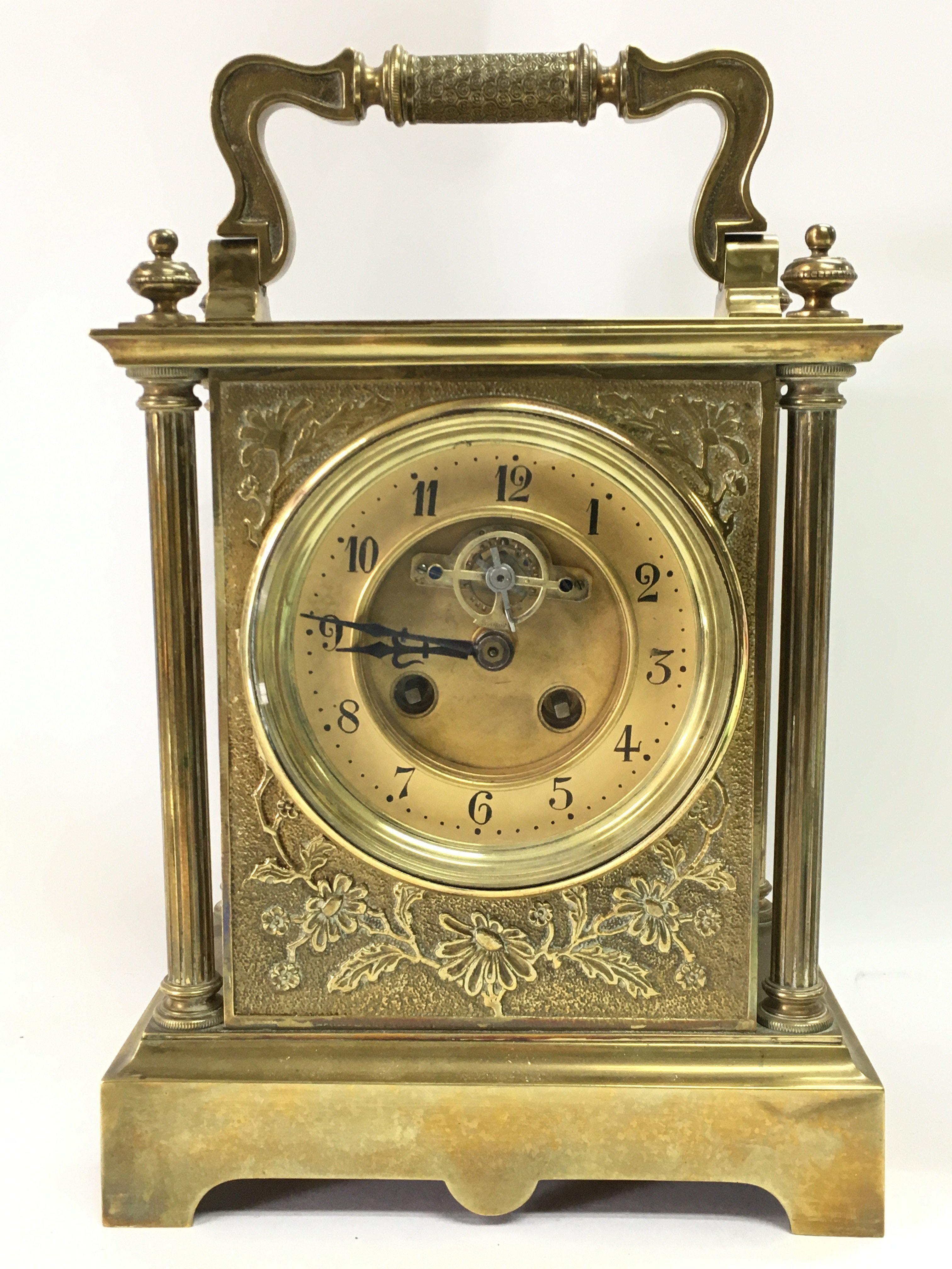 A brass mid 19th century French mantle clock with floral decoration . Dimensions 12x20x29cm. Cannot be posted