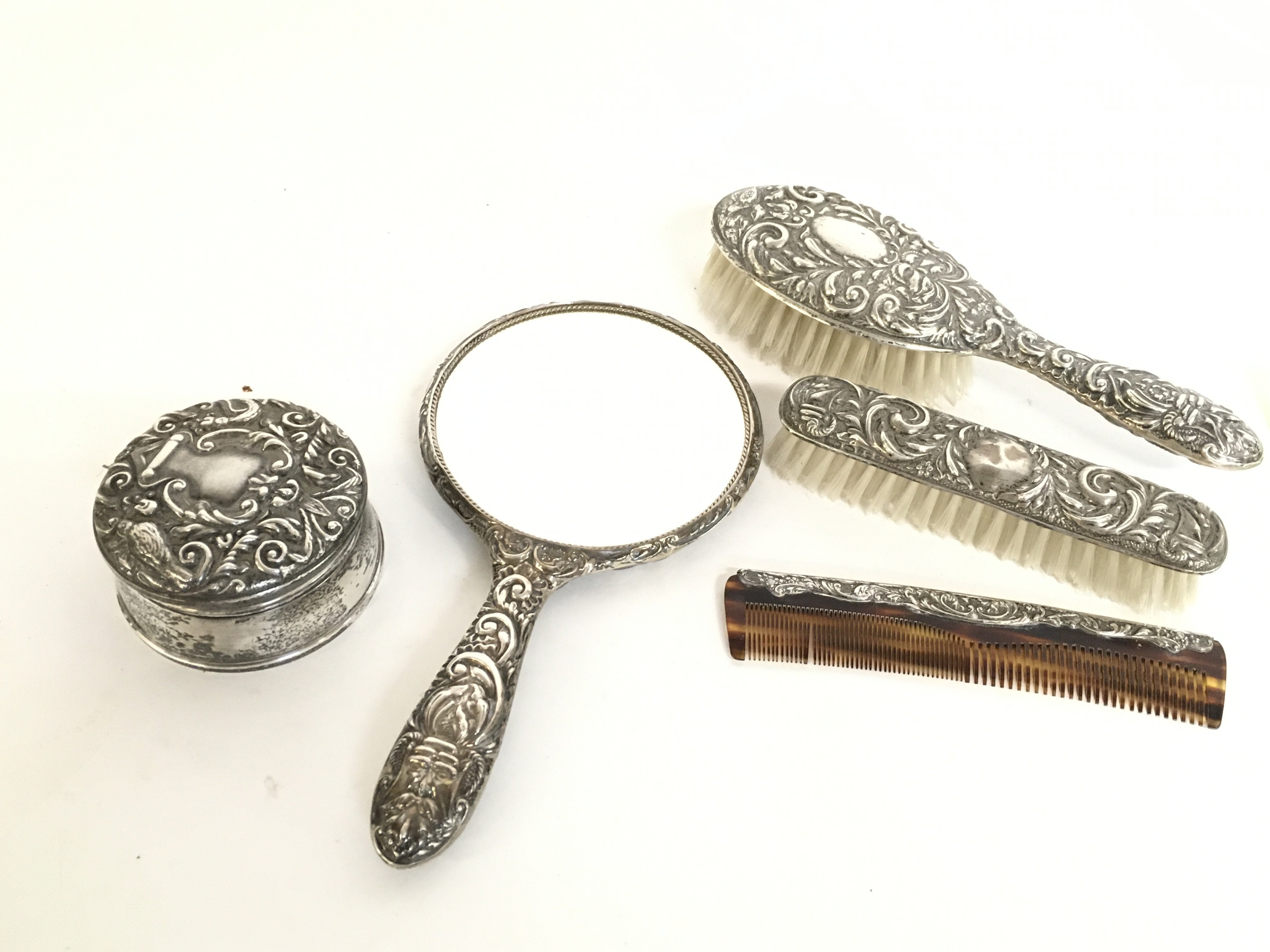 Silver hallmarked dress set including mirrors, brushes etc. This lot cannot be posted