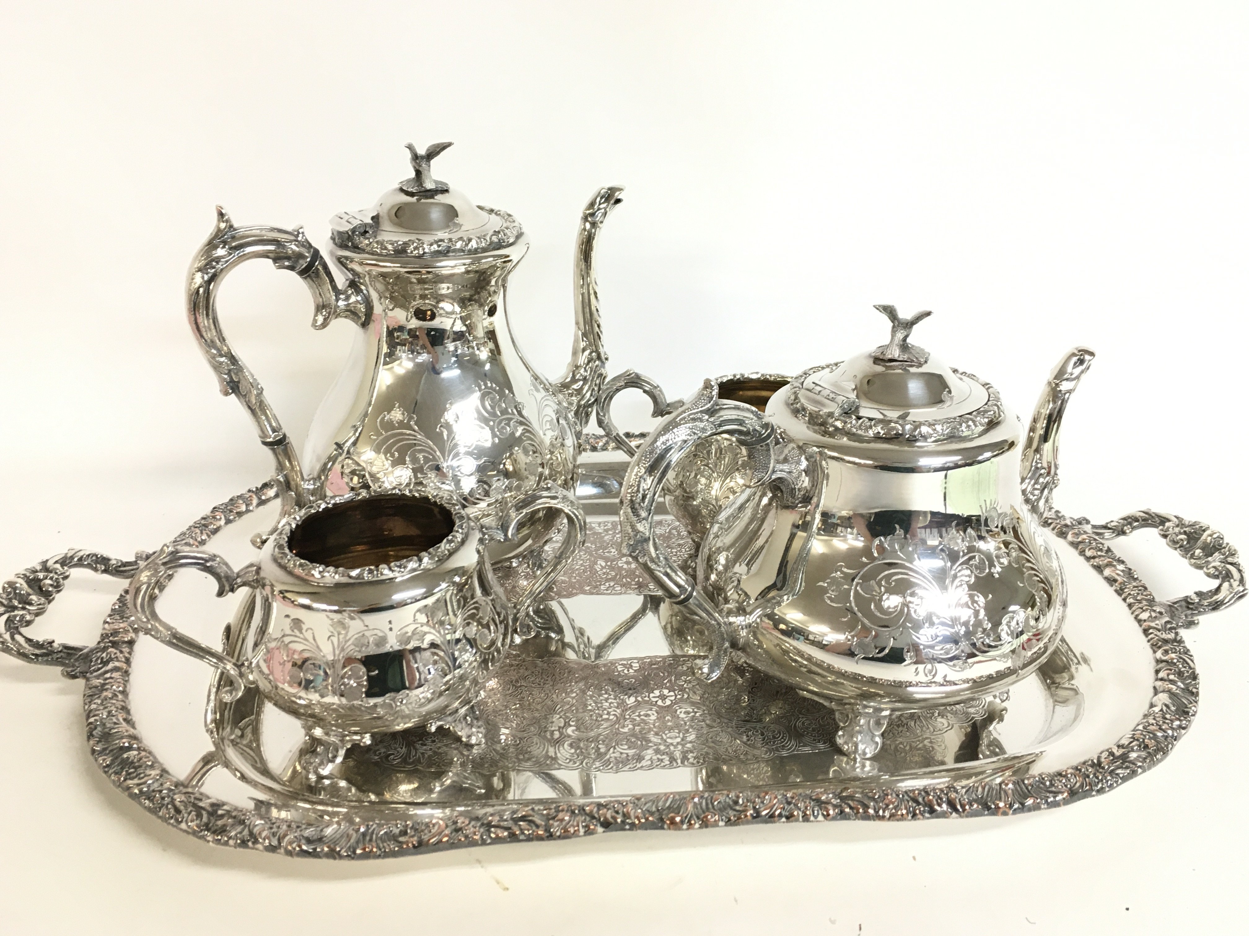 A silver plated Cooper Brothers tea set, coffee pot and tray. Postage category C