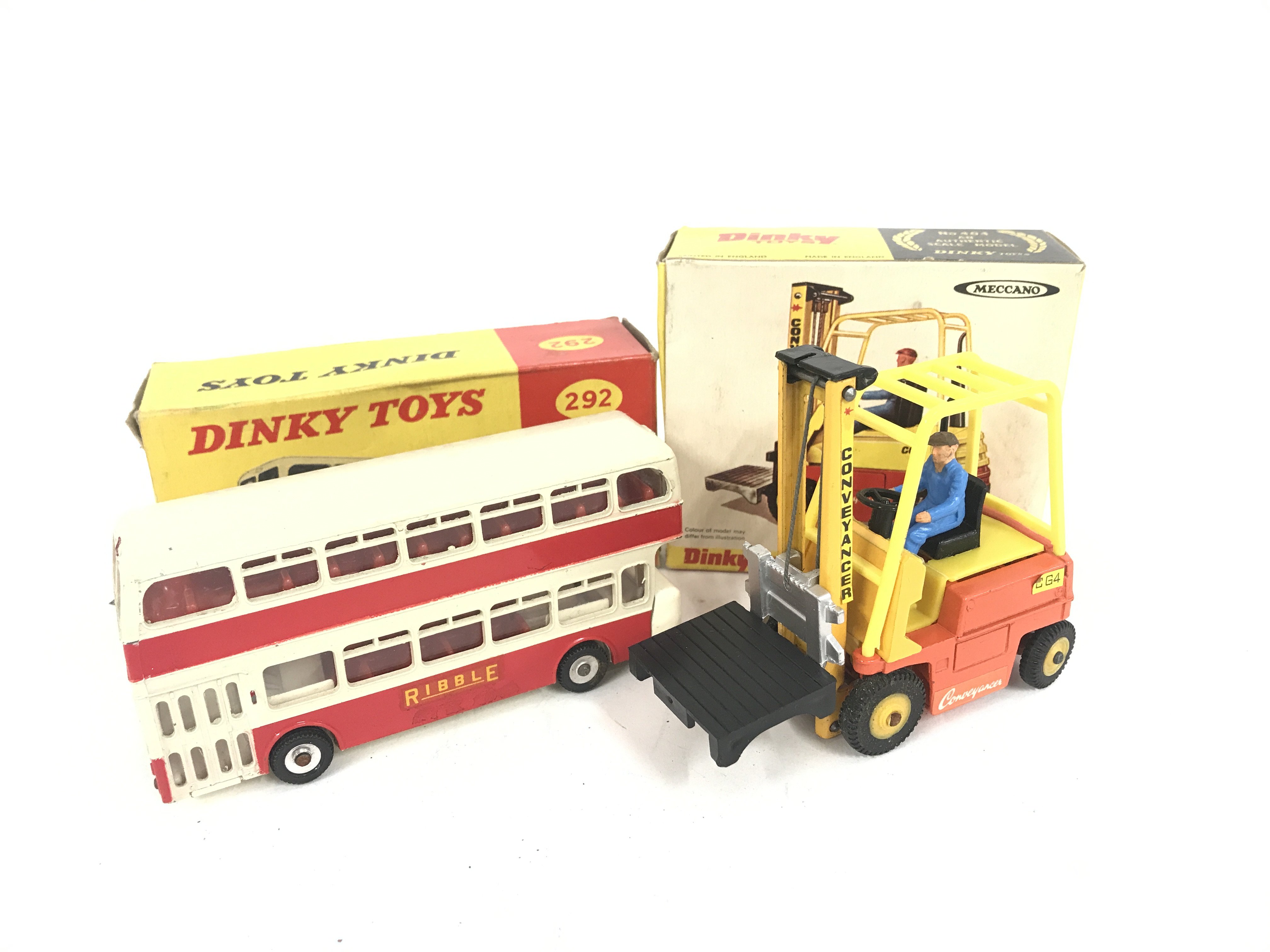 A Boxed Dinky Leyland Atlantean Bus #292 and a Conveyancer Fork Lift Truck #404.