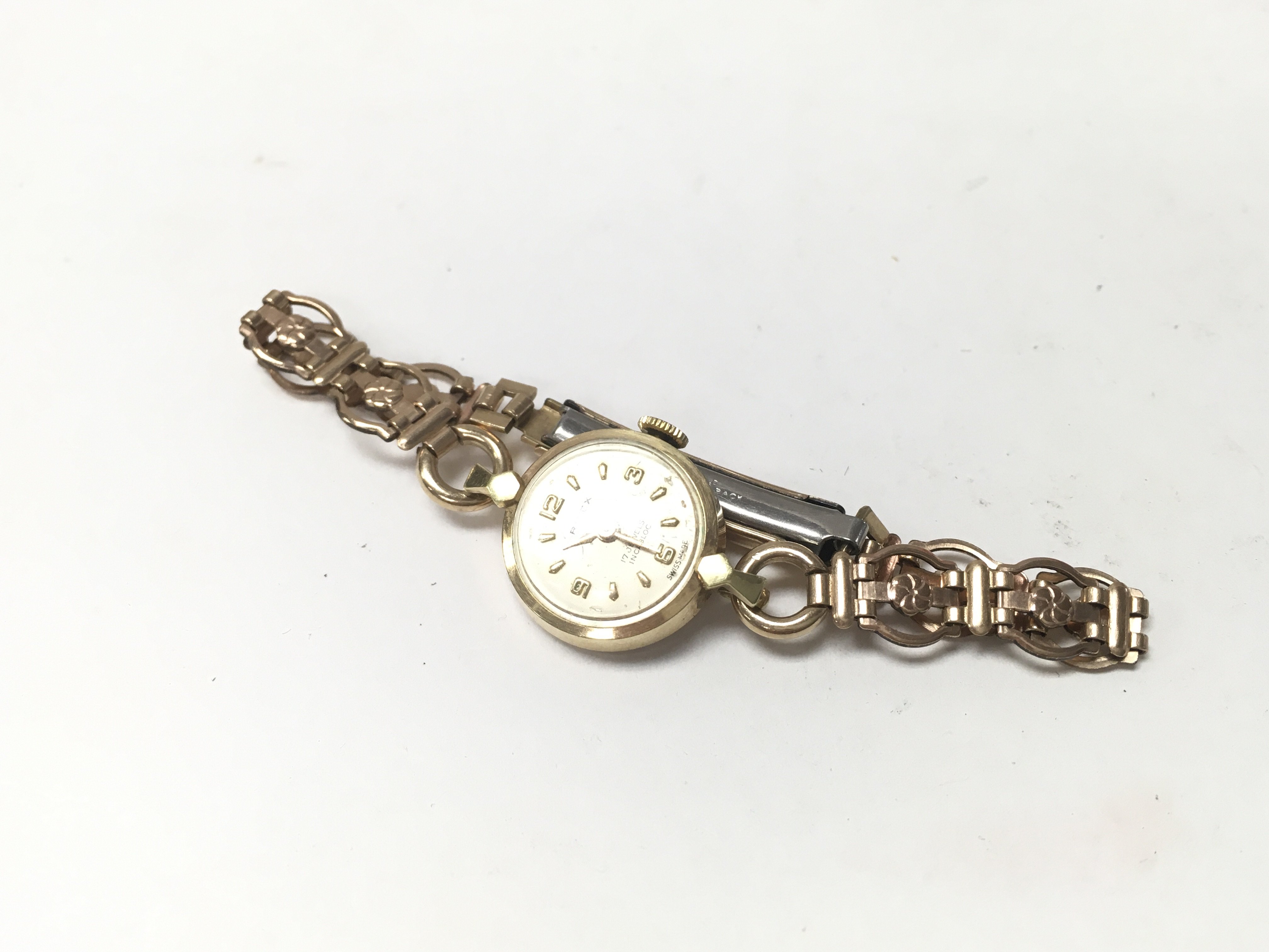 A 14ct cased gold ladies watch with a rolled gold strap.