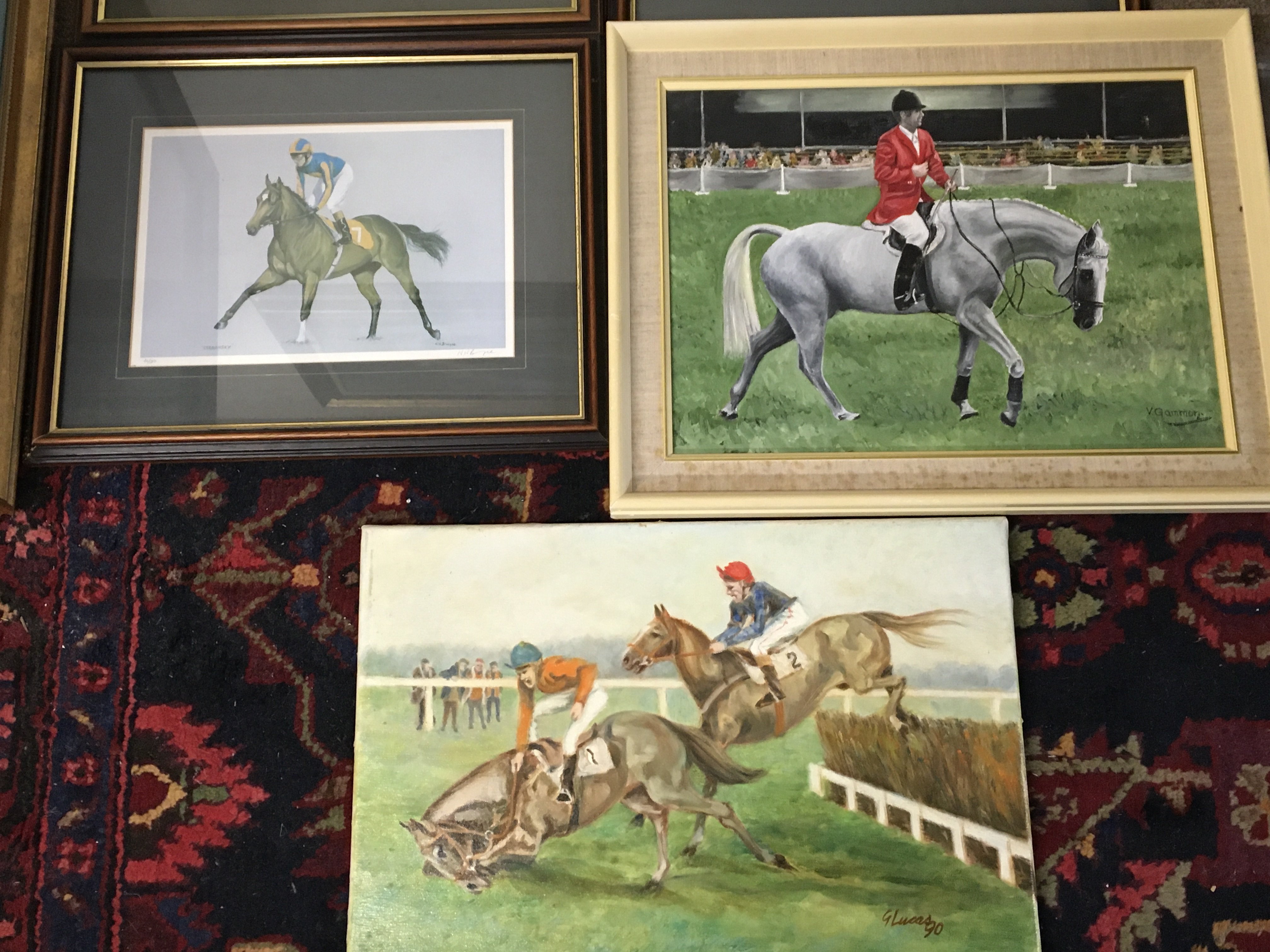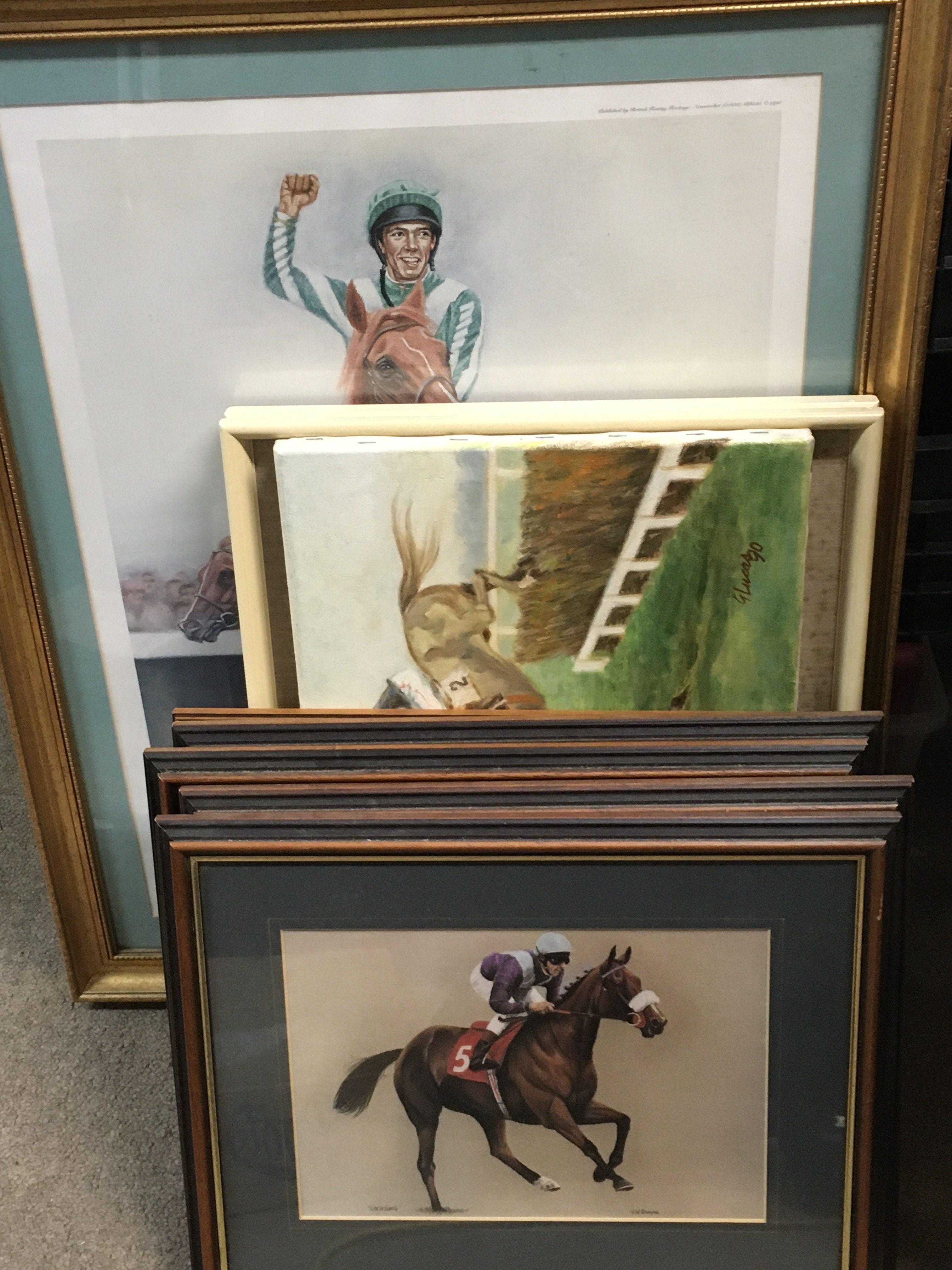 A collection of racing prints and oil on canvas paintings including prints by N.W Brunyee