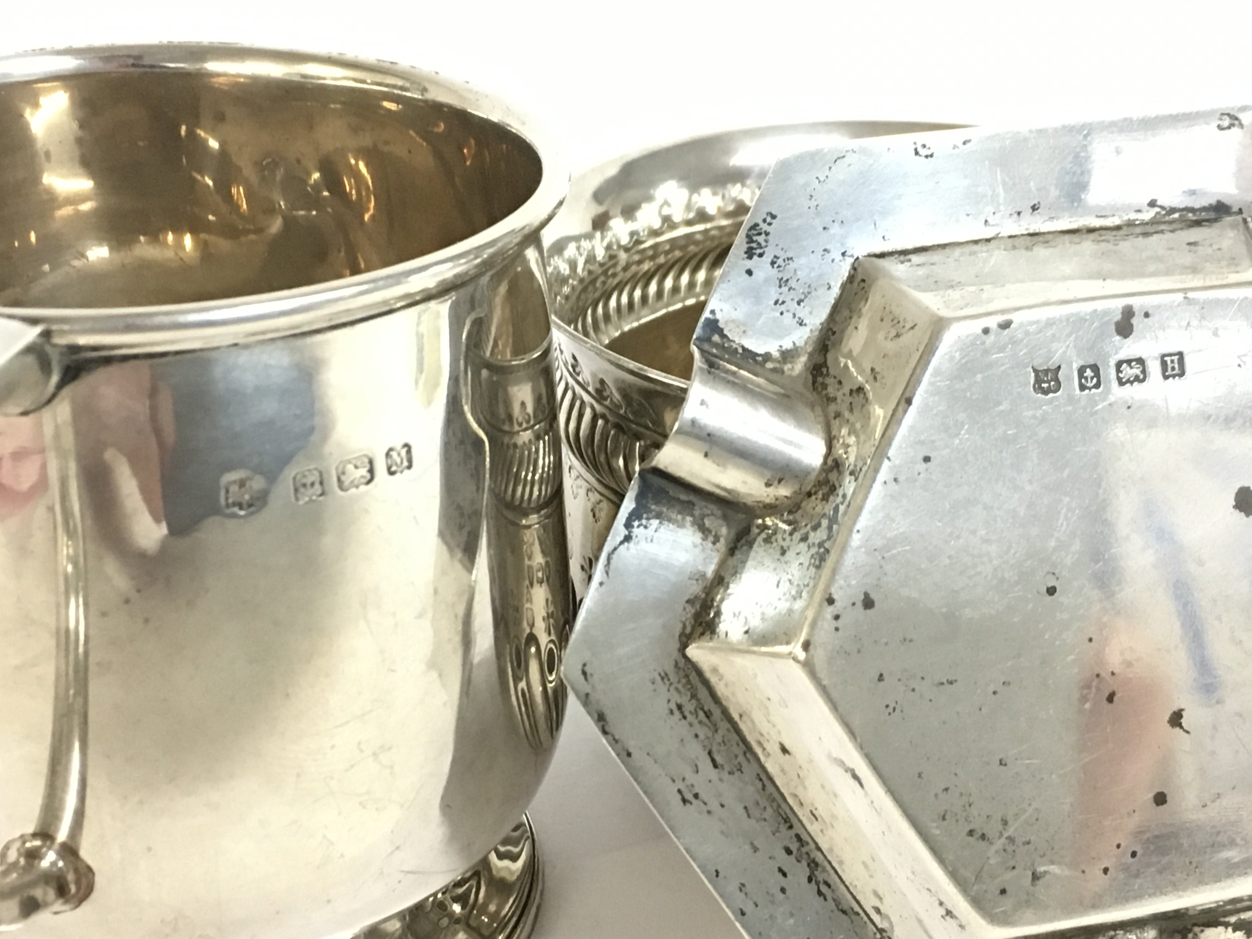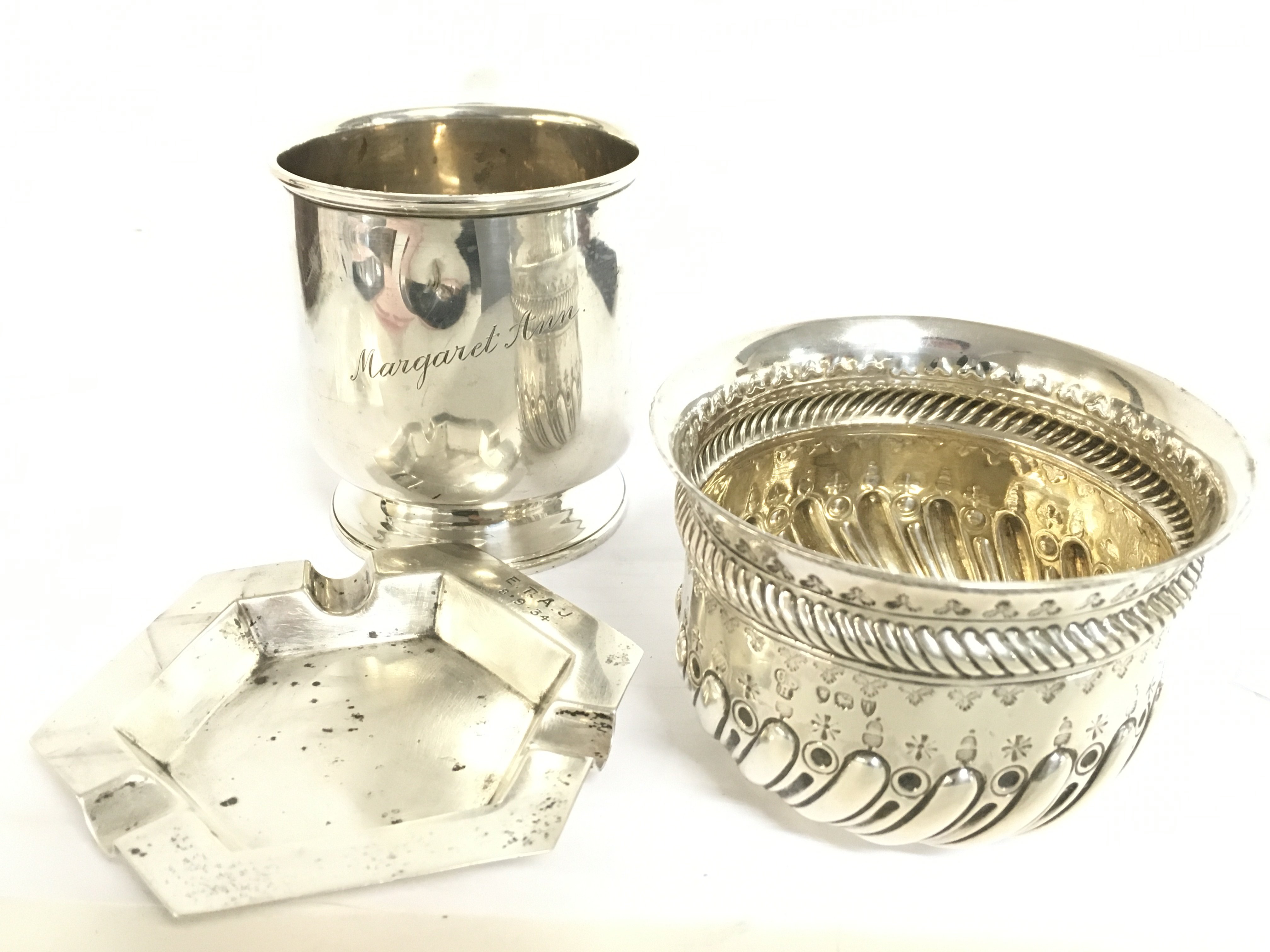 A collection of silver hallmarked items including a christening mug, bowl and ashtray. Postage category B