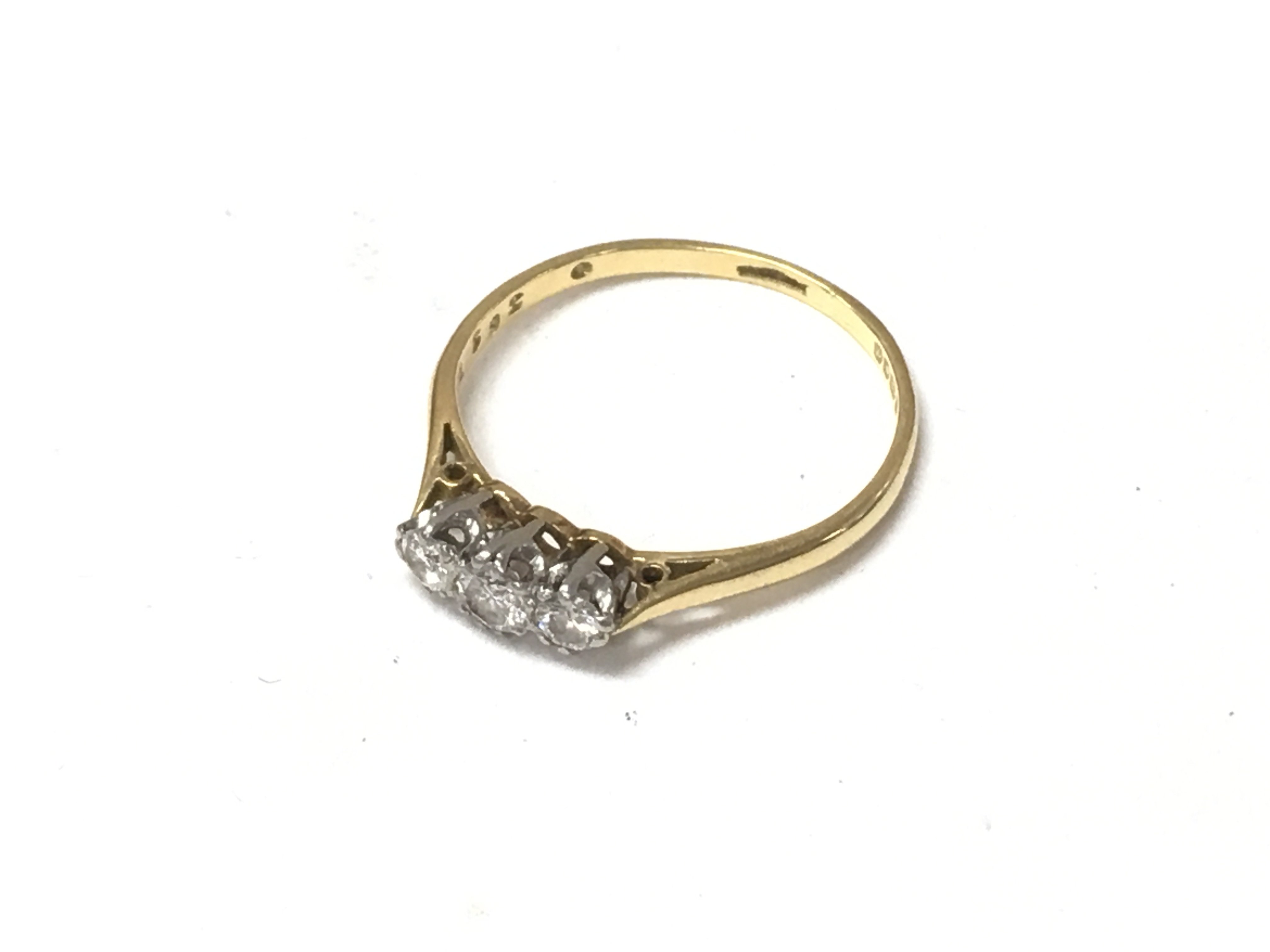 An 18ct gold three stone diamond set ring. Approx size M.