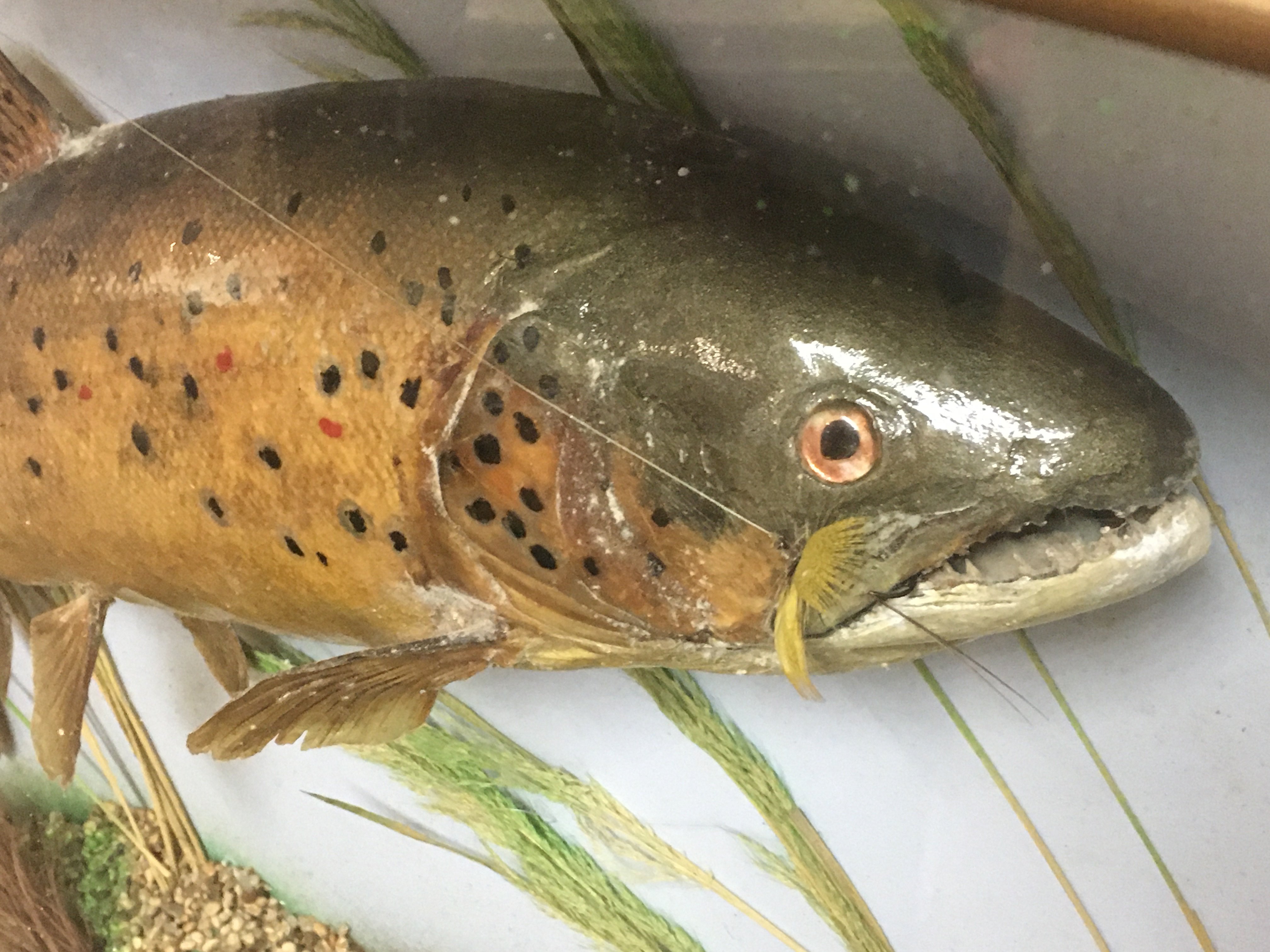 A cased taxidermy trout with fly in mouth. Case dimensions 14x56x49cm. This lot cannot be posted