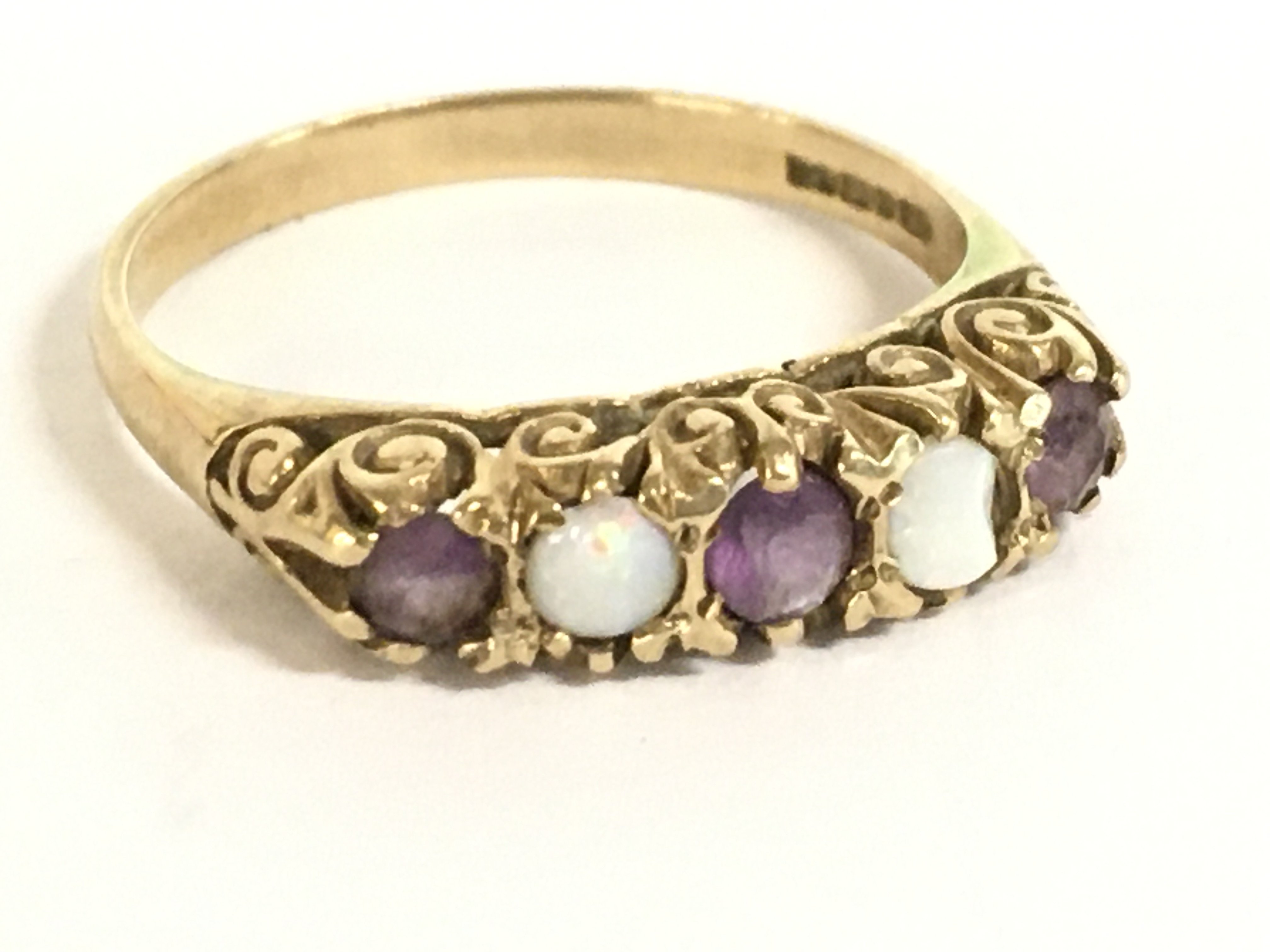 A 9 carat gold opal and amethyst, 2.3g. Size O Postage category A