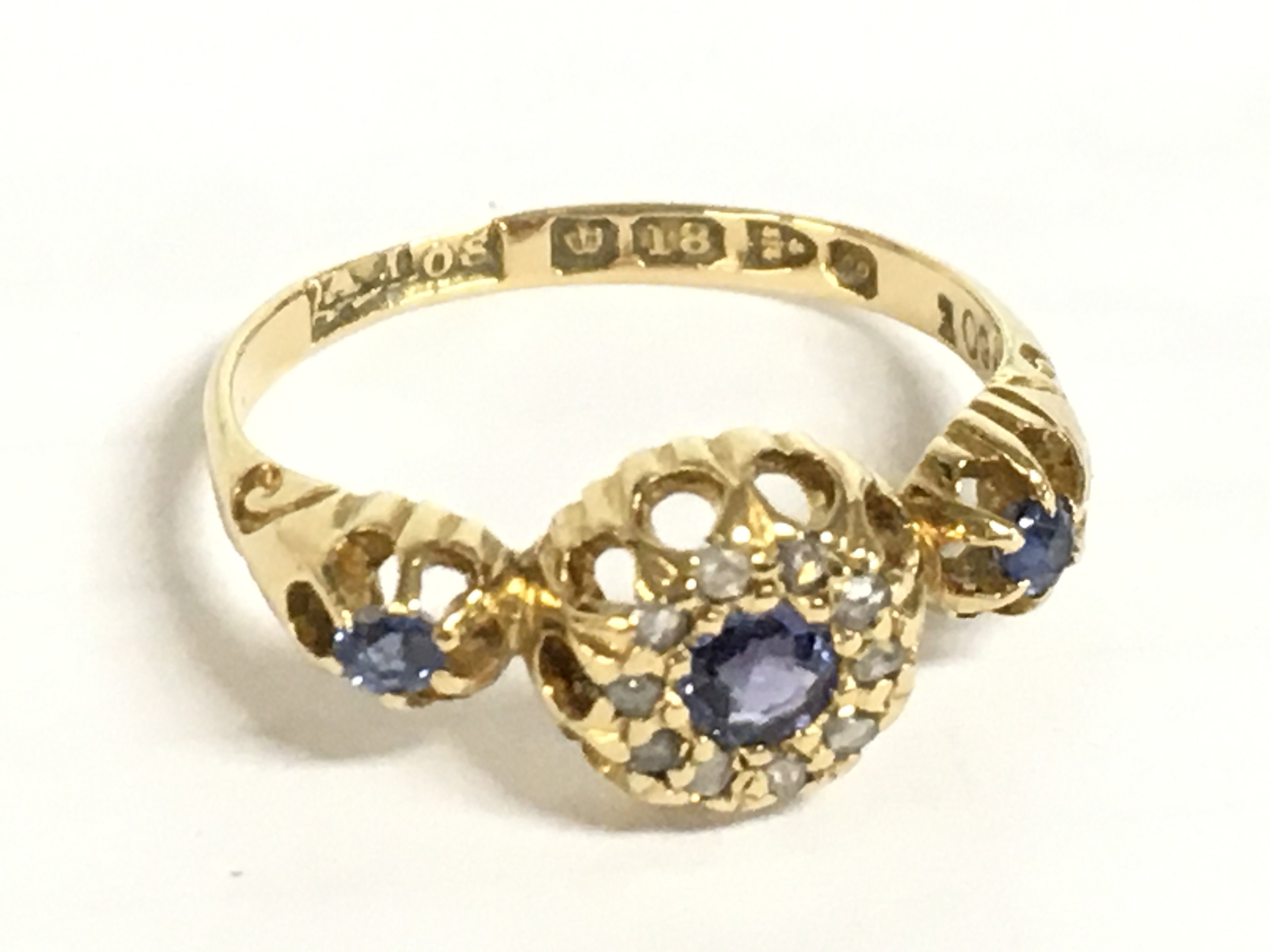 An 18ct gold sapphire and diamond three panel ring, 2.1g. Size J. Postage category A