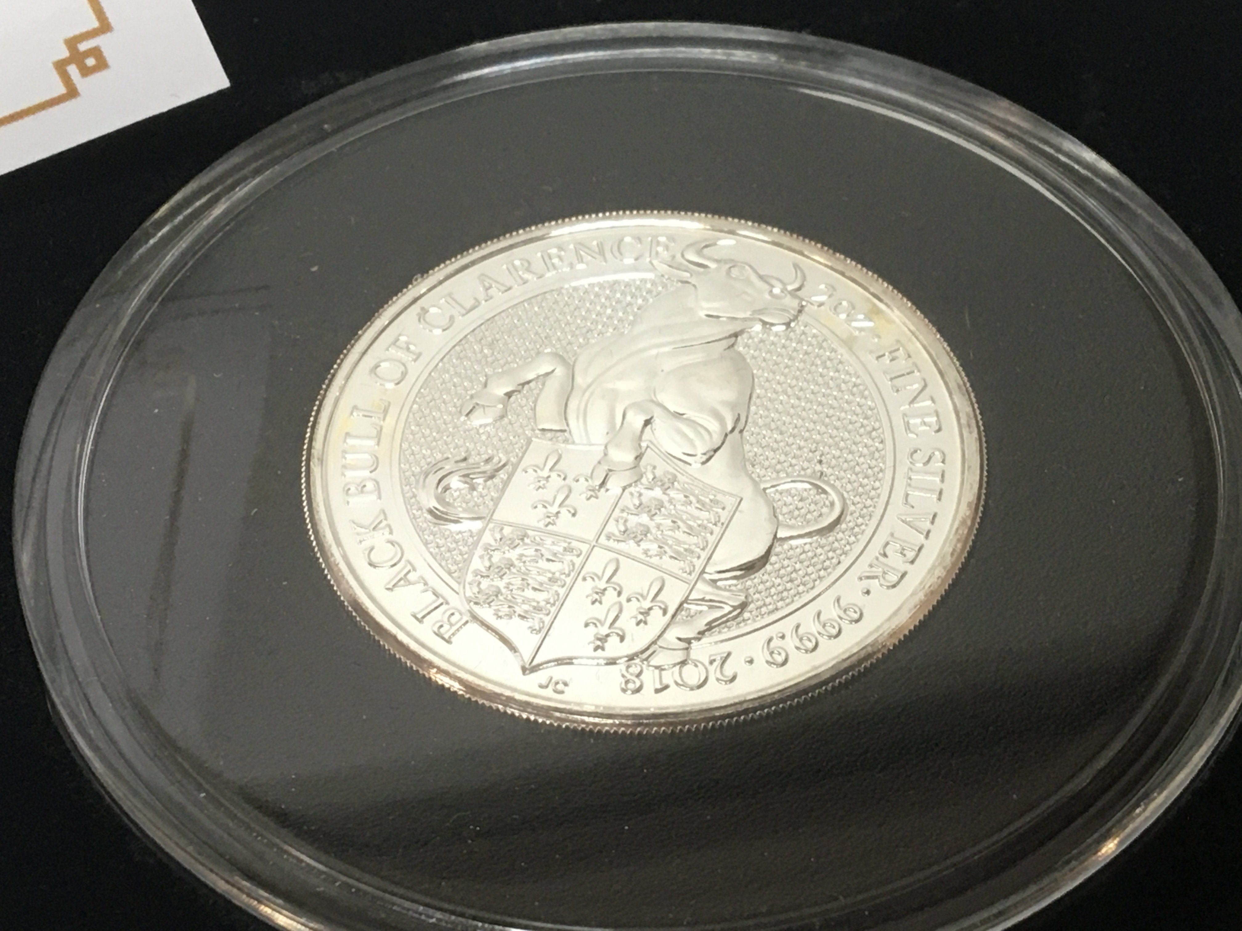 A Querns Beast silver 2018 two ounce coin The black Bull of Clarence. With certificate of Authenticity the dim in sealed Perspex case and fitted box.