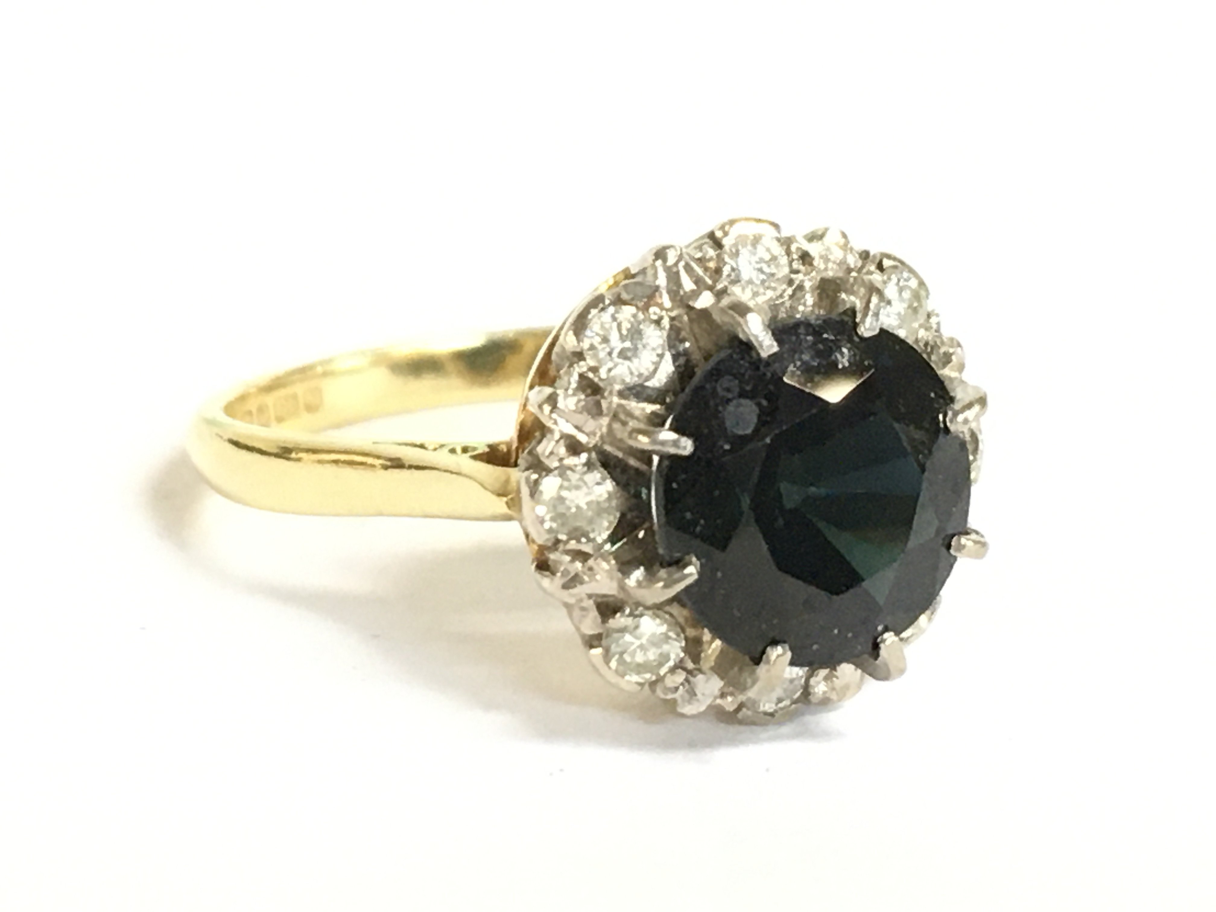 An 18ct gold black sapphire and diamond cluster ring, 5g, size P. Postage category A
