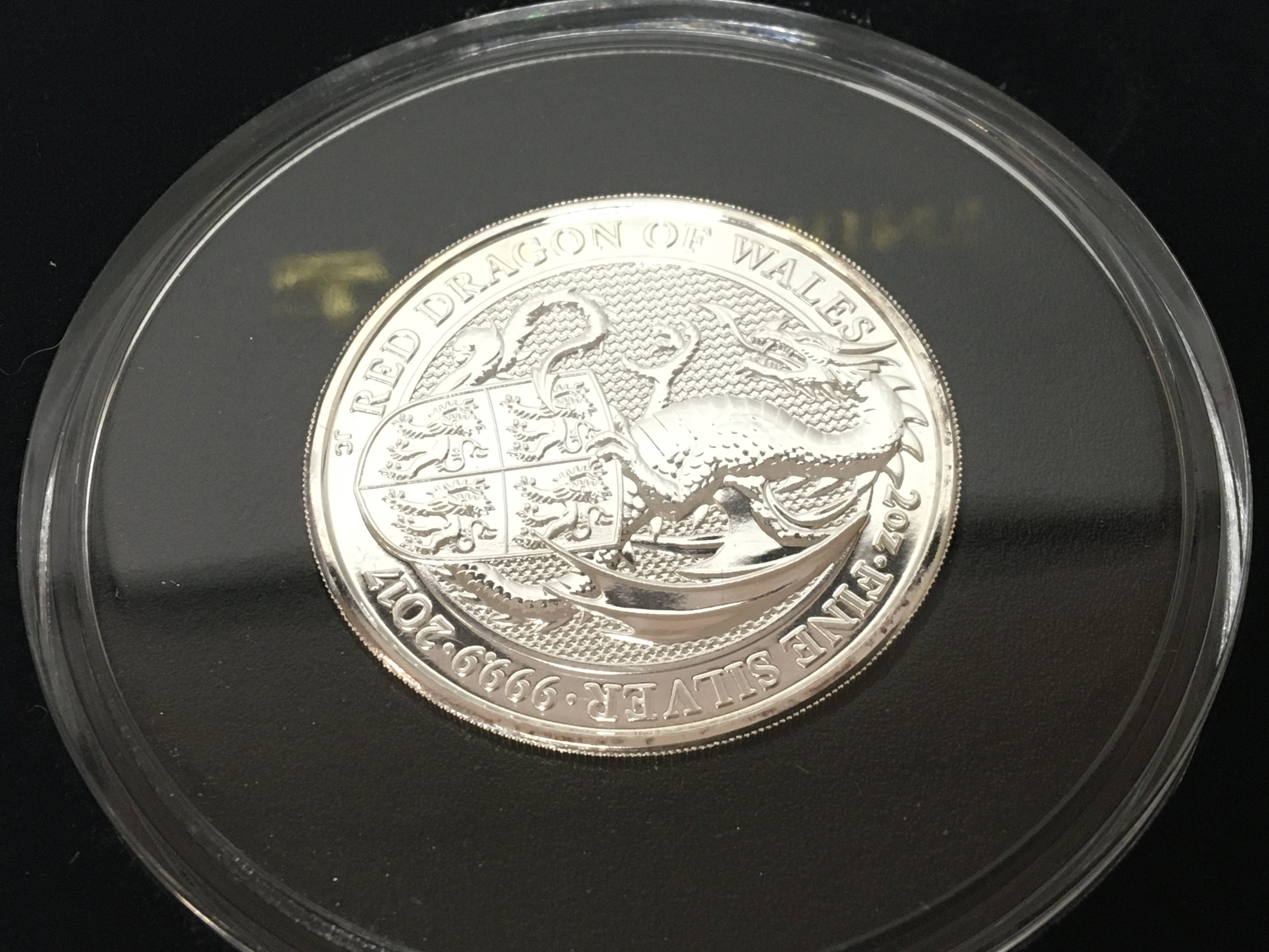 A Silver Two Ounce coin The Querns Beast Red Dragon of Wales 2017. With certificate of Authenticity the coin in a sealed Perspex case and fitted box