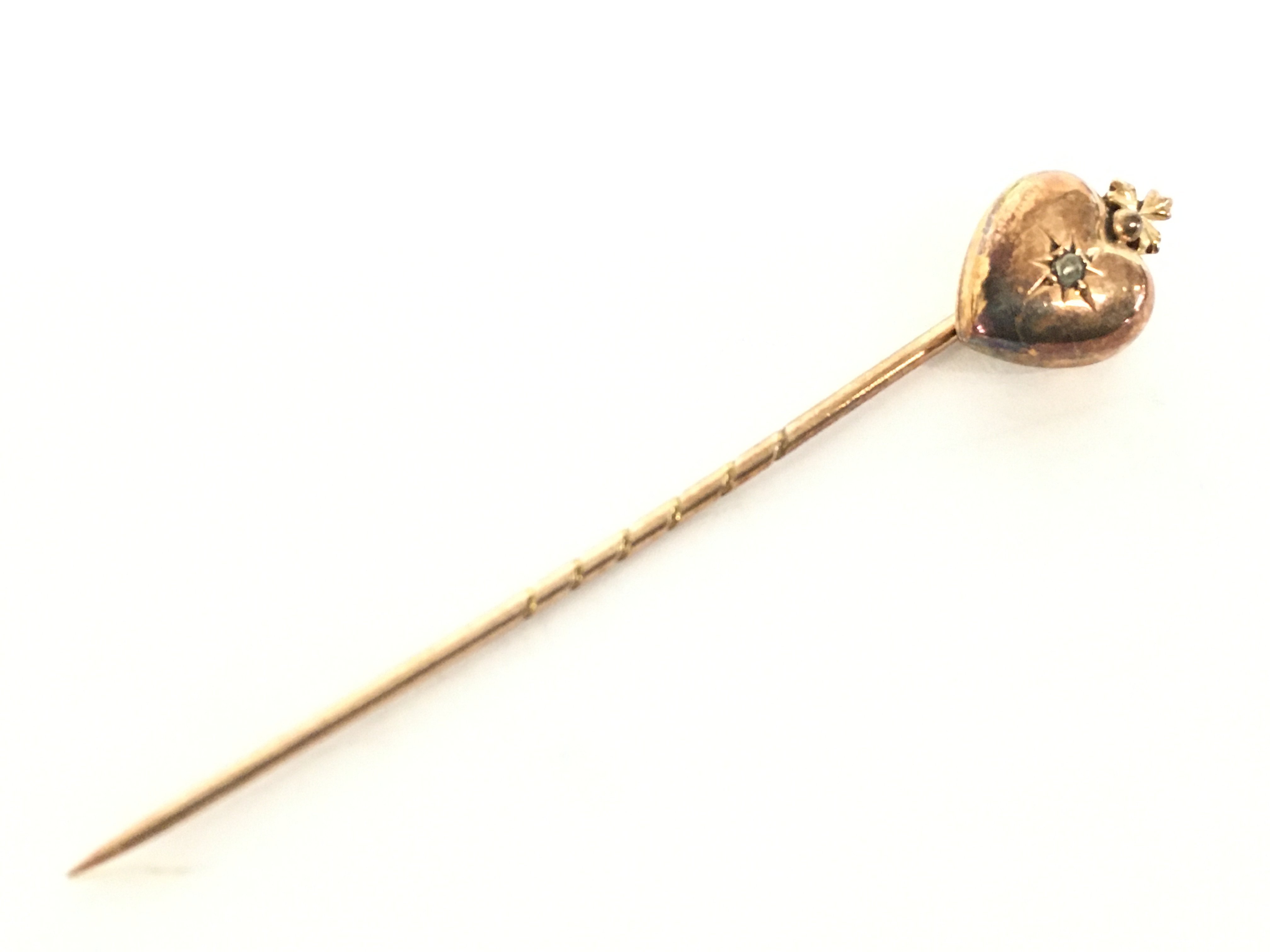A 9 carat rose gold and diamond heart stick pin, 0.8g, postage category A