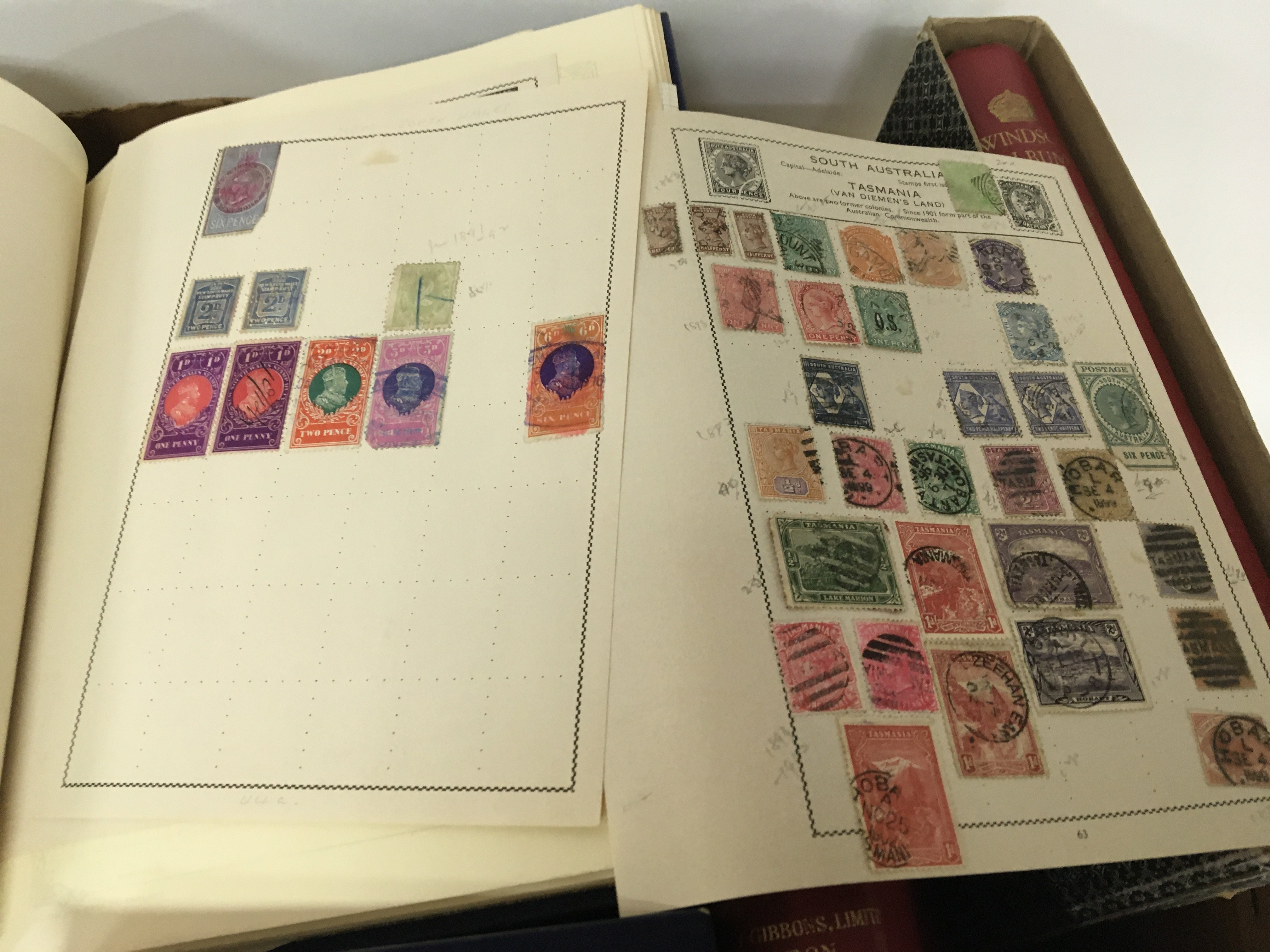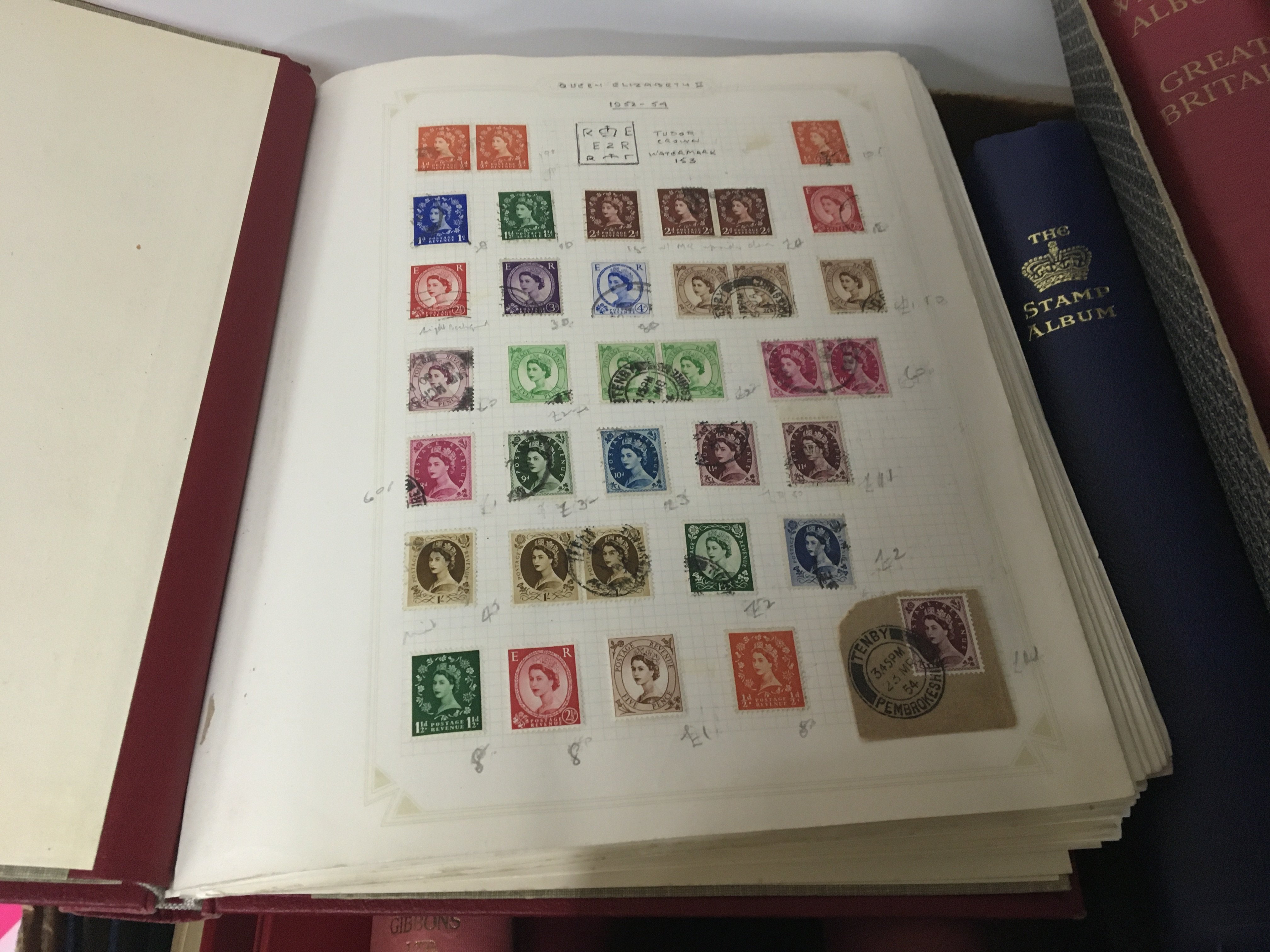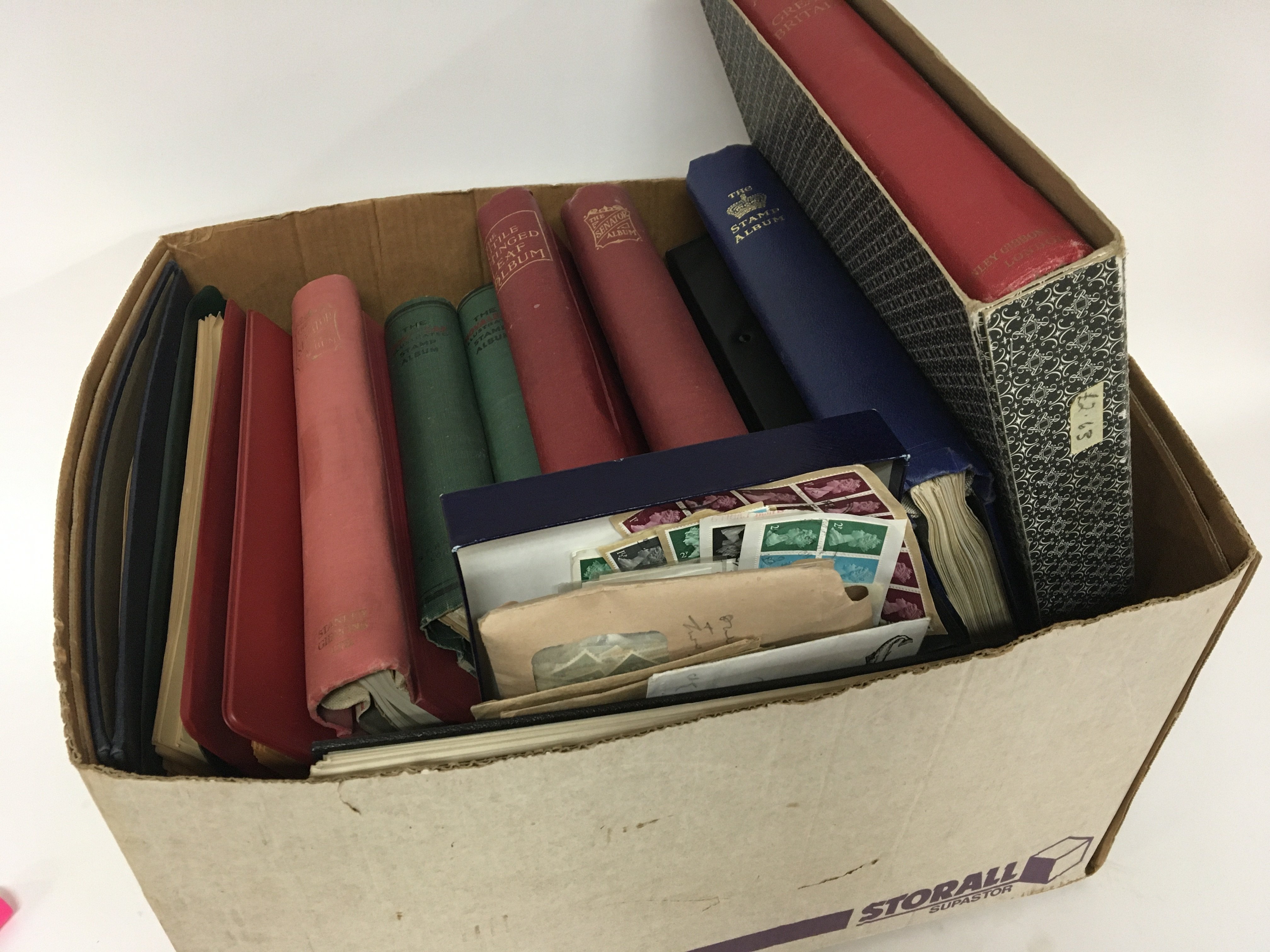 A box containing twelve albums of stamps including used Victorian Empire and Commonwealth stamps and later stamps including world stamps most are used stamps a mixed lot.