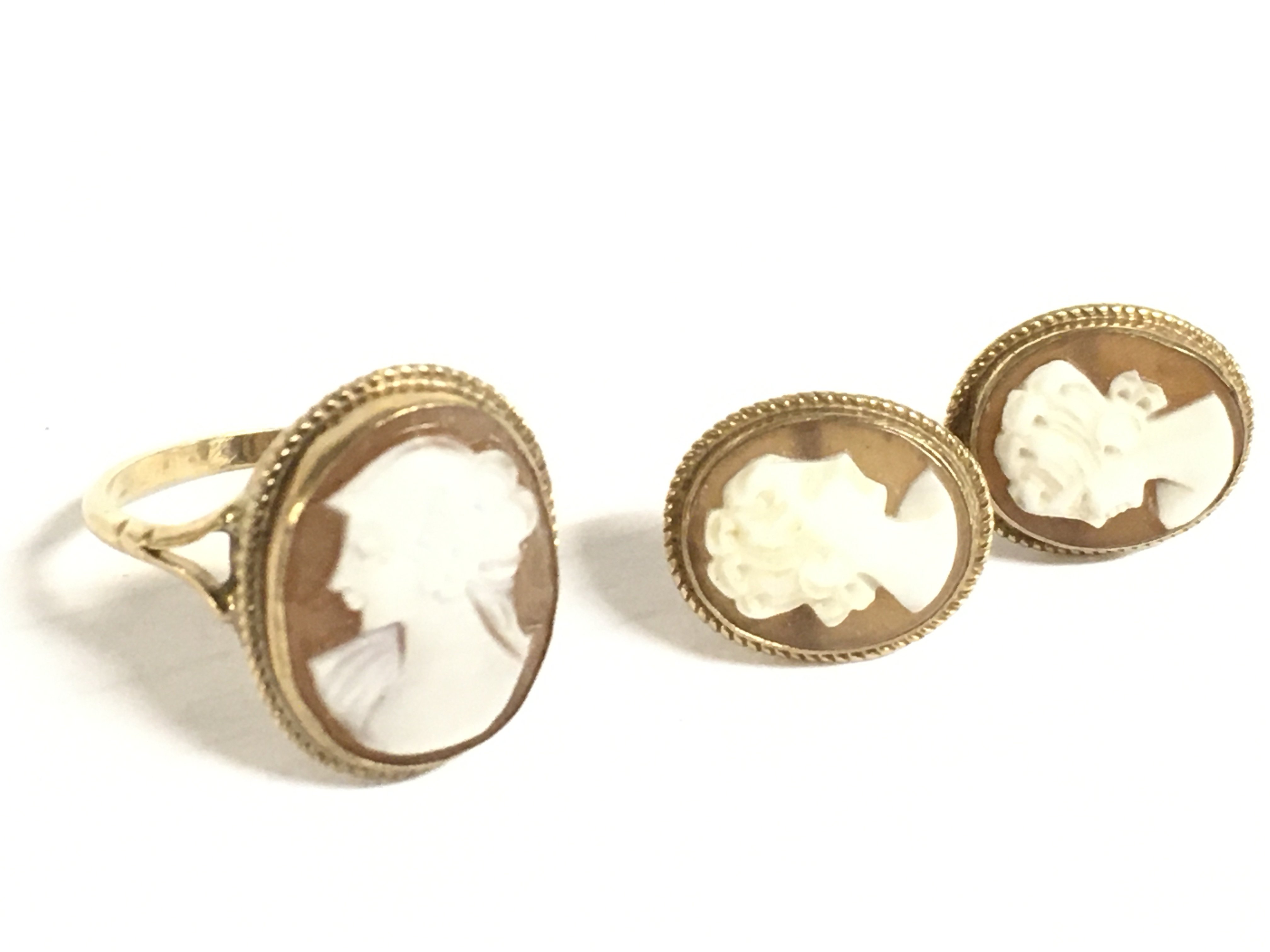 A 9ct gold cameo ring (size P) and earrings. 4.8g total weight. Postage category A