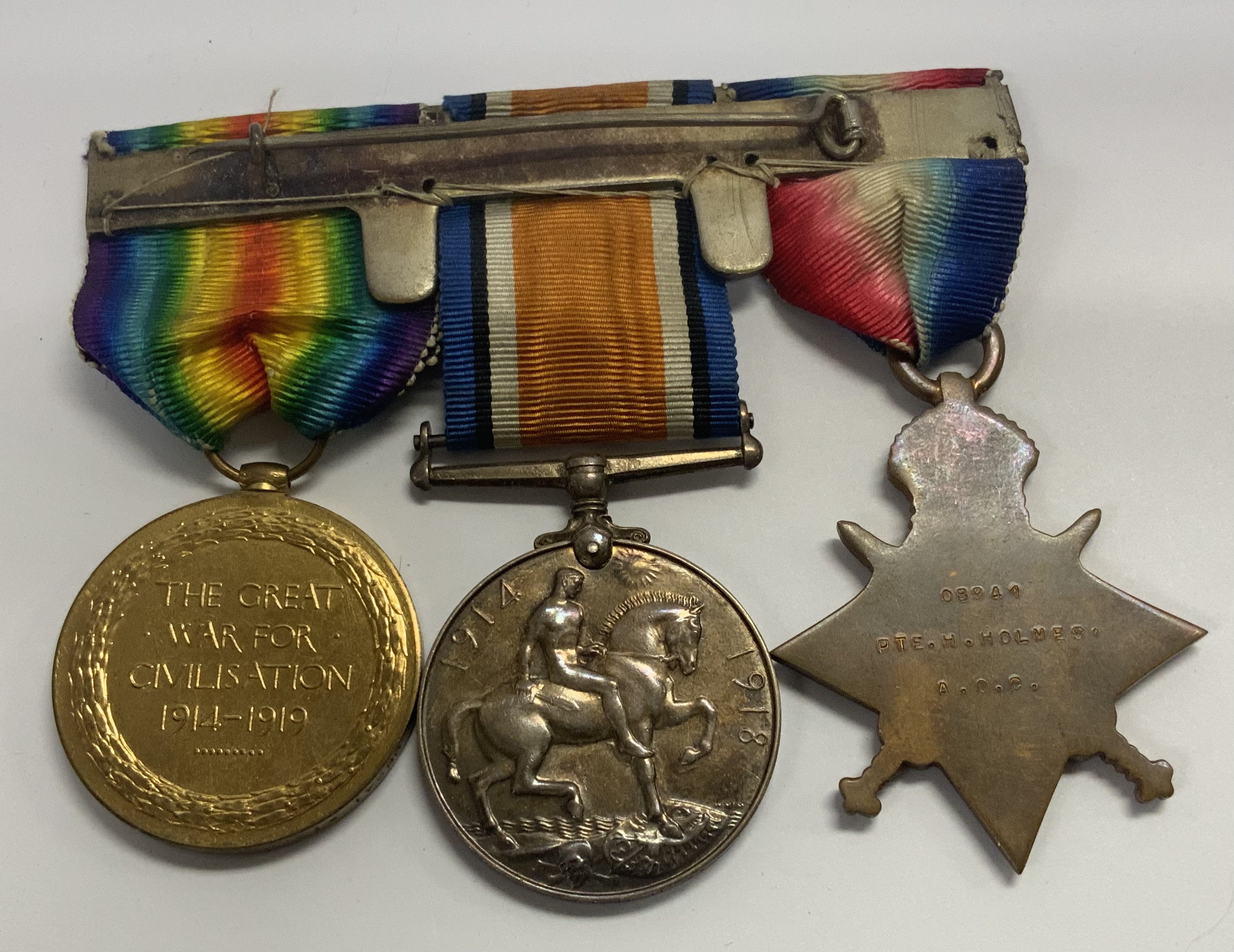 3 WW1 Issue medals, awarded to 08941 Pte. H. Holmes A.O.C