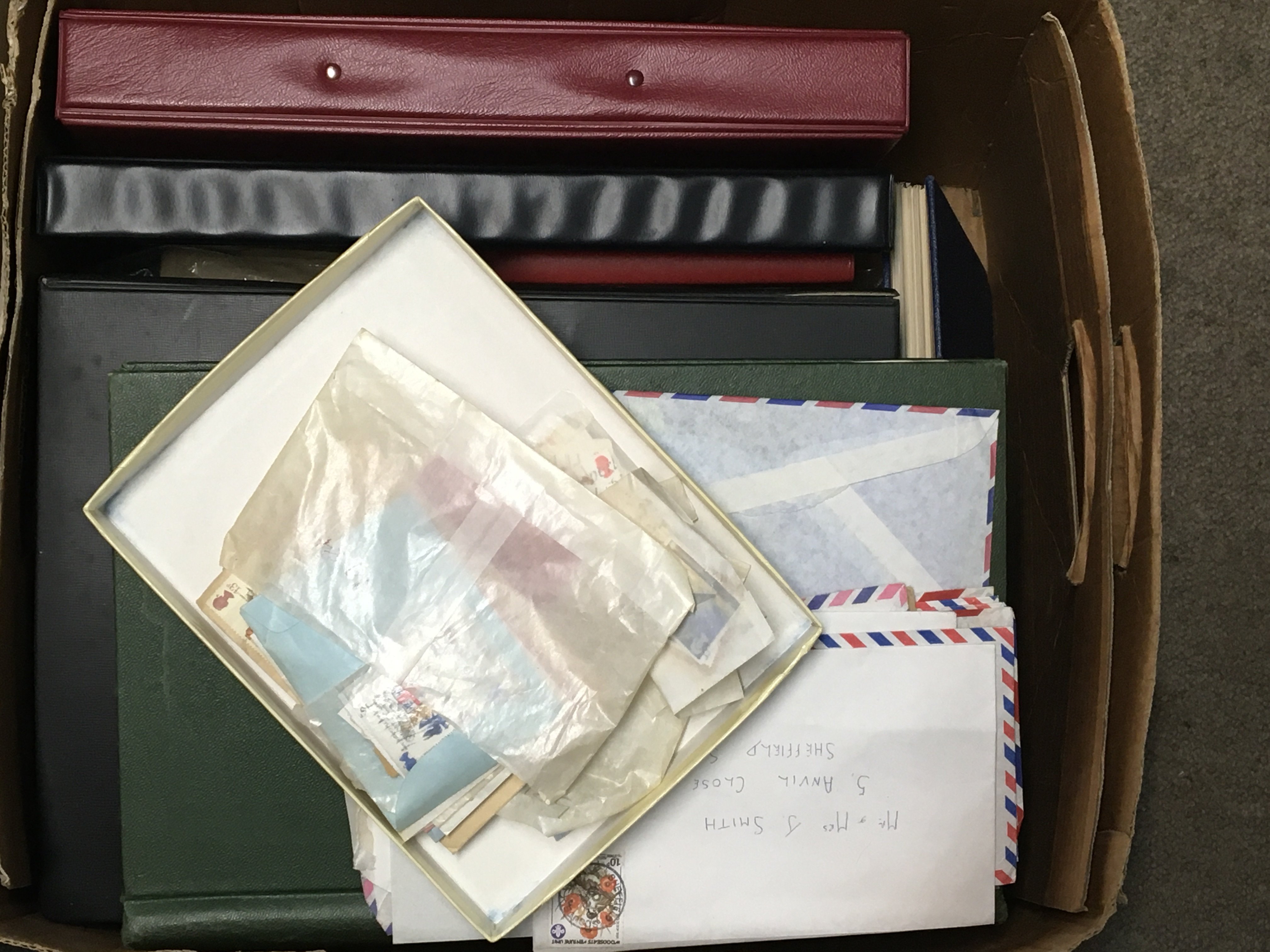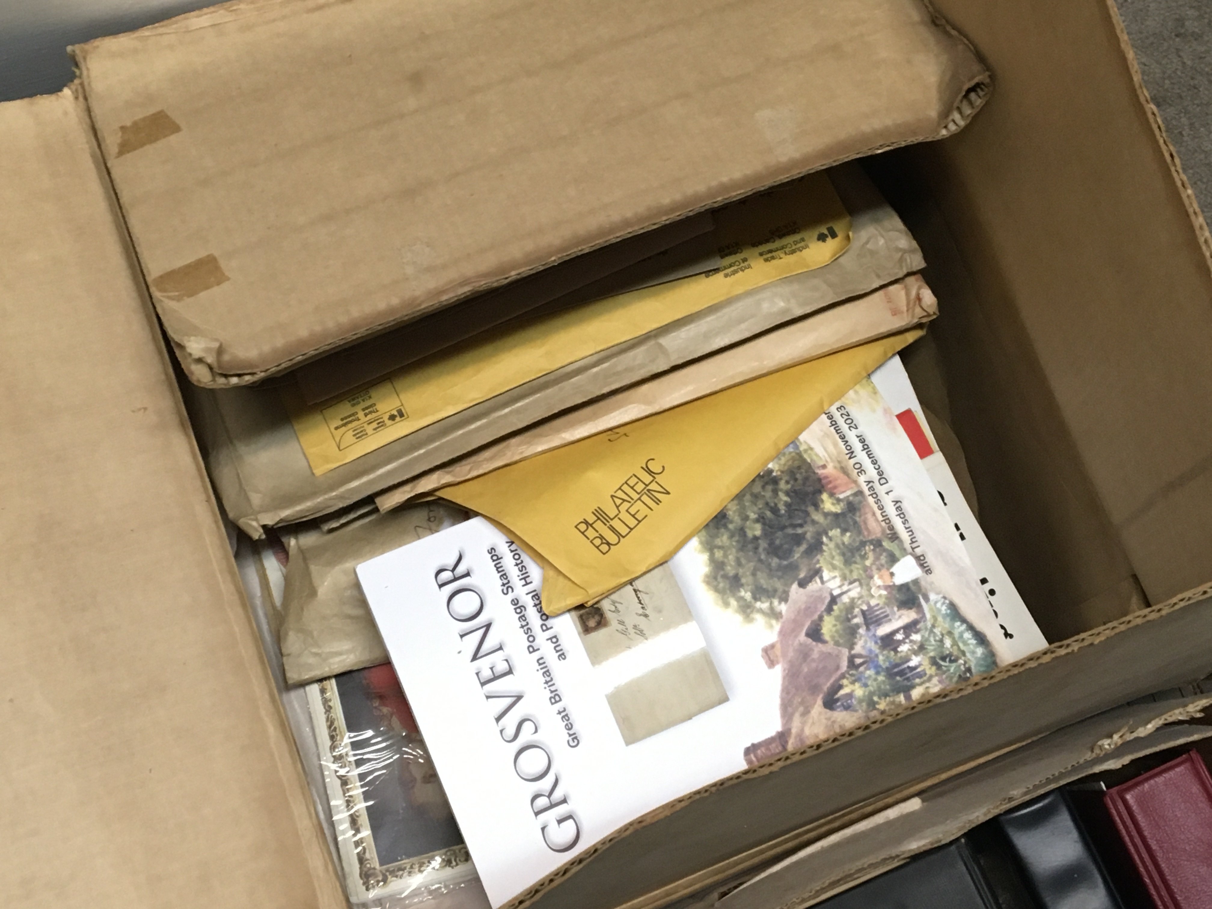 Three boxes containing stamp albums boxes of loose stamps and other associated ephemera.