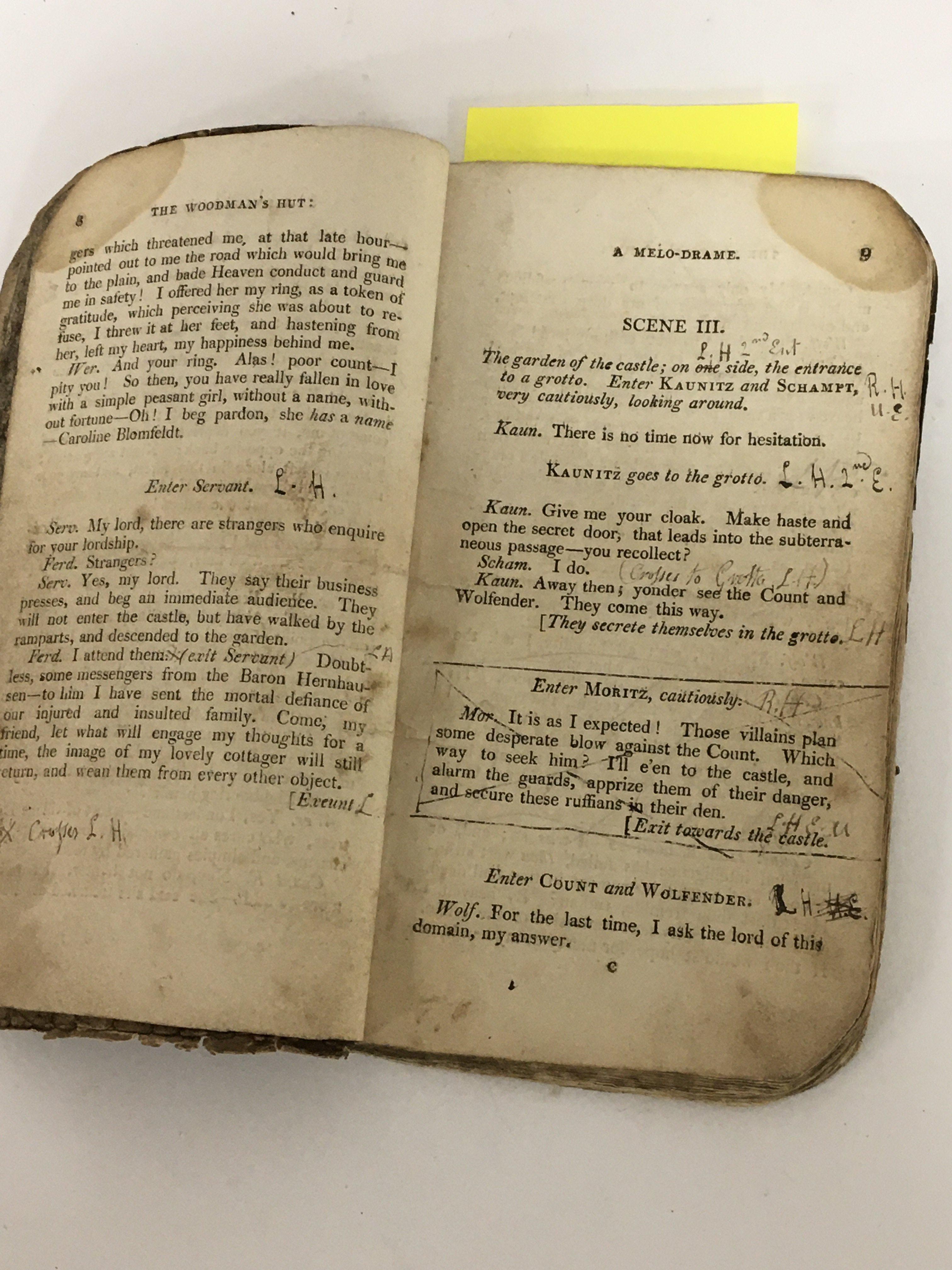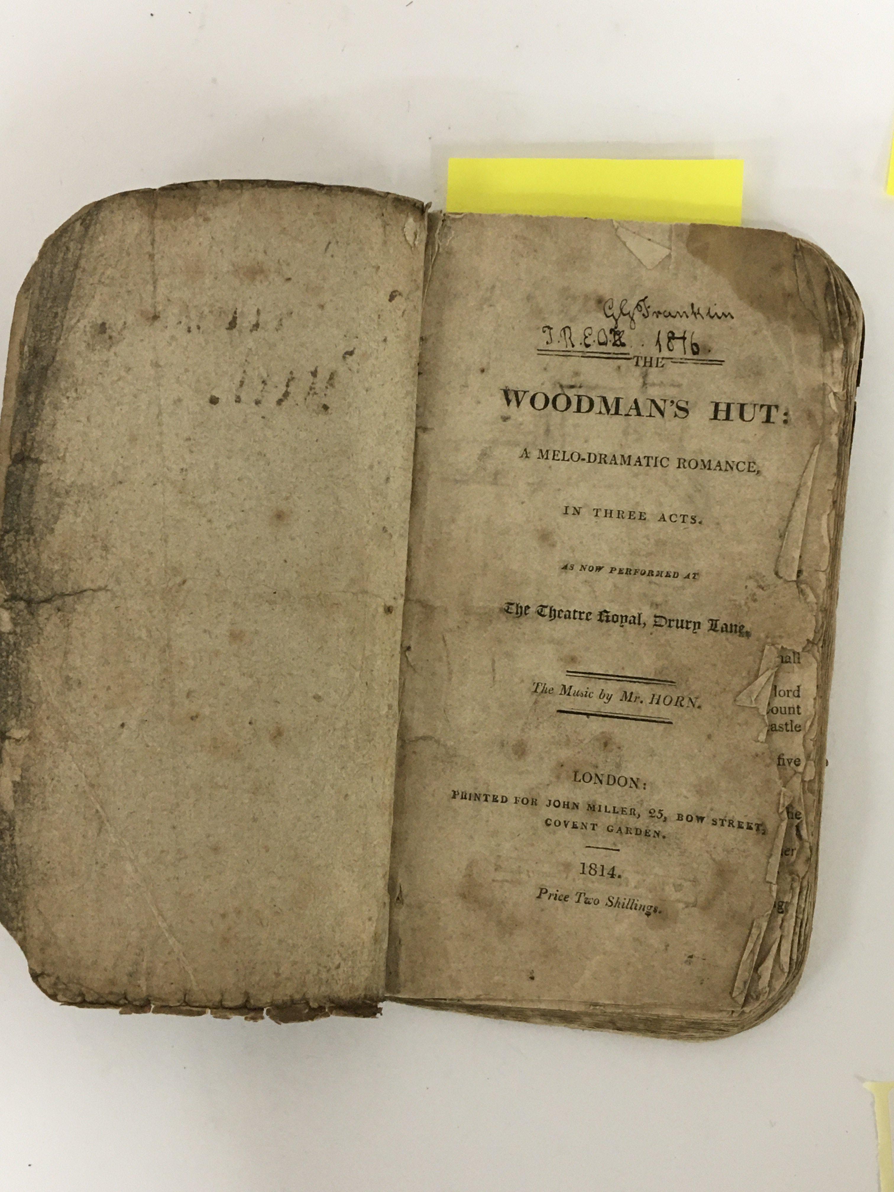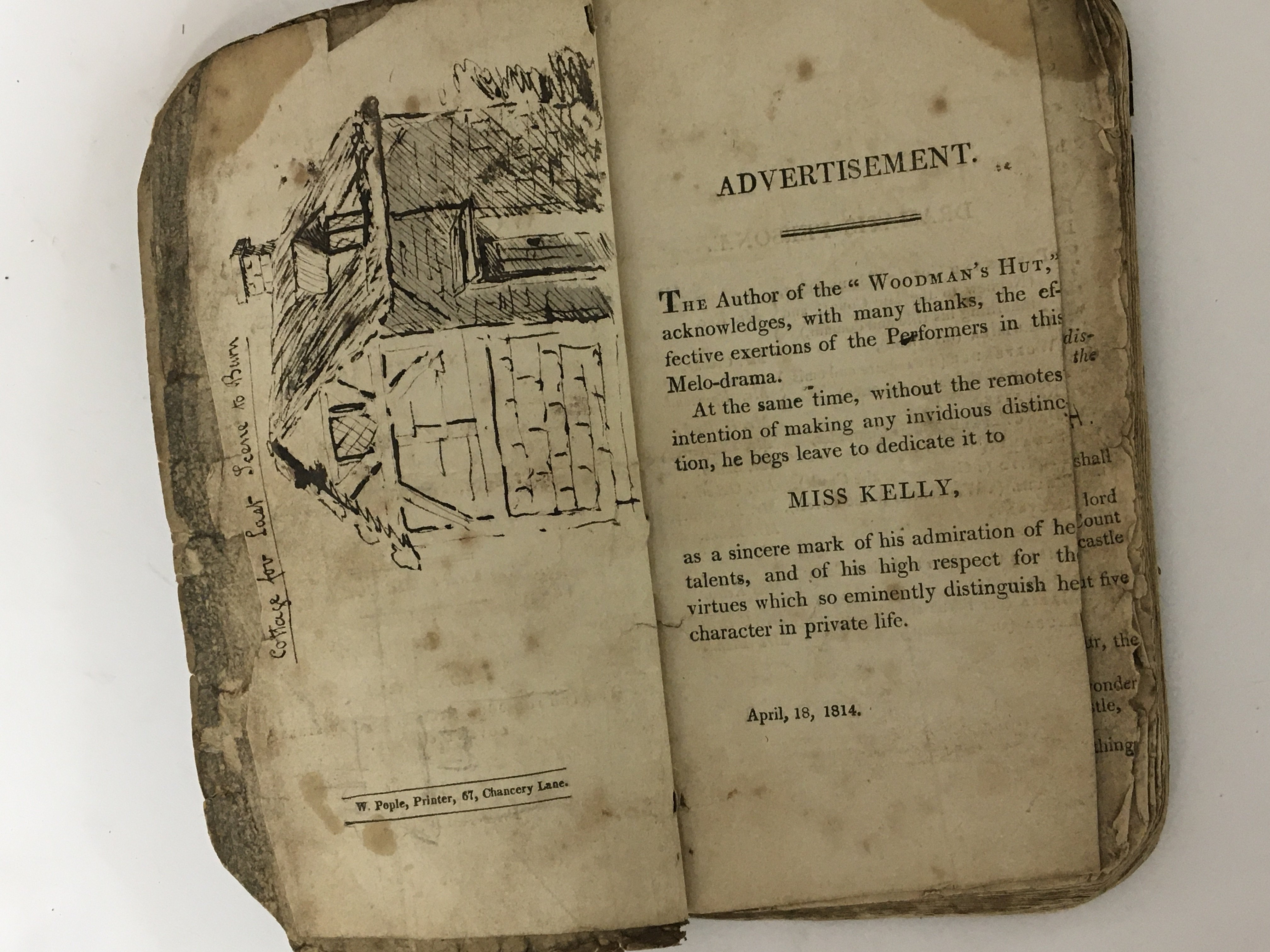 An interesting 1814 Theatre play script Woodmans Hut with additional handwriting inscription printed for John Miller 25 Bow Street Covent Garden. Performed at the The Theatre Royal Dury Lane London.