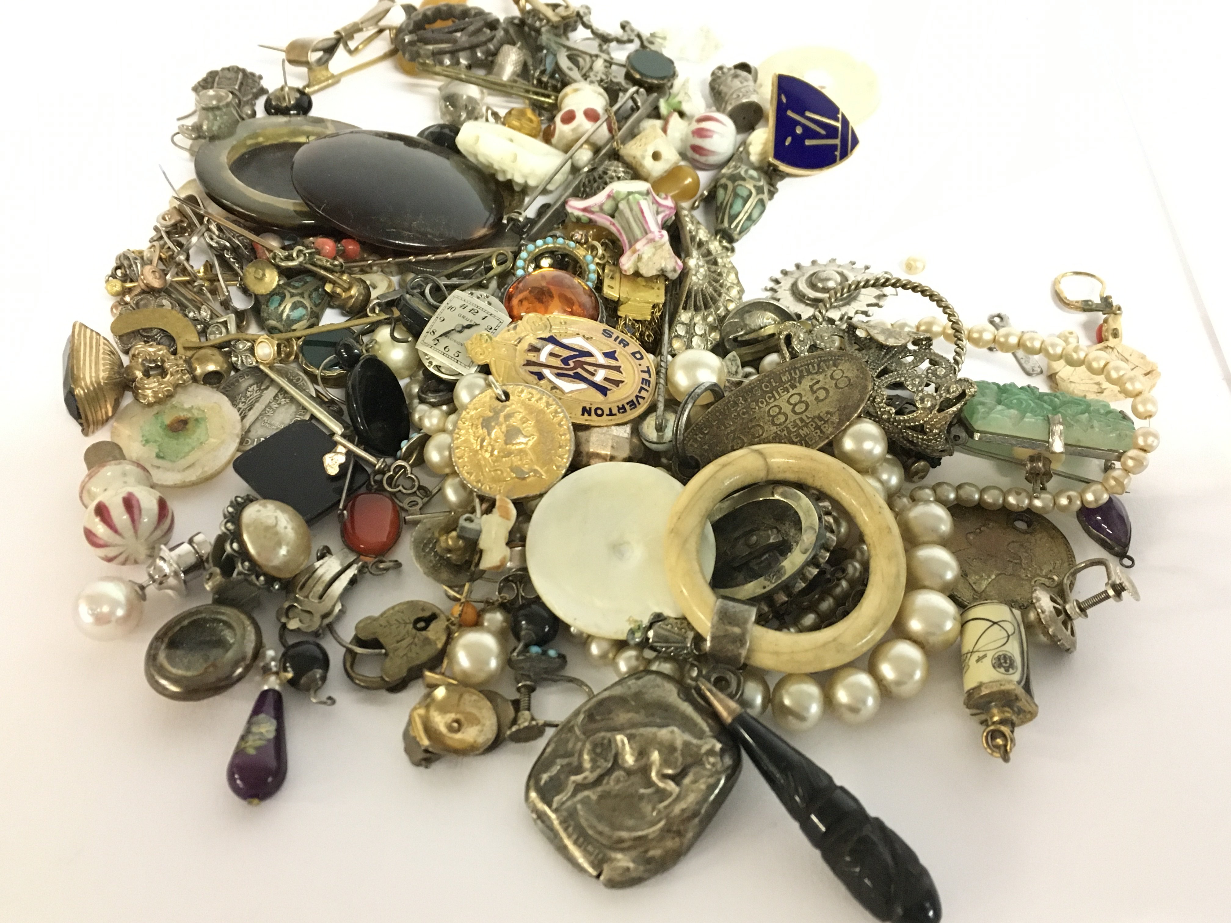 A collection of antique jewellery including a silver hallmarked bull rattle, earrings, stick pins, pendants etc