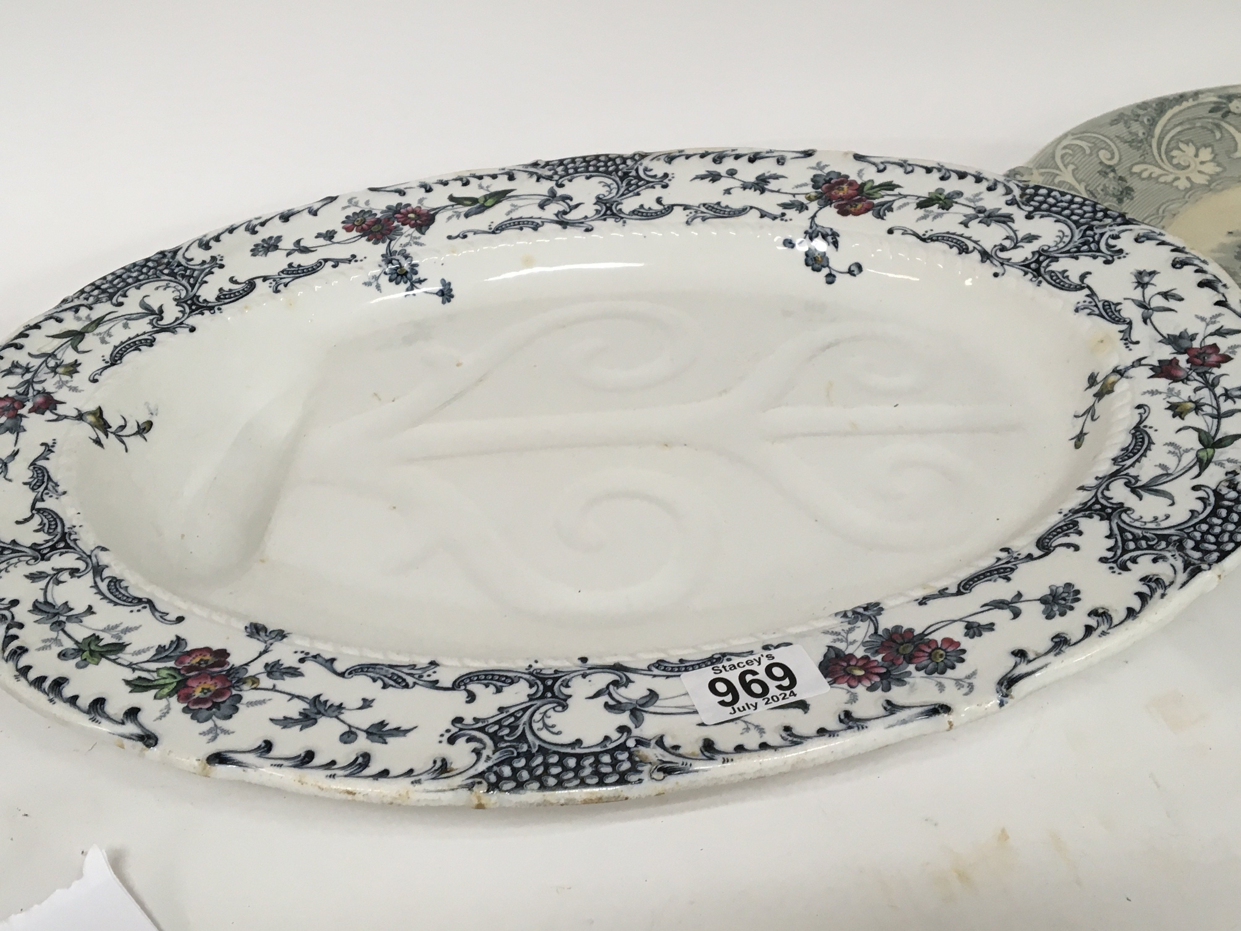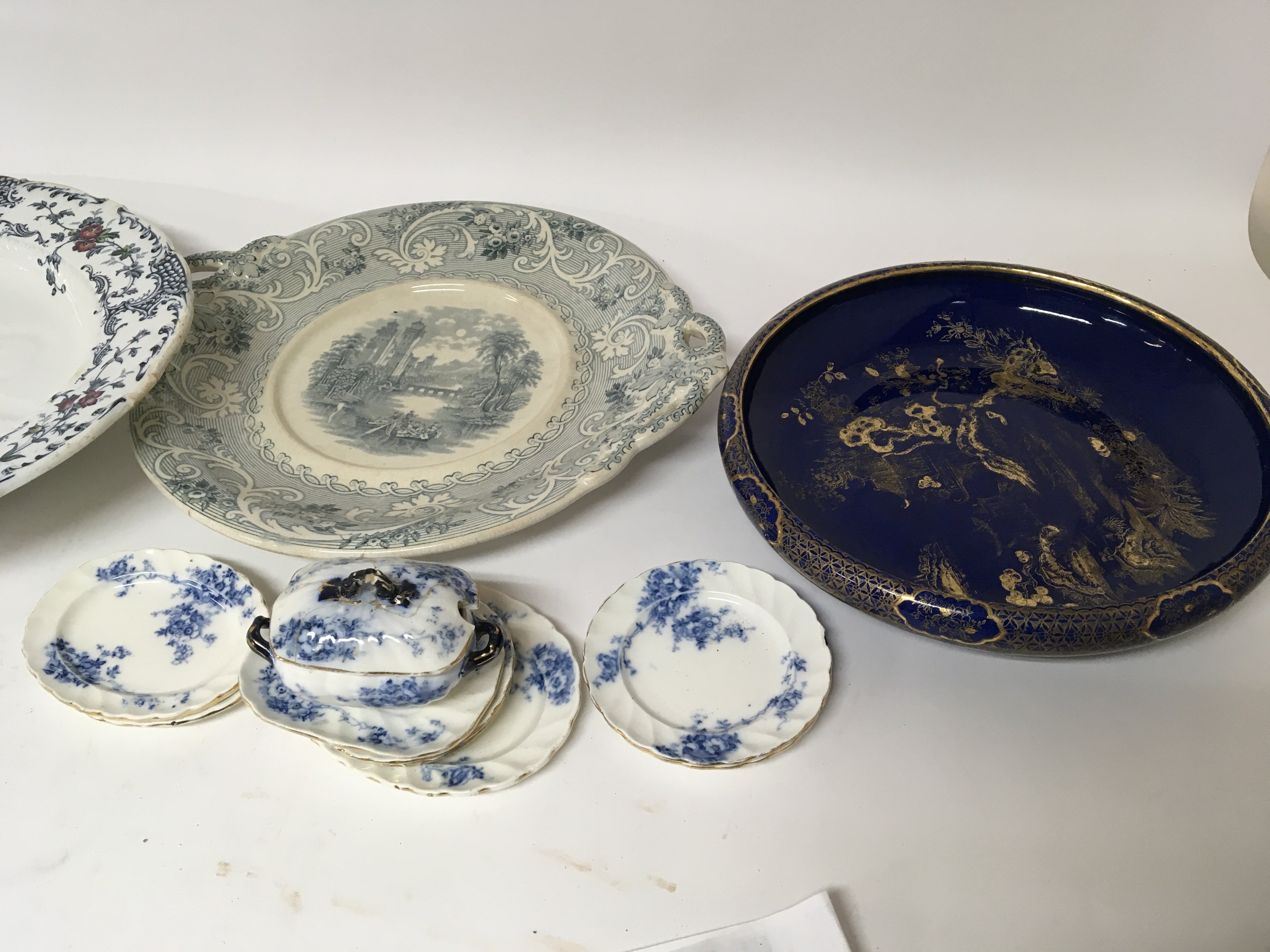 A Victorian ceramic Turkey plate a Wilton ware blue glazed bowl a part late Victorian ceramic dinner set and one other dish.