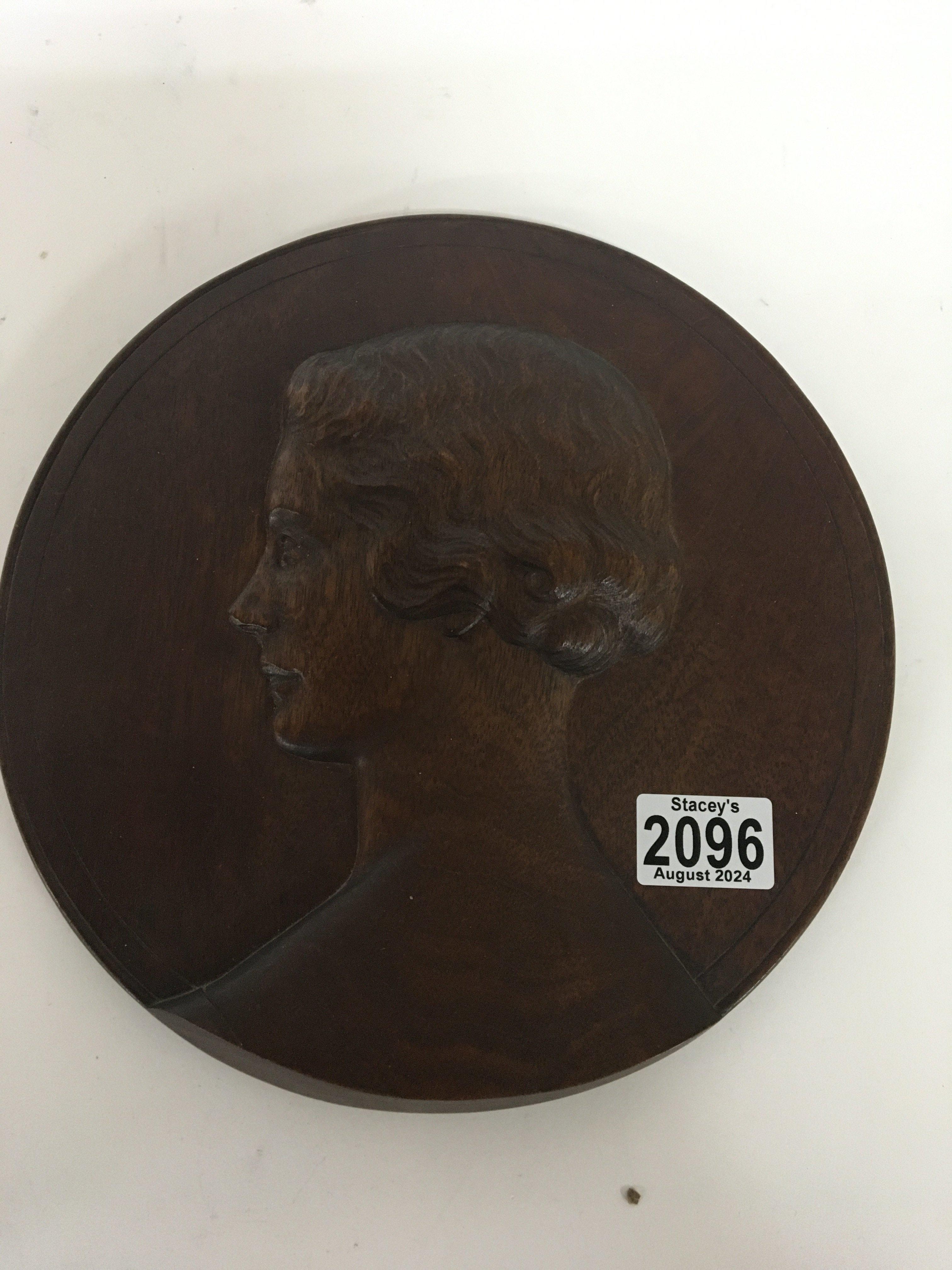A 20th century carved wood plaque depicting a side profile of a lady possibly 1920s no damage diameter 27cm.