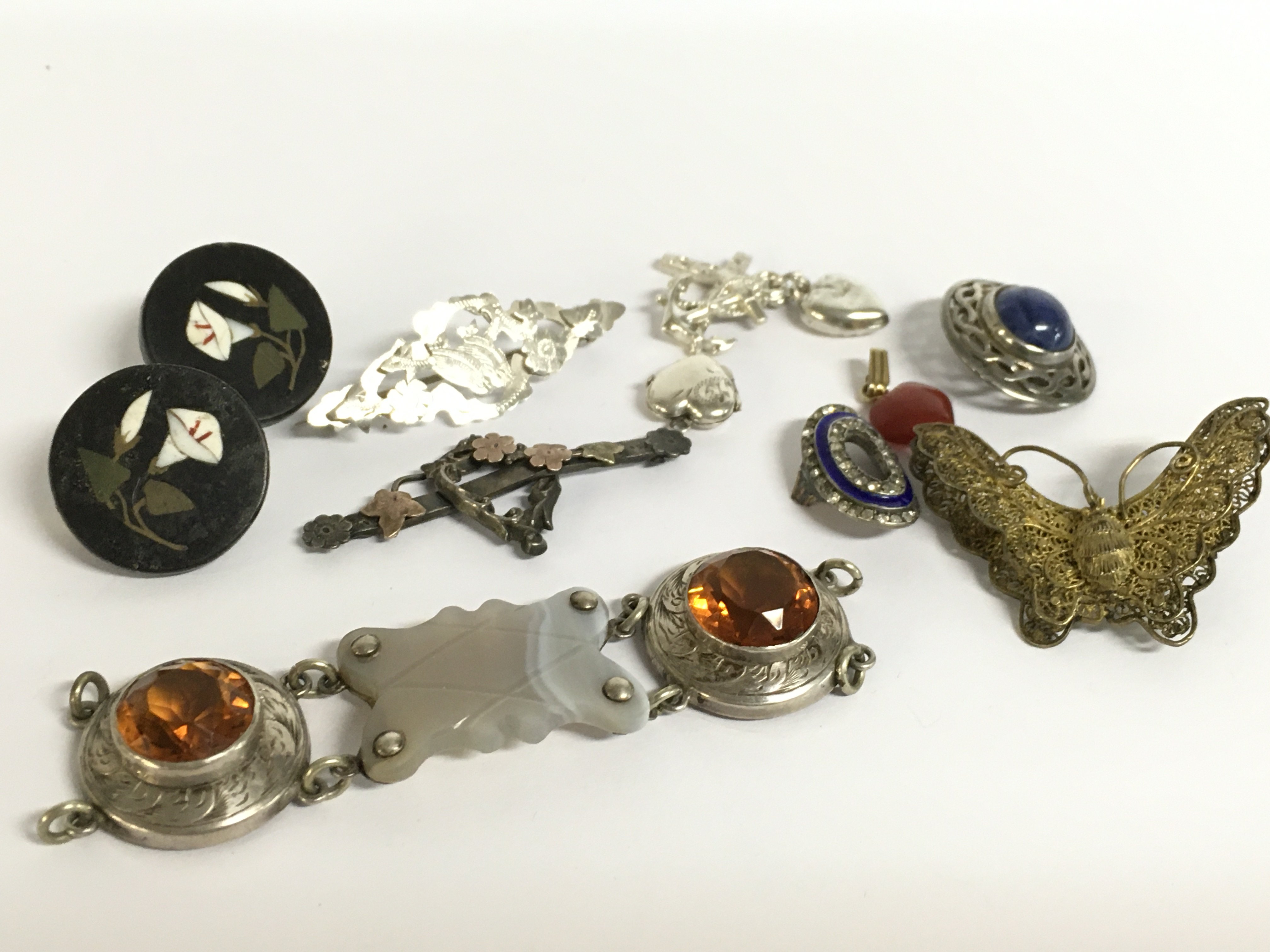 Antique jewellery including brooches, pendants, agate, some silver. Postage category a