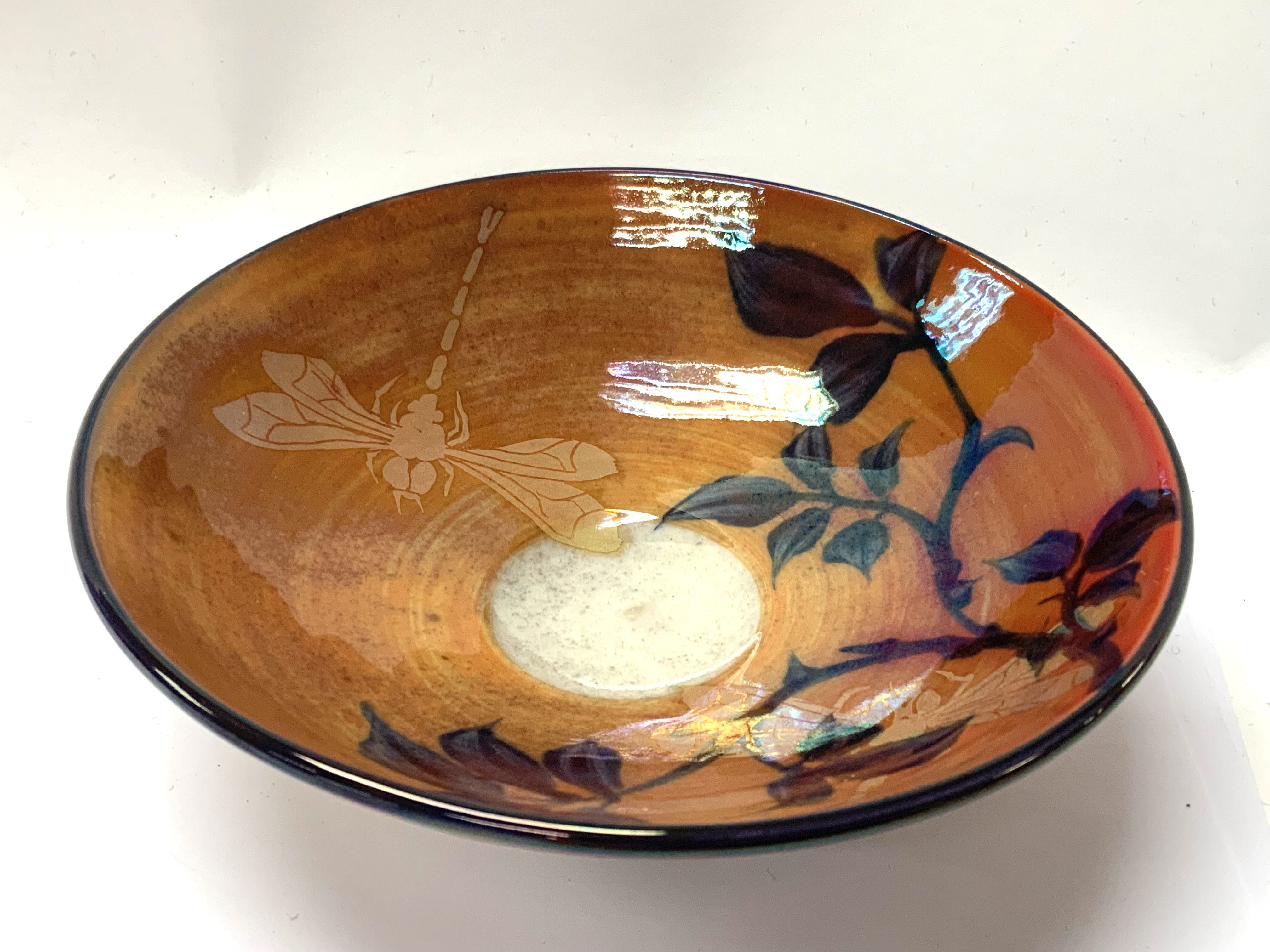A Jonathan Chiswell-Jones lustre porcelain bowl, decorated in silver lustre with orange ground, dragonfly and foliage, 16cm x 5.5cm. NO RESERVE