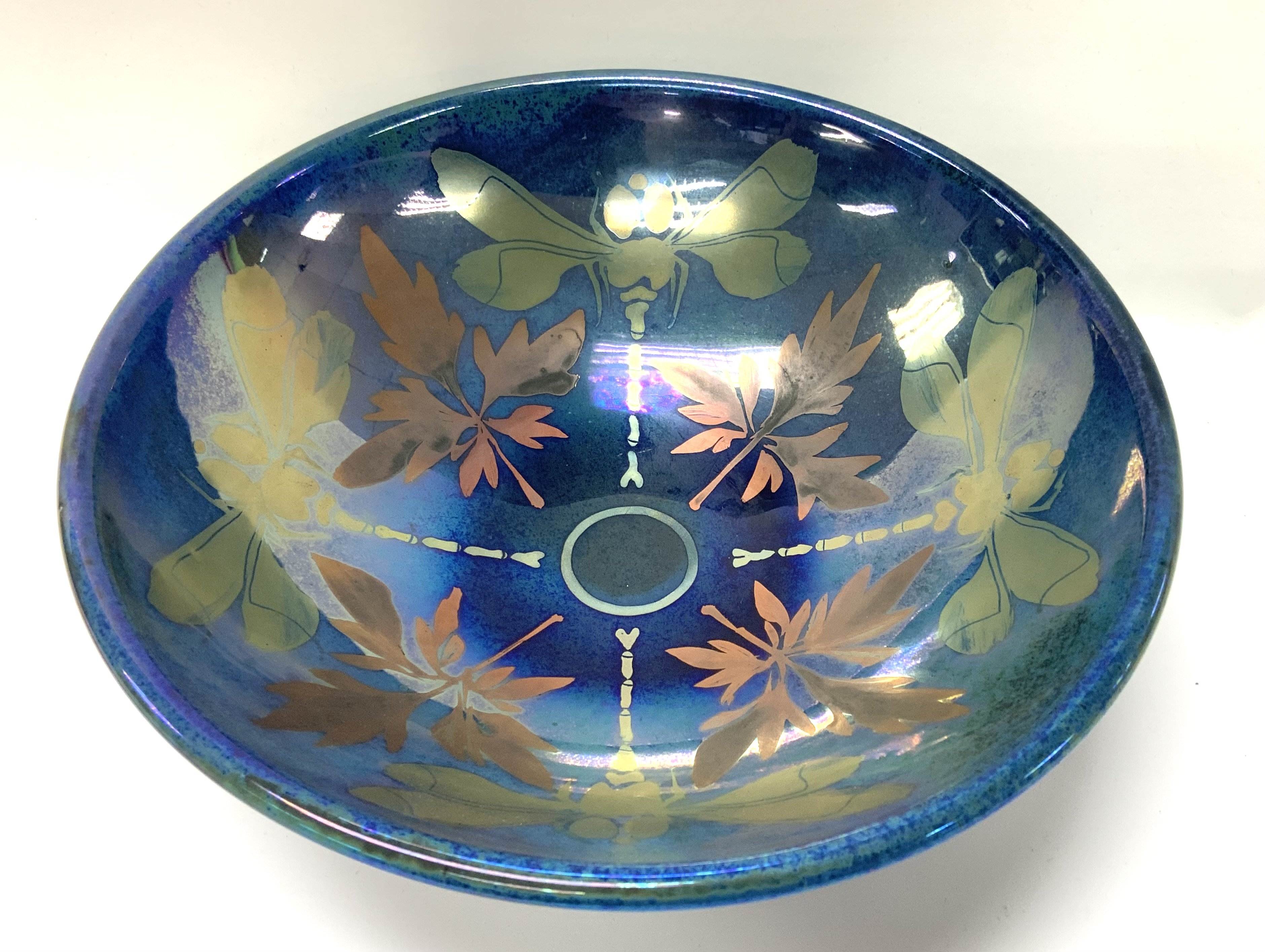 A Jonathan Chiswell-Jones lustre porcelain bowl, decorated in silver lustre with four dragonflies and foliage, Diameter 21.5cm (D)- NO RESERVE