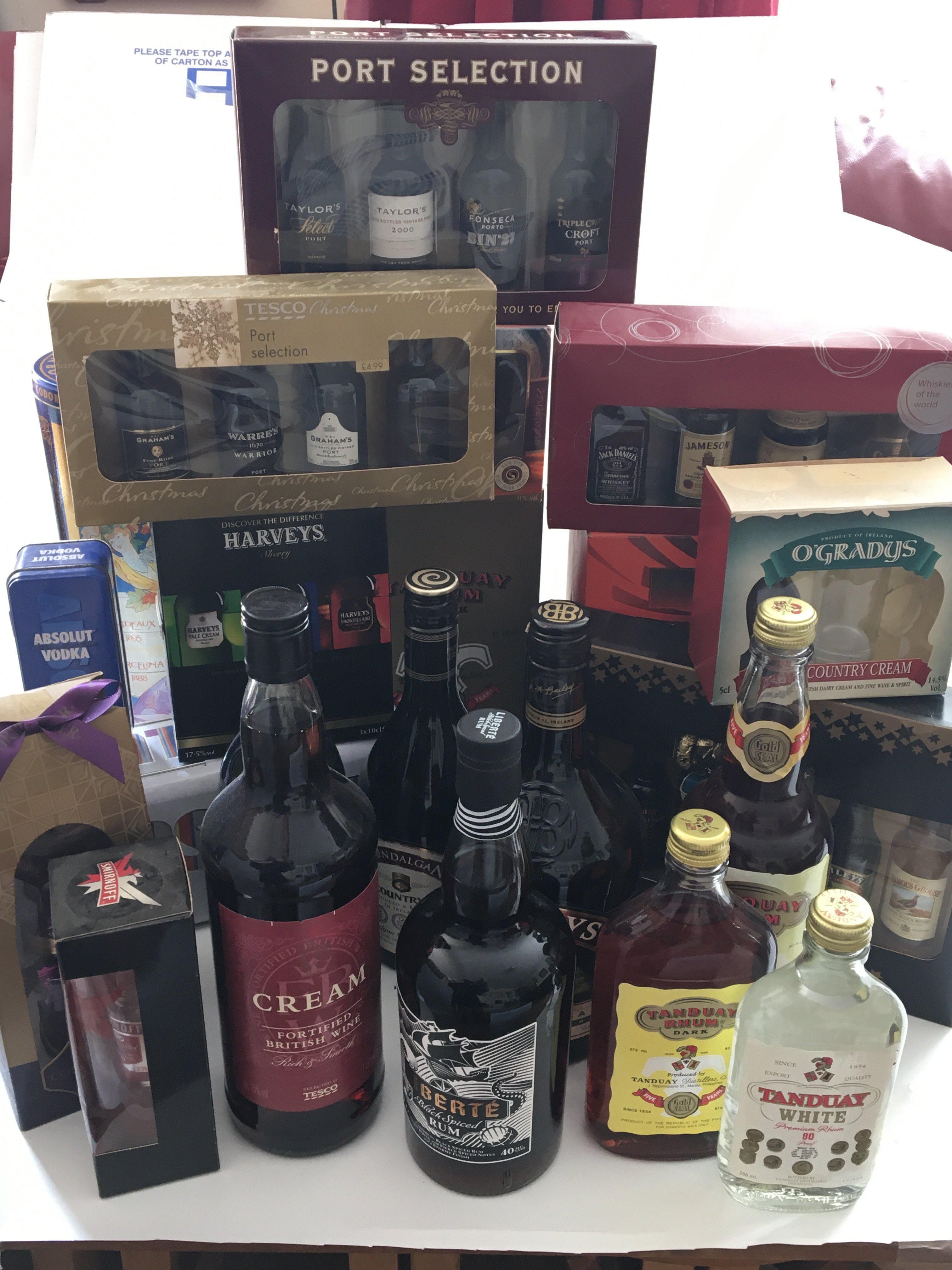 A box collection of bottles of Rum 1l and 70cl presentation boxes of small bottles of Port and other spirits including Vodka.- NO RESERVE