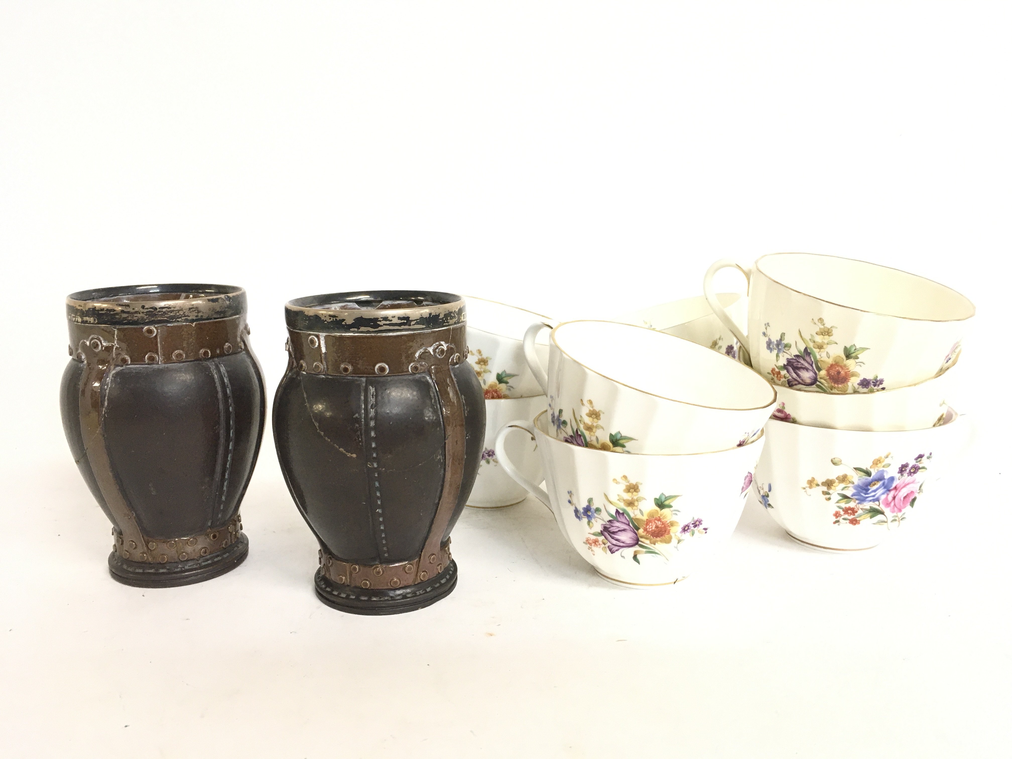 Royal Doulton Silicon vases topped with silver (some damage) and Worcester Roanoke cups. This lot cannot be posted- NO RESERVE