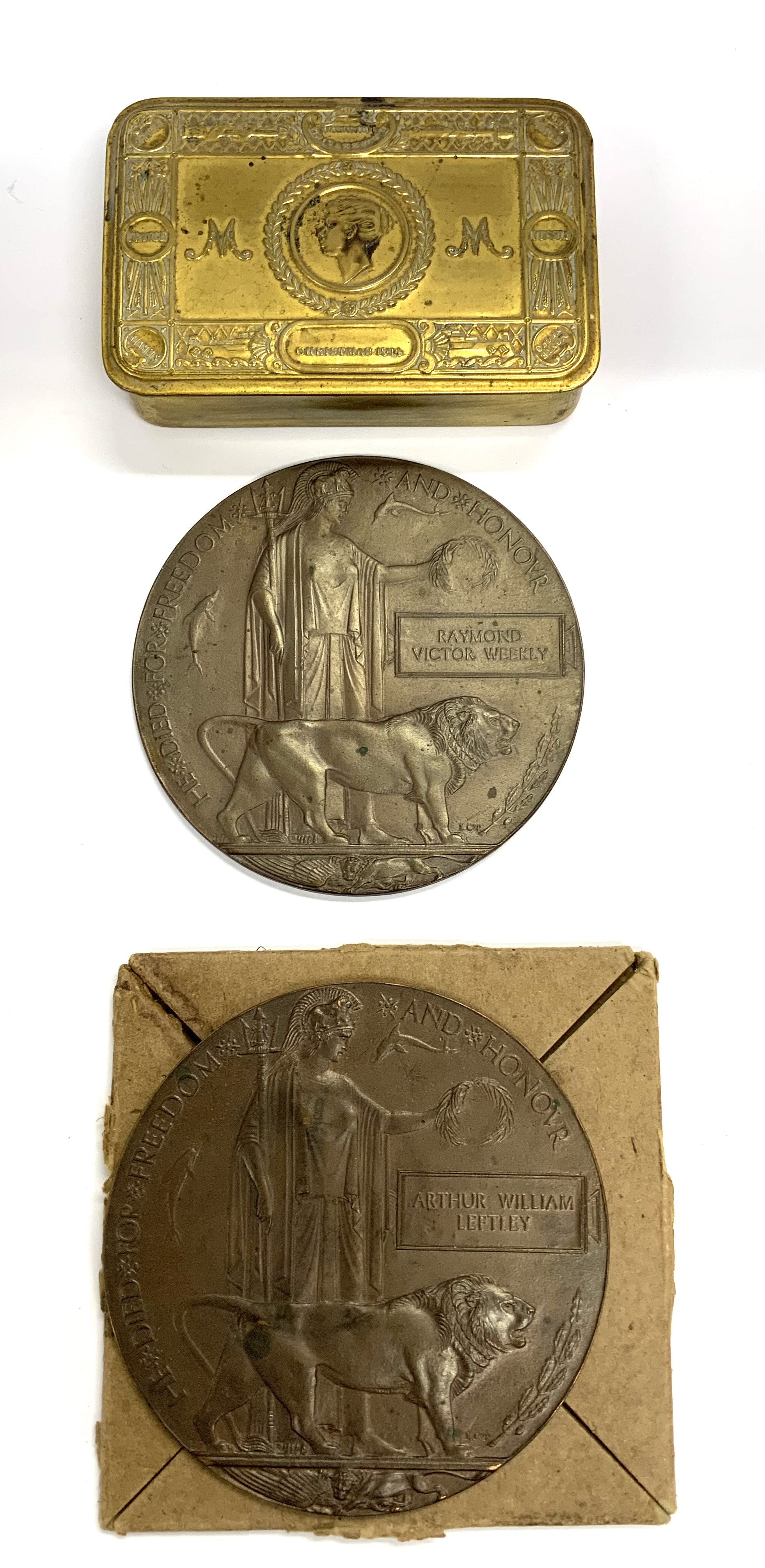 2 Bronze death plaques awarded to Arthur William Leftley and Raymond Victor Weekly together with a Queen Mary Sweet tin. (C)