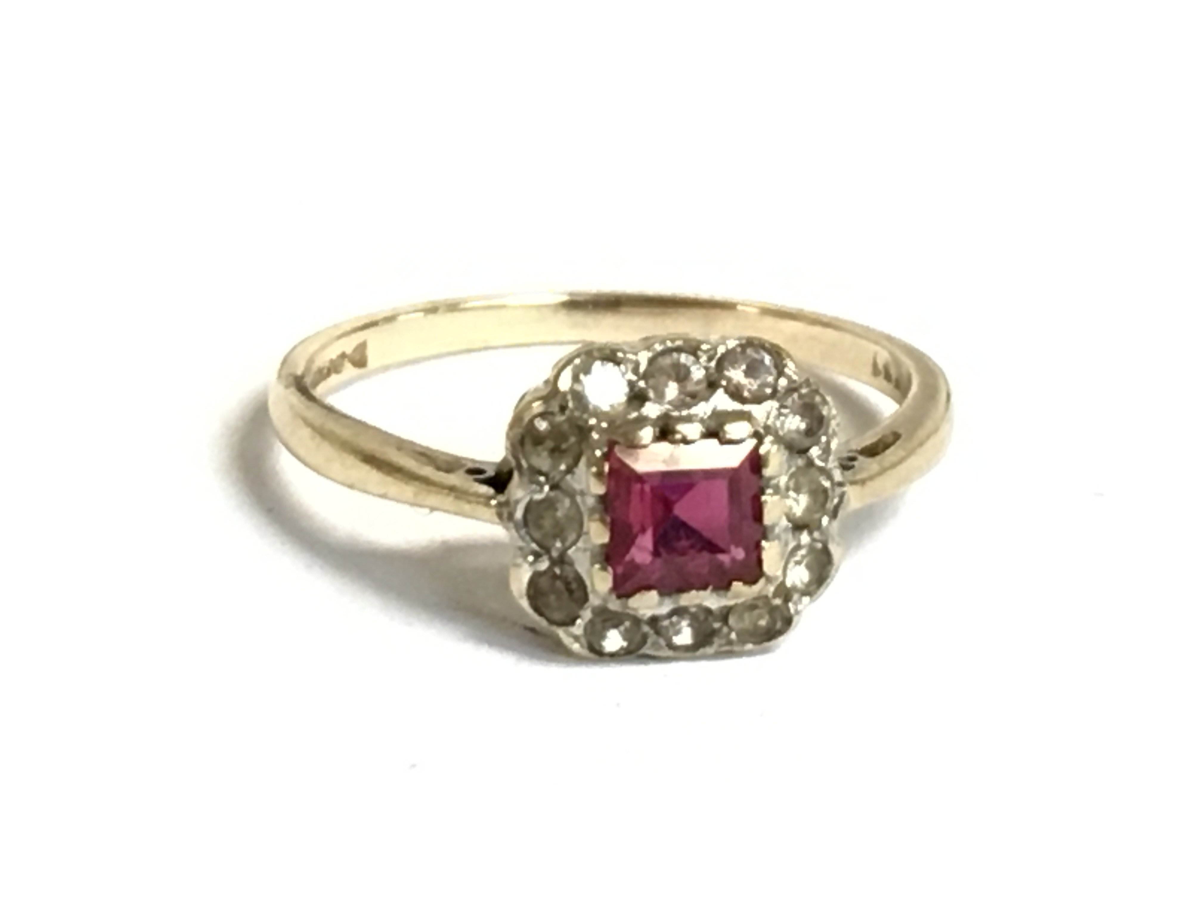 A 9ct gold ring set with a red stone and cubic zirconia stones. 2g.Size N. Postage category a