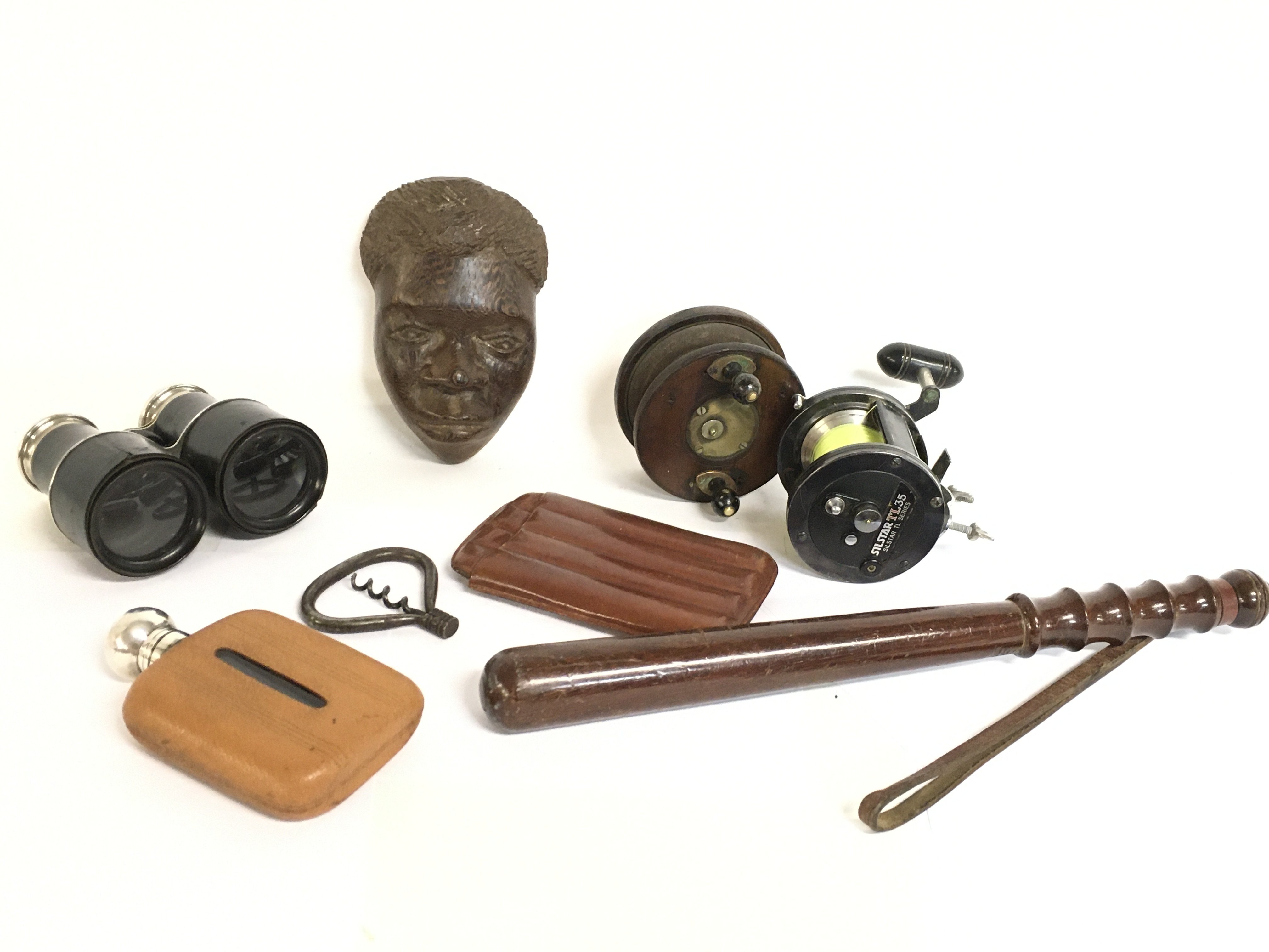 A Truncheon, vintage fishing reels including a Silstar TL35, pair of vintage black leather binoculars, wooden carved African head and a hip flask. This lot cannot be posted