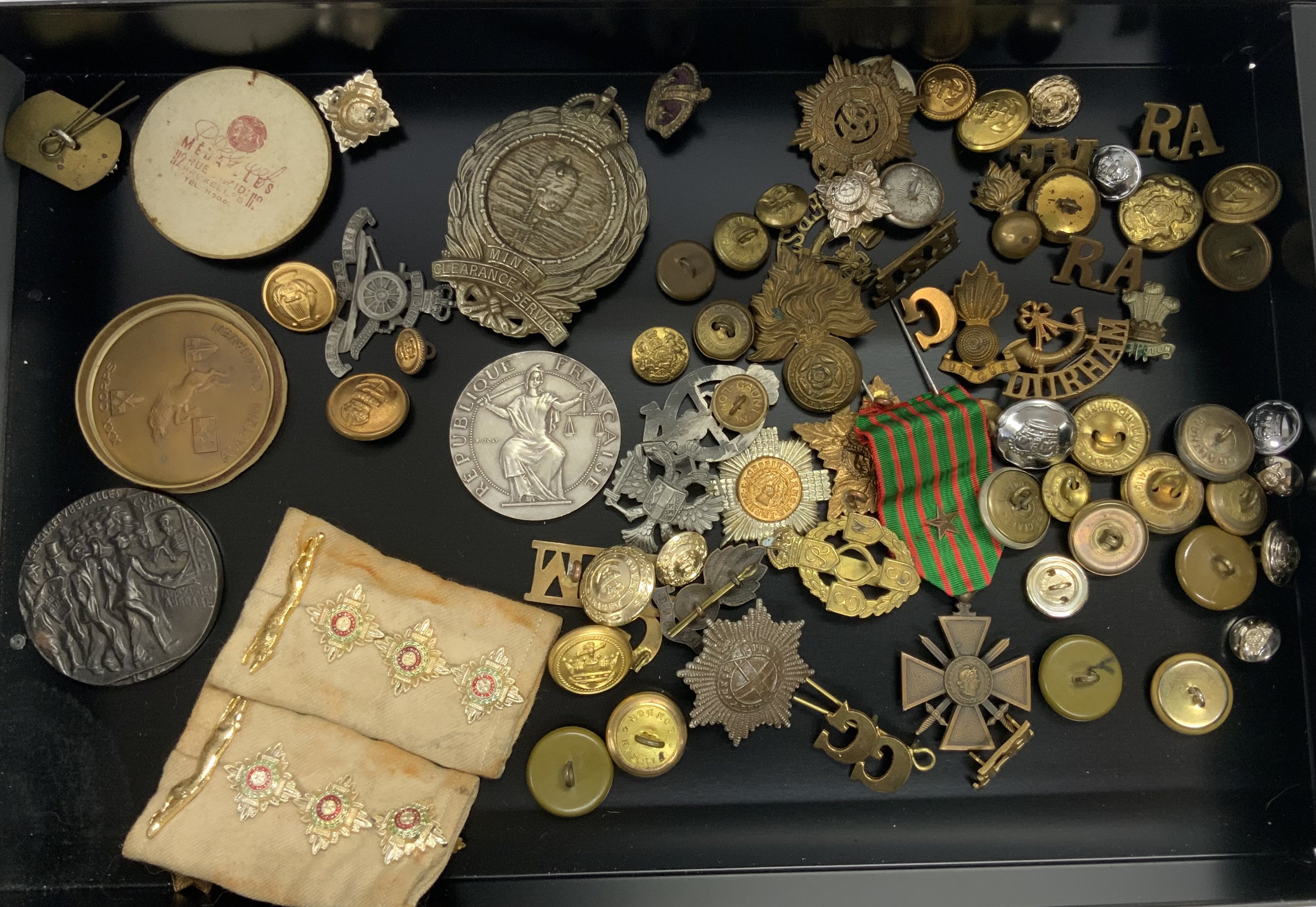 A collection of military buttons and badges including a Mine Clearance cap badge together with medallions etc. (B)